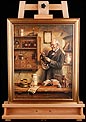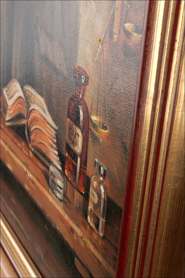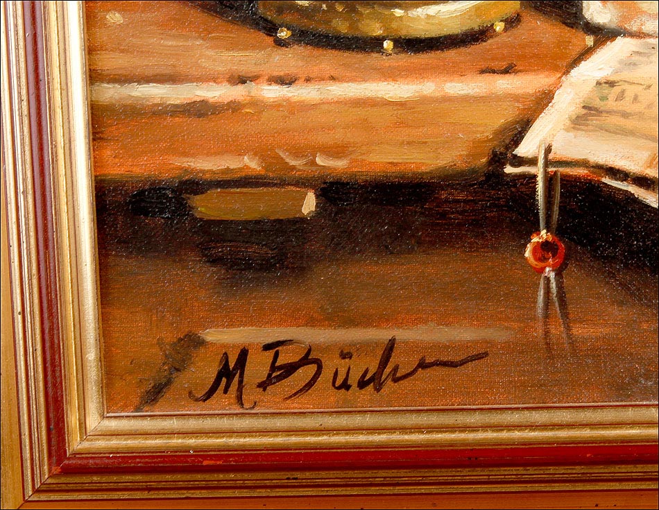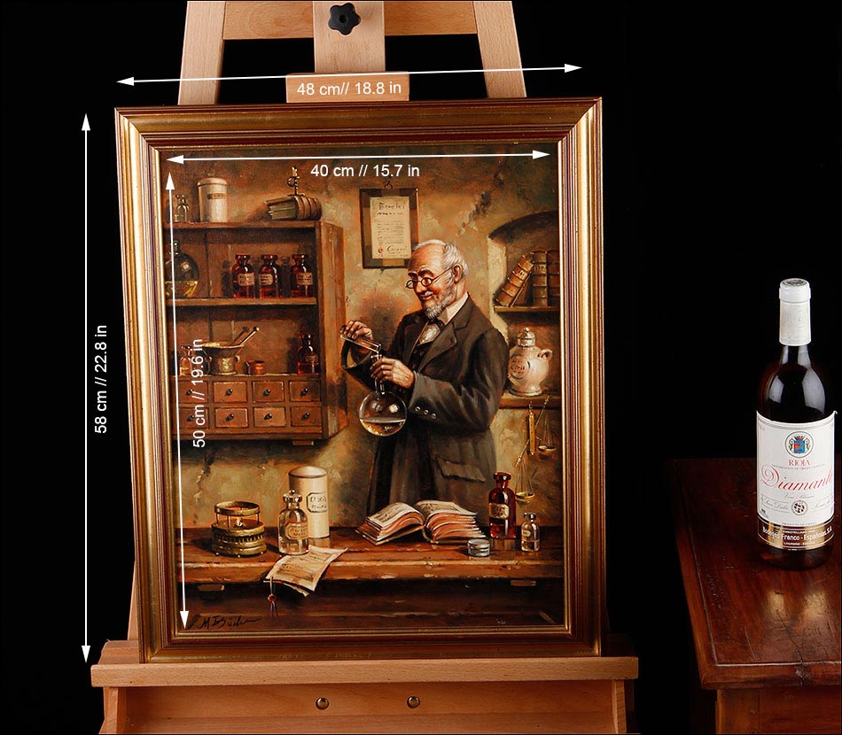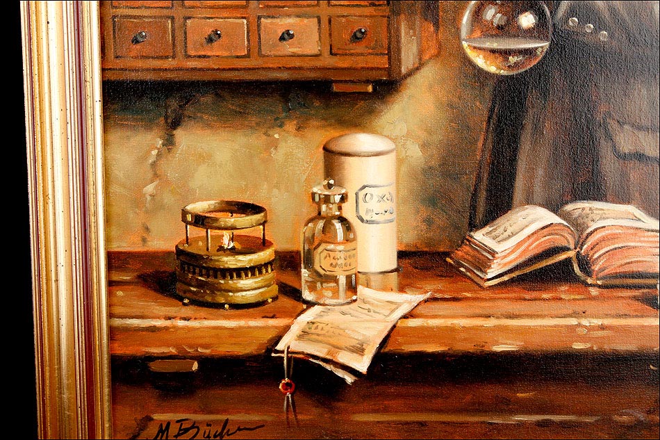 Fantástica pintura al óleo sobre lienzo titulada “El farmacéutico”, firmada por M. Bücher y fechada en los años 70 del siglo XX. El cuadro está en magníficas condiciones y destaca por la atención al detalle, la habilidad del artista y el original tratamiento del personaje. El pintor estaba especializado en imágenes que representaban las distintas profesiones, siendo este cuadro un excelente ejemplo de su obra. El lienzo es de formato cuadrado y se presenta con un precioso marco dorado con molduras, el complemento indispensable para la pintura. La firma original del autor aparece en la esquina inferior izquierda del cuadro, claramente visible.