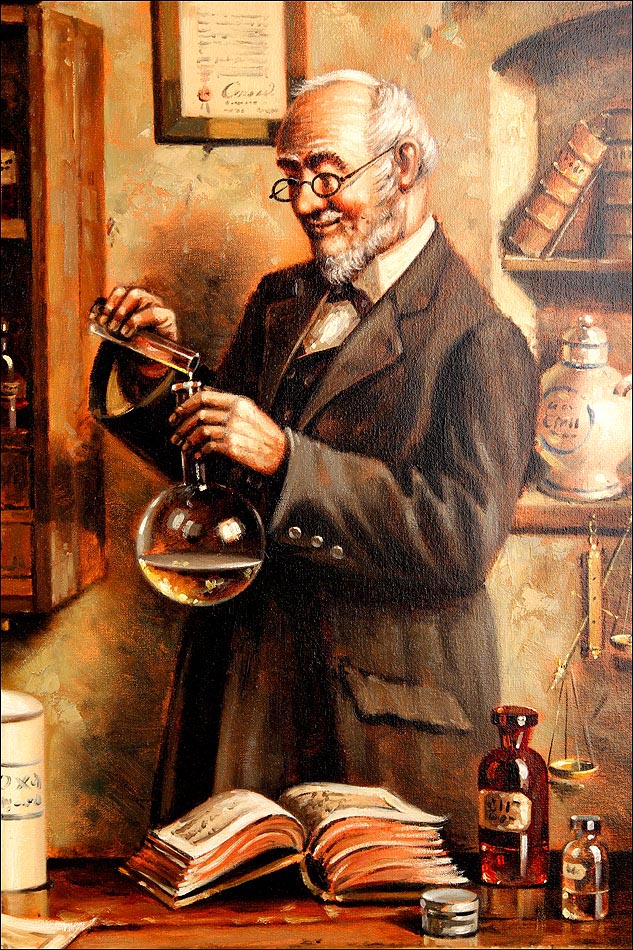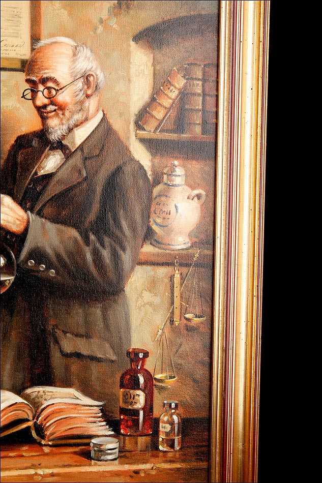 La obra muestra a un antiguo farmacéutico trabajando en su laboratorio. Por su atuendo y por el entorno que rodea al personaje, es evidente que la escena está ambientada a finales del siglo XIX. El farmacéutico está situado a la izquierda del cuadro y se encuentra vertiendo un líquido contenido dentro de una probeta dentro de un matraz. Llama la atención el rostro sonriente, a la par que concentrado, del personaje protagonista de la obra. El laboratorio es una habitación con paredes deslustradas, una gran mesa de trabajo, un mueble de pared, una estantería y el diploma que indica la profesión del personaje.