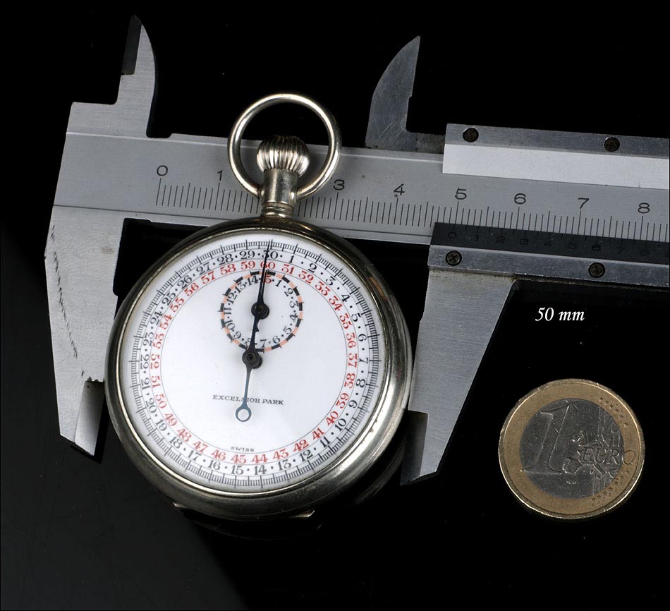 Maravilloso cronómetro mecánico Excelsior Park, fabricado en los Estados Unidos en los años 40 del siglo XX. El cronómetro funciona de maravilla y se ha revisado para garantizar un óptimo rendimiento. No es un reloj sino un cronómetro propiamente dicho, diseñado para medir tiempos. La caja es de metal plateado y está muy bien conservada, sin abolladuras ni rastros de óxido. La esfera está protegida por el cristal original y es de color blanco, con números arábigos negros y agujas en color negro y cobalto. La firma de la marca EXCELSIOR PARK aparece claramente impresa, así como la palabra SWISS, referente a la maquinaria suiza. La caja lleva tapa trasera lisa y sin decoración grabada, con número de serie en su interior. La tapa guardapolvo lleva el mismo número grabado. En la maquinaria también podemos ver grabados dos números de serie diferentes: Nº 3364 y 598851.