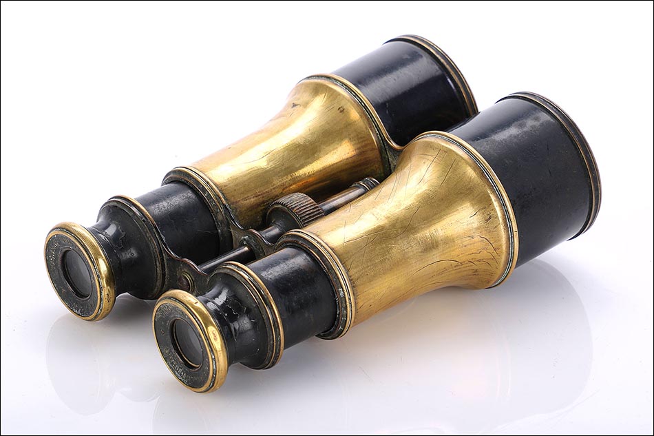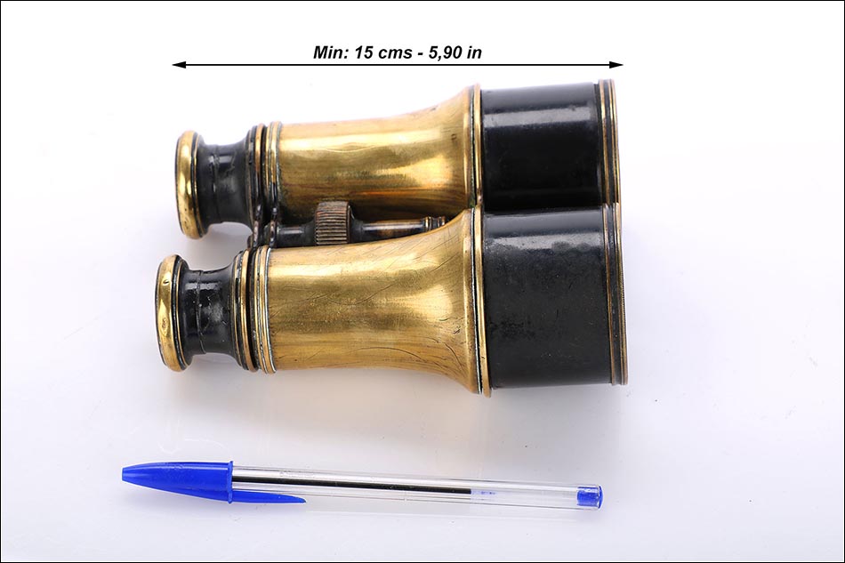 Originales prismáticos antiguos de latón, magníficamente conservados y con más de un siglo de antigüedad. Los prismáticos proceden de Génova, Italia y están datados en 1890. Llama la atención su excelente estado de funcionamiento, que permite visualizar y enfocar los objetos lejanos a la perfección. El artículo está firmado; en los oculares podemos ver el nombre y la ciudad del fabricante en claras letras en relieve: MICHELE MULTEDO – GENOVA. El cuerpo central de los prismáticos es de latón sin esmaltar, sin rastros de óxido ni deterioro importantes; conserva la laca original de época que aporta al metal esa fantástica pátina característica de los objetos de latón antiguos. El resto de las partes, salvo el borde de los oculares, aparecen esmaltadas en color negro; la laca está en muy buen estado, y su profundo tono oscuro crea un fantástico contraste con el brillo dorado del latón.