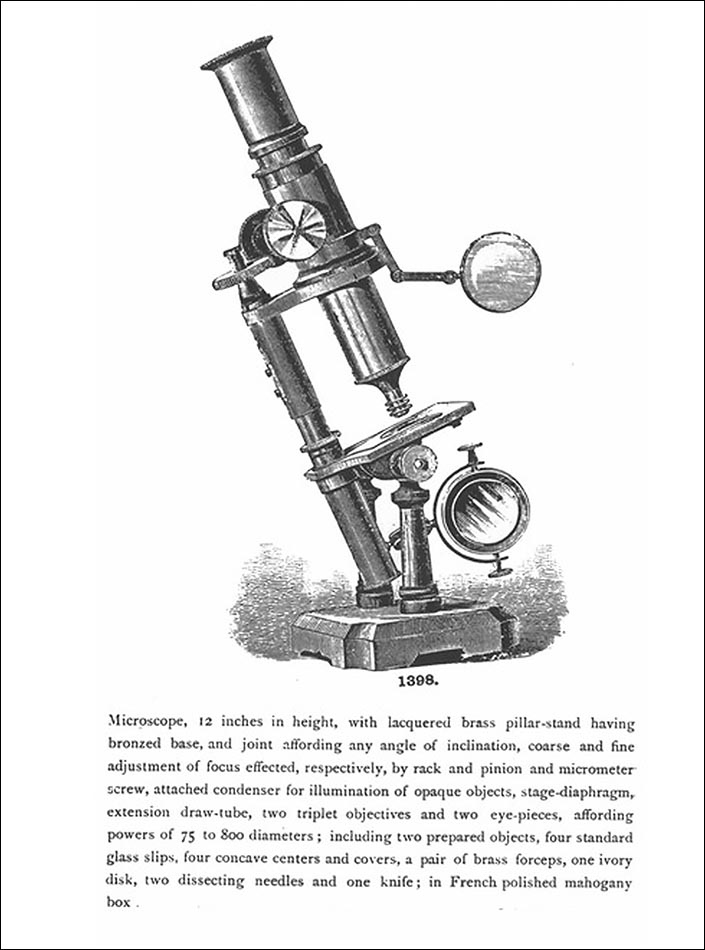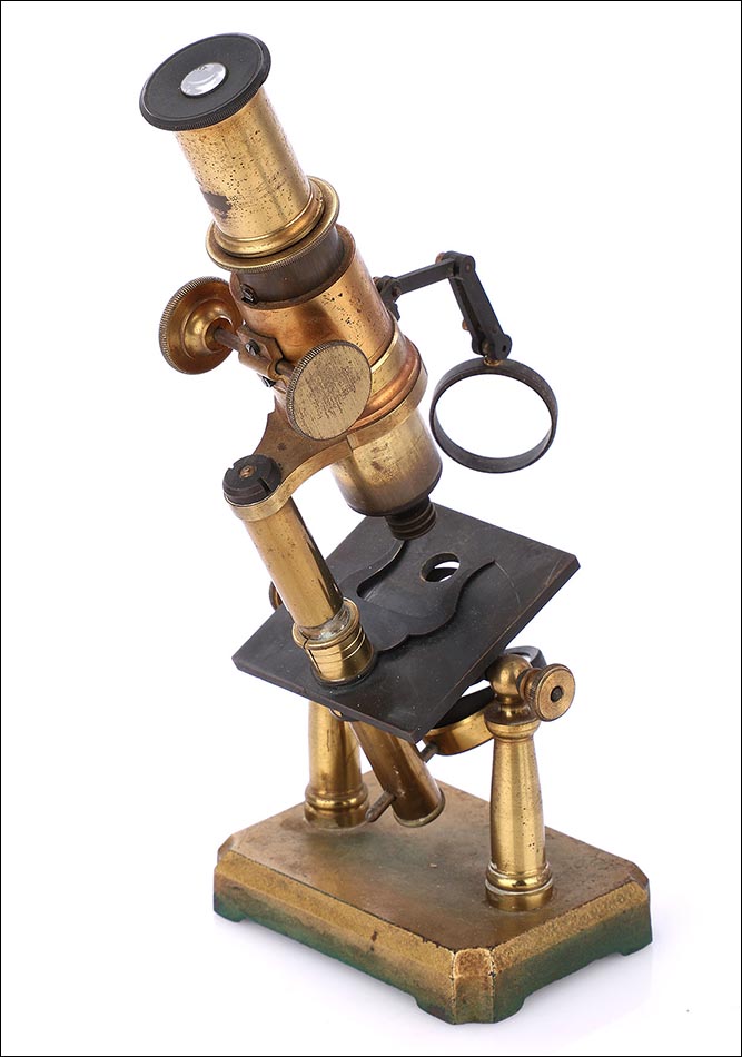 Precioso microscopio antiguo de doble pilar en muy buen estado de conservación, fabricado por la firma francesa Radiguet Opticien en el año 1875. A pesar de tener casi 150 años de antigüedad, el microscopio conserva todas sus piezas y componentes originales y se encuentra en estado de funcionamiento. Llama la atención su atractivo y sencillo diseño, sólido y funcional, con todo el carisma y la personalidad de los aparatos de investigación científica empleados en el siglo XIX. El microscopio es de latón e incluye algunas piezas de hierro esmaltado en negro. La base es un grueso rectángulo de latón sobre la que se alza el instrumento, apoyado sobre dos gruesos pilares laterales que le aportan estabilidad.