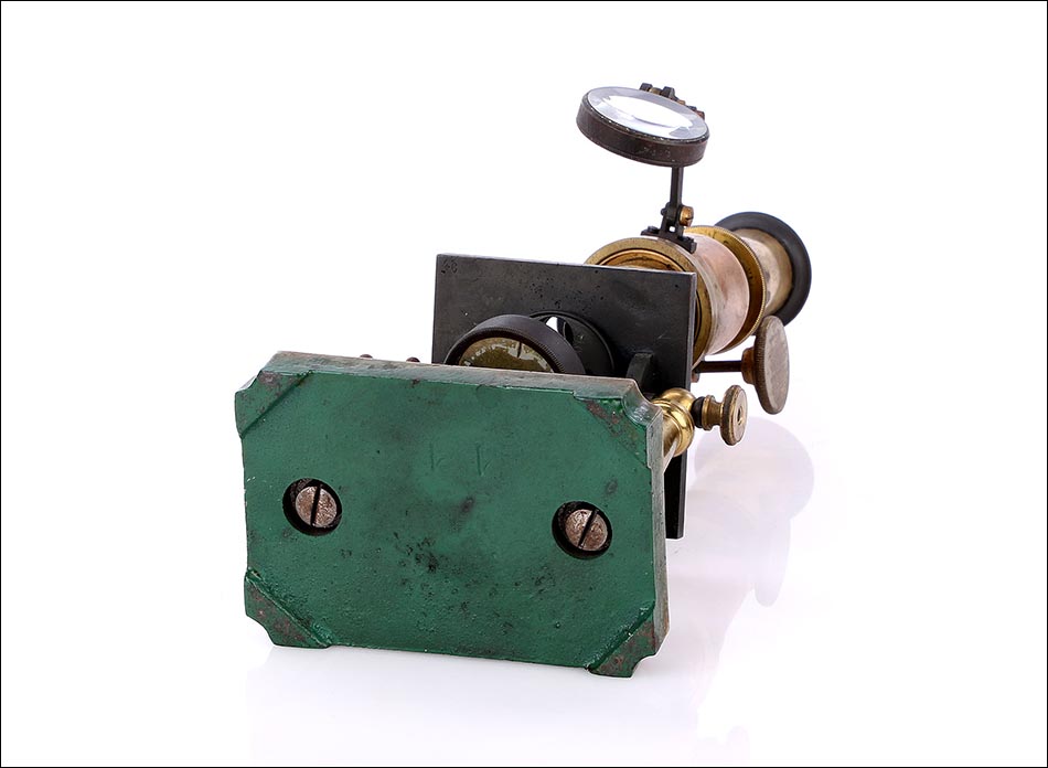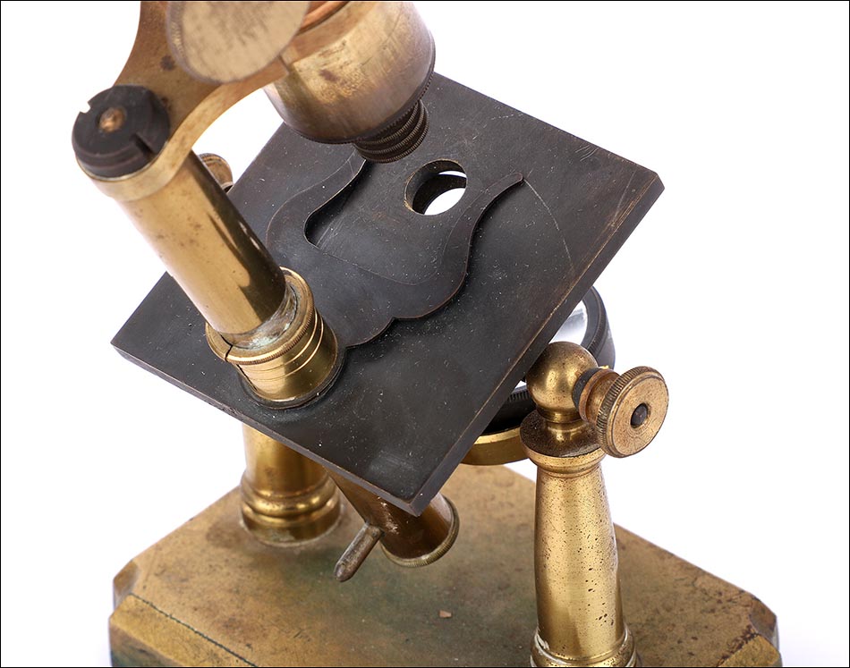 Los dos pilares mencionados van conectados a unas piezas móviles que permiten mover el microscopio para captar mejor la luz y facilitar su manejo. La pletina de muestras va unida a la pieza que sostiene la torre; conectada a la parte frontal de esta podemos ver la lupa de concentración de luz, unida a un brazo articulado. En la pletina de muestras, una delicada pieza de hierro esmaltado en negro con forma de lira sirve para sujetar las placas de vidrio en su lugar. Bajo ella encontramos el diafragma y el espejo doble oscilante, original de época y en muy buen estado de conservación.