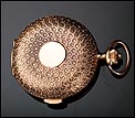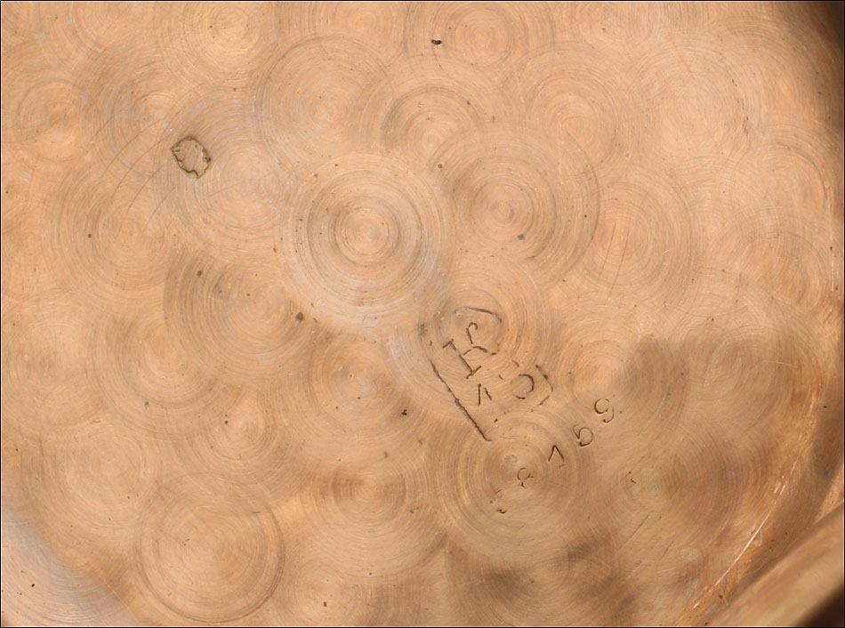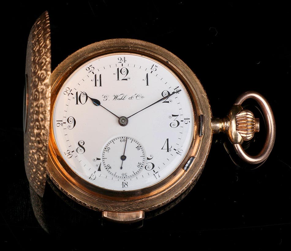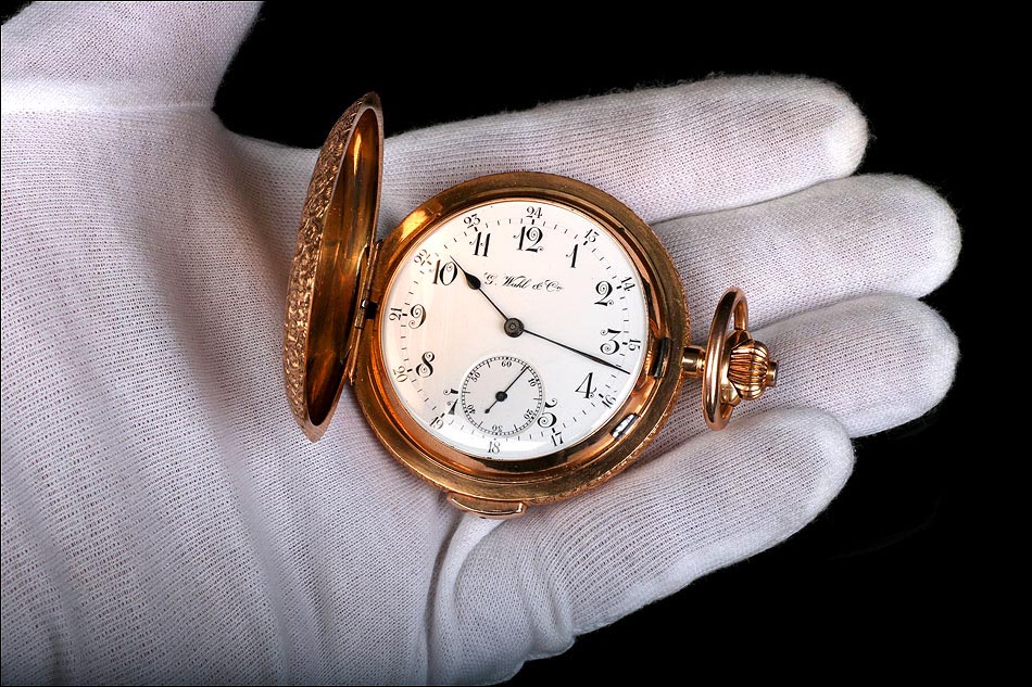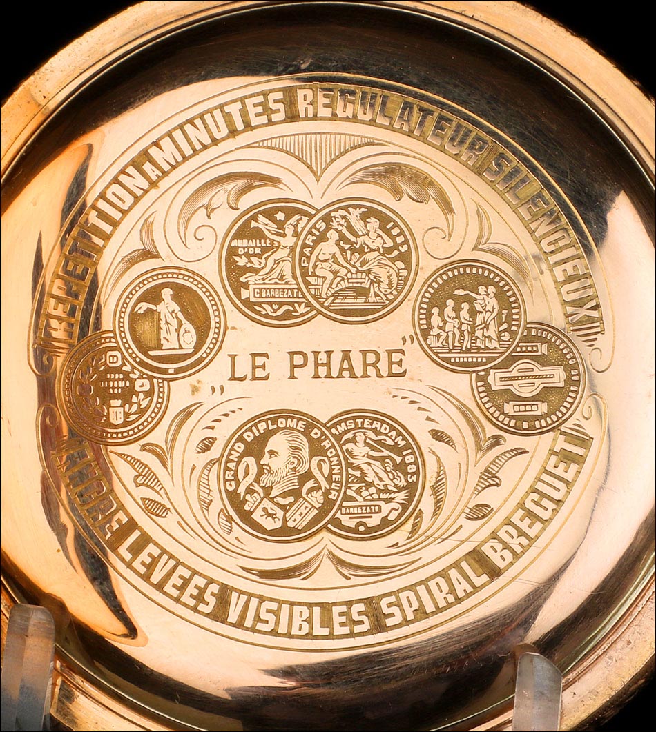 La tapa delantera lleva grabado el selo 18K en su interior, junto con parte del número de serie (159) y el contraste. Bajo ella, la bella esfera blanca muestra numeración arábiga en negro y agujas rectas y lisas con diseño de pera (poire). Lleva segundero a las 6 y está firmada por G. Walth & Cie. La tapa trasera lleva en su interior los mismos contrastes y sellos, acompañados del número de serie completo: 58159. Bajo ella, la tapa guardapolvo está profusamente grabada con el nombre de LE PHARE las medallas otorgadas a la firma relojera. Si levantamos esta tapa, encontraremos la delicada maquinaria protegida por un cristal.