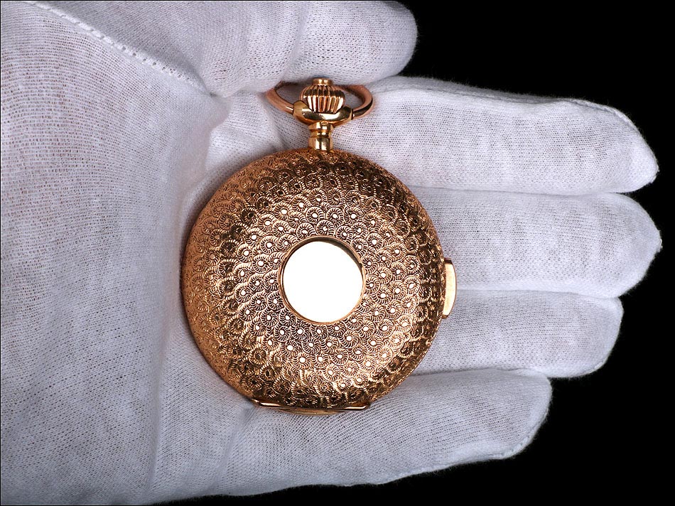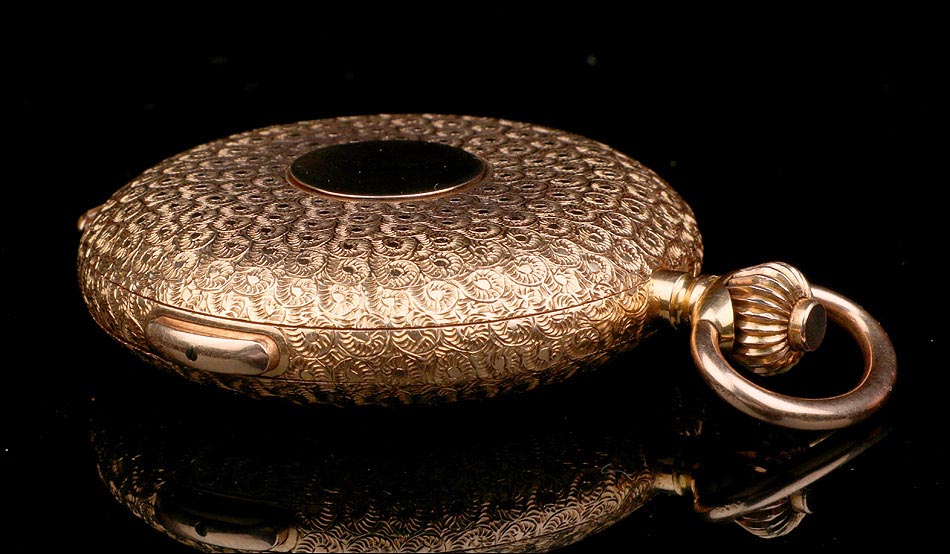 Impresionante reloj de bolsillo antiguo firmado por Le Phare y con caja de oro de 18K. El reloj fue fabricado en suiza a principios del siglo XX y es de una belleza fuera de serie, encontrándose además en magníficas condiciones. La maquinaria se ha revisado para garantizar un funcionamiento óptimo del reloj, que añade a su precioso diseño y su antigüedad el encanto de su sonería a minutos. La caja de oro lleva tres tapas grabadas; la delantera y la trasera están decoradas con un delicado diseño, formado por diminutas espirales. La tapa delantera tiene un círculo liso en el centro para grabar las iniciales del propietario.