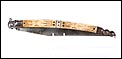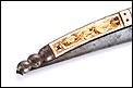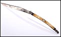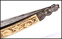 Los motivos están realizados dejando el hueso en tono más claro y oscureciendo las zonas de alrededor. El resultado recuerda a la marquetería sobre madera, siendo muy elegante y delicado. Los cintillos de nácar o madreperla natural que separan las placas de hueso están en perfectas condiciones; están unidos a las bases de acero mediante pequeños remaches. Las bases de las cachas llevan pequeñas líneas paralelas a modo de discreta decoración. La hoja es también de acero y está magníficamente conservada: cuando está abierta conforma un arma temible, pero también muy decorativa.