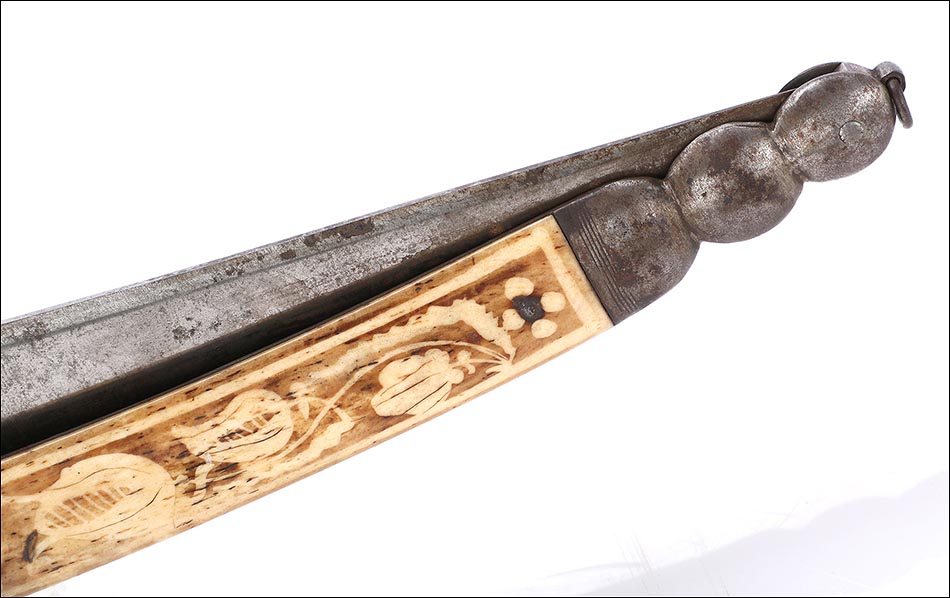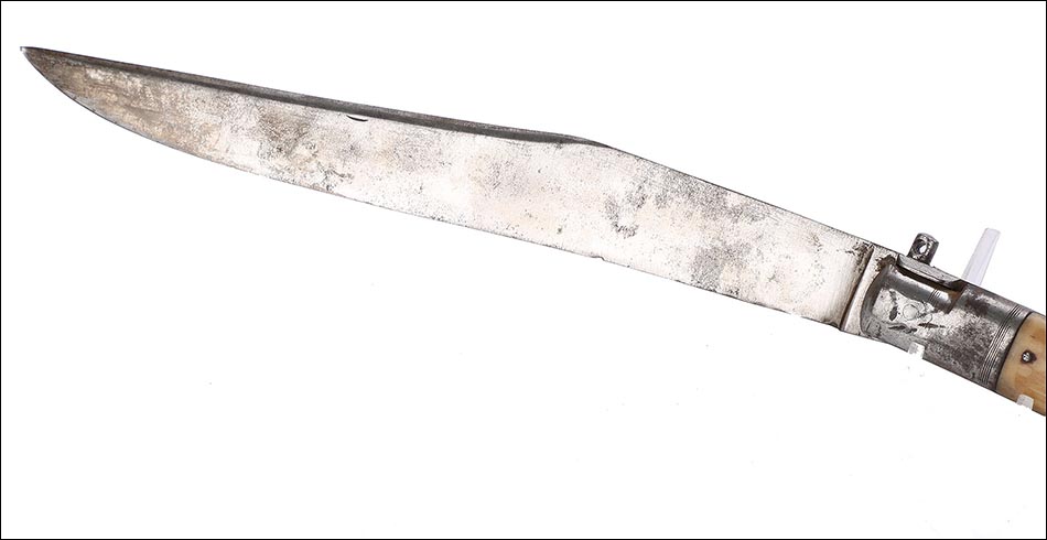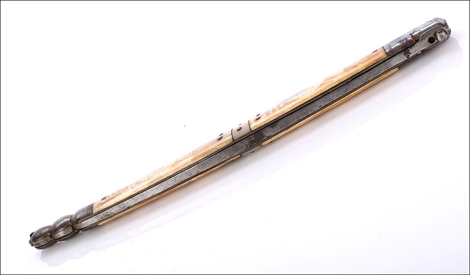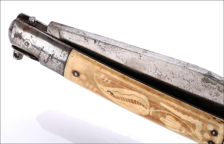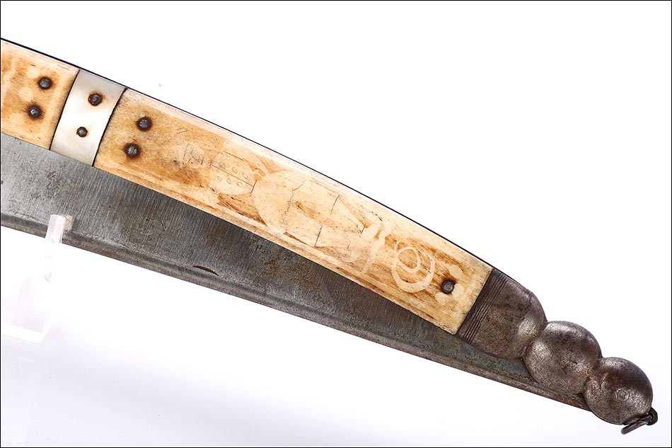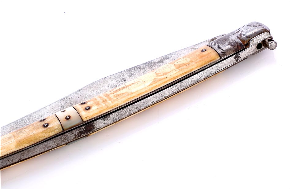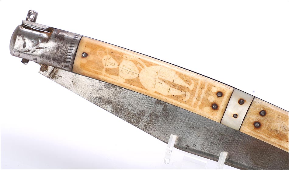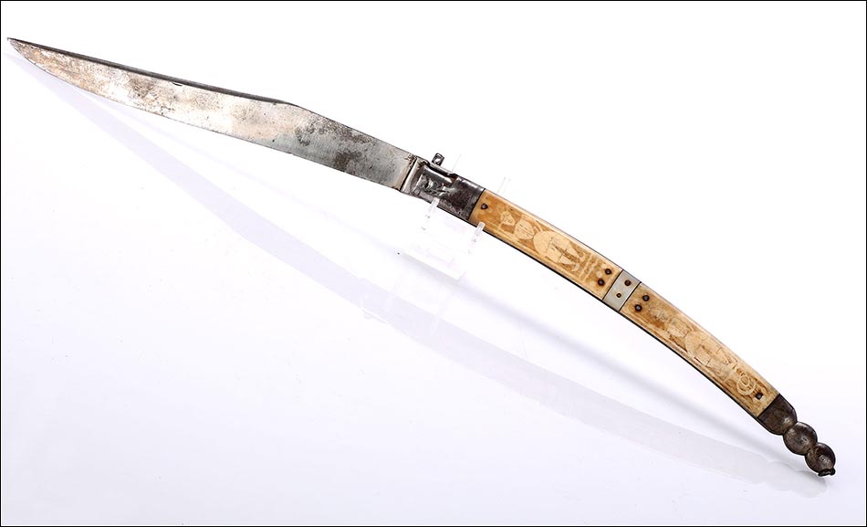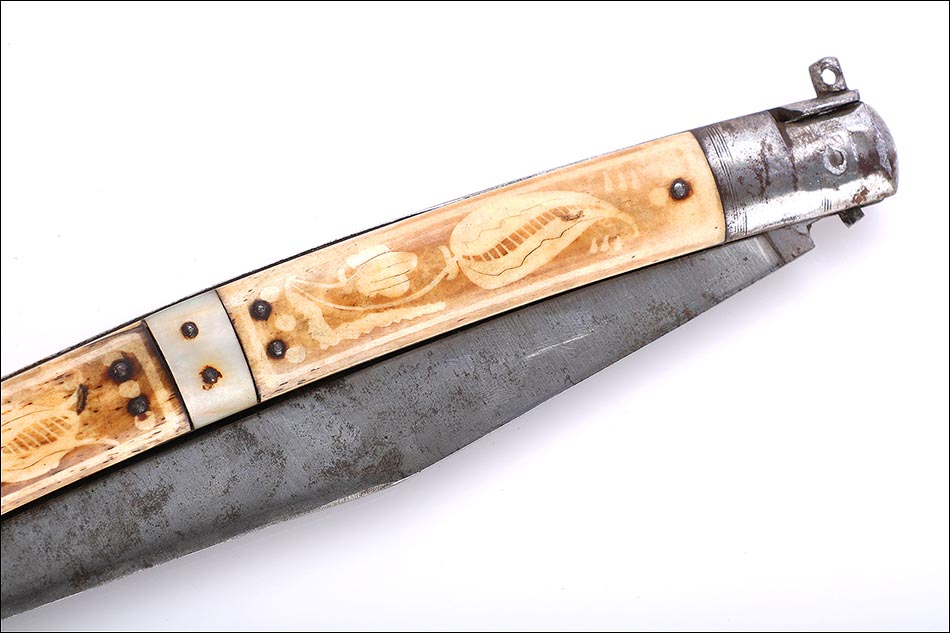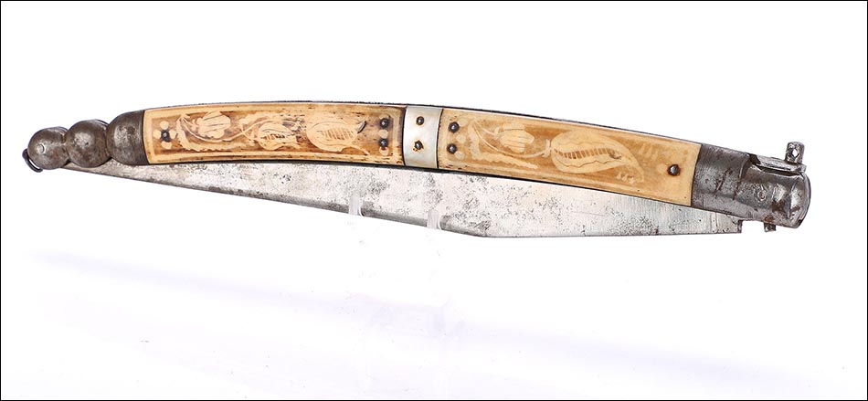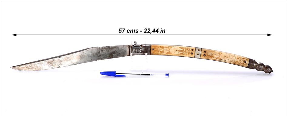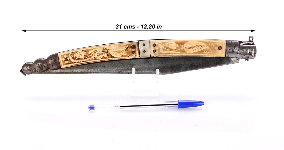 Espectacular navaja antigua de gran tamaño, con cachas de hueso decoradas a mano y detalles de nácar. Una vez desplegada la hoja, la navaja alcanza una longitud total de 57 cm y se convierte en una impresionante arma blanca de fuerte personalidad. La navaja procede de la región francesa de Châtellerault y está fechada a mediados del siglo XIX (1850). Por tanto, se trata de una pieza muy antigua que ha llegado a nosotros en excelentes condiciones. Conserva todas sus partes y detalles y se encuentra en muy buen estado: las partes metálicas muestran una fina pátina de antigüedad, que añade interés y originalidad a la navaja sin restarle ni un poco de su gran atractivo.