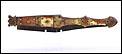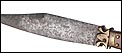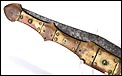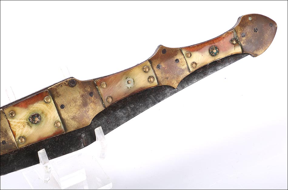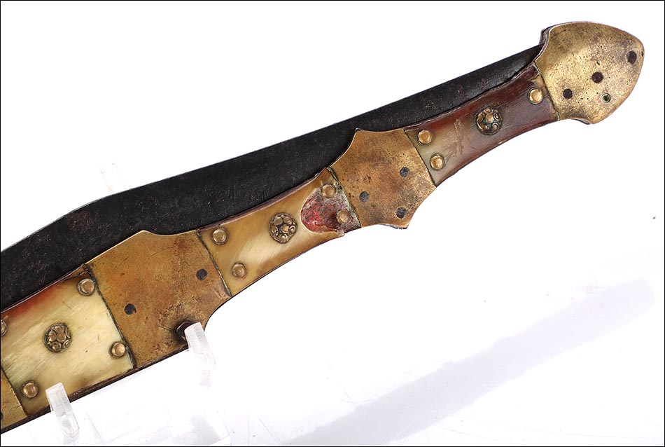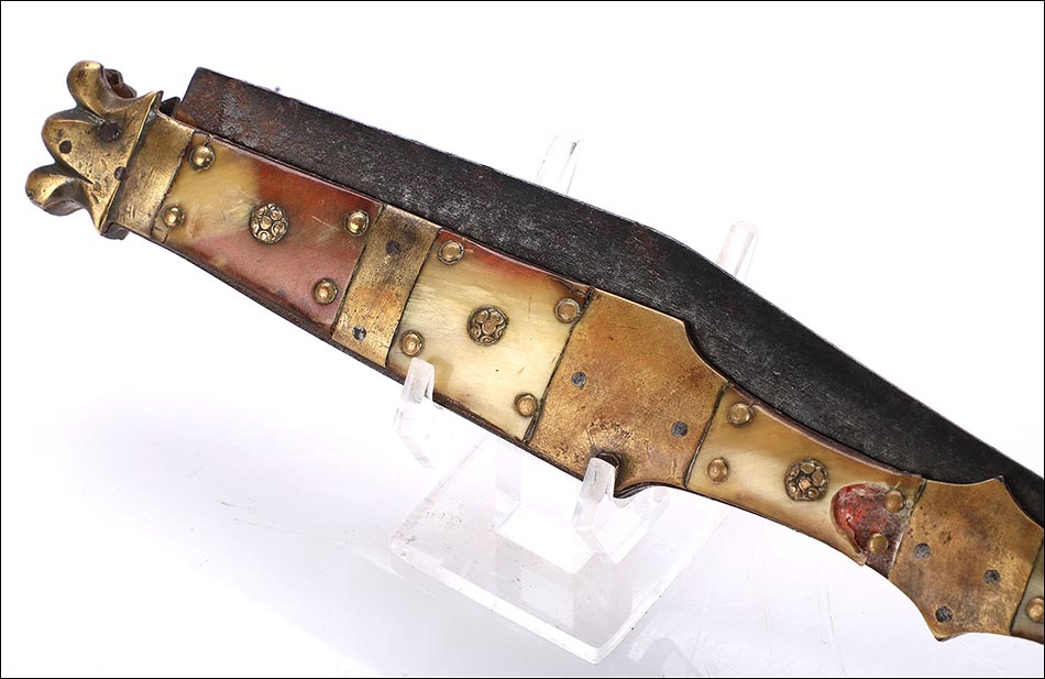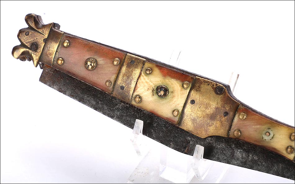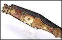 Las piezas de asta muestran una amplia gama de preciosos colores que van desde el blanco marfil hasta el marrón rojizo. Los tonos se reparten de manera caprichosa, creando bellos contrastes y dibujos orgánicos y naturales. Separando estas piezas de asta hay varias piezas de latón; de latón son también los atractivos remaches que fijan y embellecen las cachas. La hoja, por su parte, tiene una hermosa forma estilizada y puntiaguda. La firma VALERO JUN ZARAGOZA aparece claramente grabada en el metal.