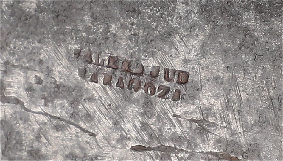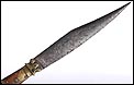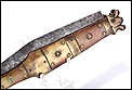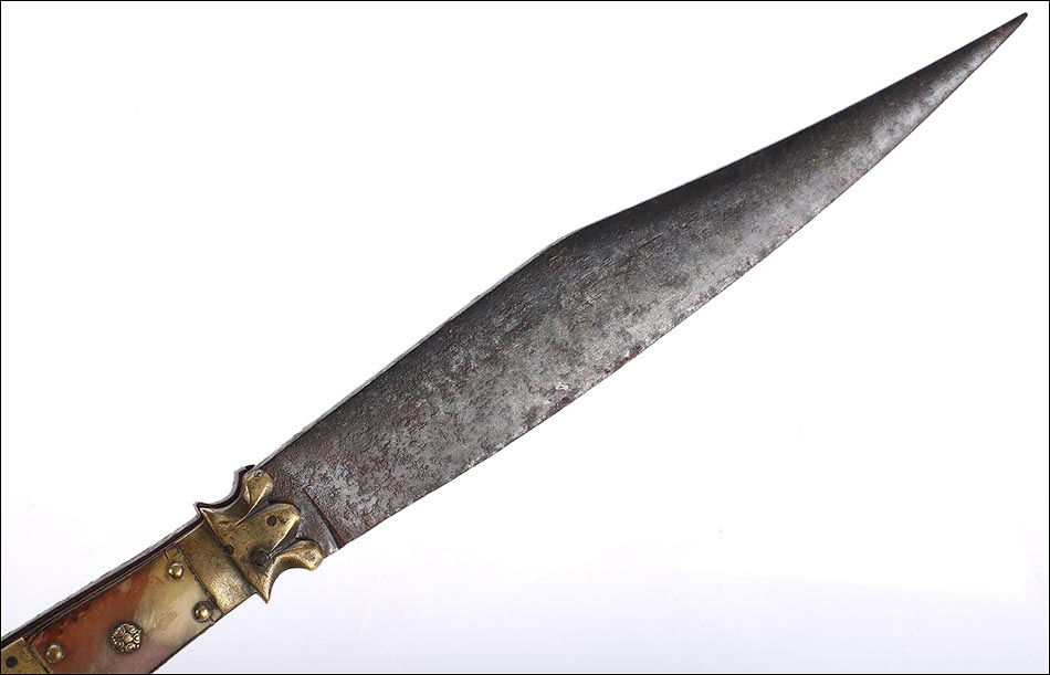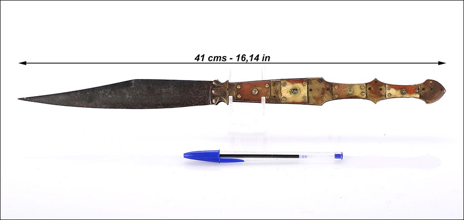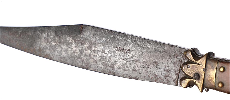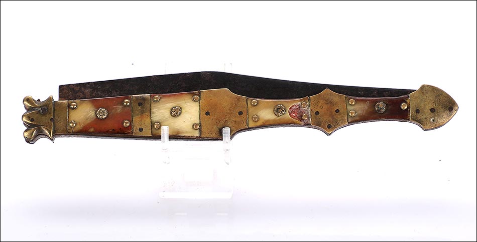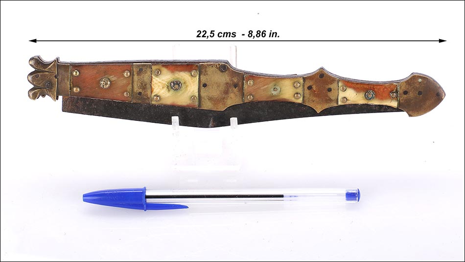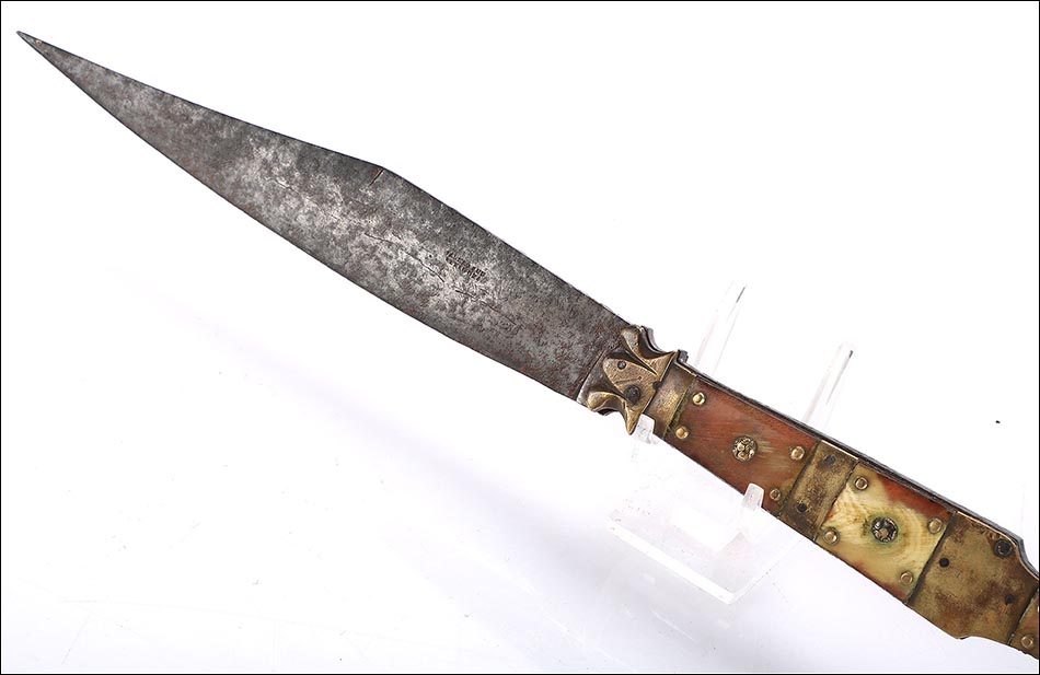Impresionante navaja antigua en buen estado de conservación, muy bella y de gran tamaño. La navaja está firmada por Valero Jun, Zaragoza, y está fechada a mediados del siglo XIX (1850). Este arma llama la atención por sus hermosas cachas, fabricadas en asta y latón, y por su gran hoja: una vez desplegada hace que la navaja alcance los 41 cm de longitud. La hoja está completa en todo su tamaño y las cachas conservan la hermosa decoración, original de época. La empuñadura tiene una bella forma recortada y simétrica, muy estilizada y que facilita su agarre. La base de metal está profusamente decorada con piezas de latón y asta, muy bien conservadas.