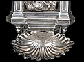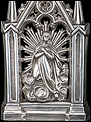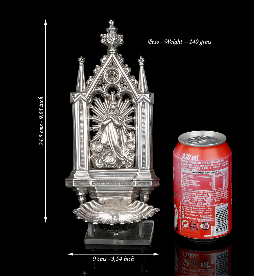 Bella benditera antigua de plata maciza realizada en España a principios del siglo XX. Se encuentra en muy buen estado de conservación. Las benditeras son utensilios contenedores de agua bendita, destinadas en este caso al uso doméstico. La que vemos en las imágenes es de plata maciza 100%; no lleva contrastes visibles. La benditera llama la atención por su precioso diseño, que reproduce un templete de estilo neogótico bajo el cual aparece la figura radiante de la Virgen María ascendiendo al Cielo sobre un grupo de nubes. La Virgen está rodeada de rayos de luz que emergen alrededor. Sobre el templete se alzan dos pináculos laterales, con una bonita pieza de remate en la cúspide central. Bajo la figura, el amplio depósito para el agua bendita tiene forma de vieira.