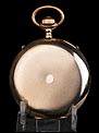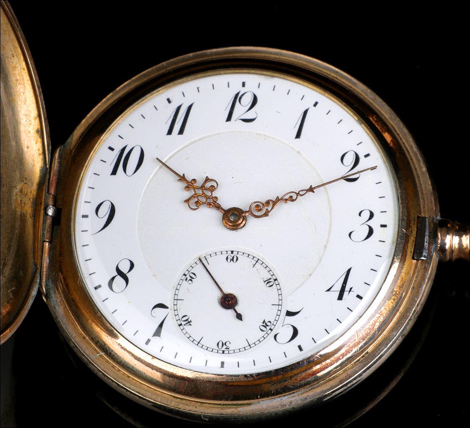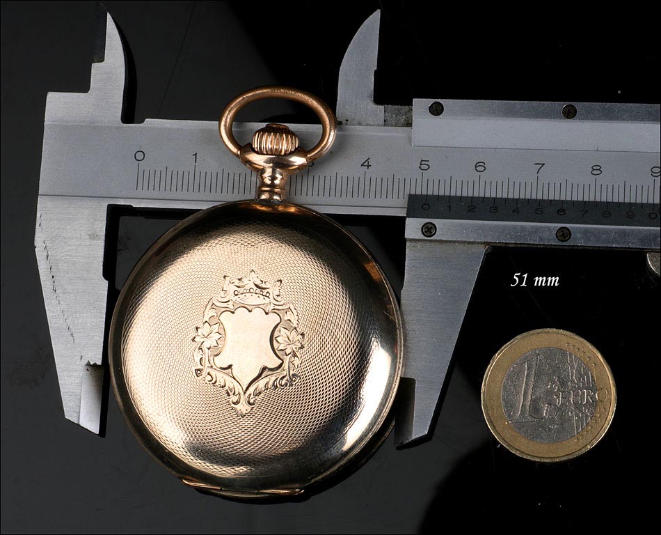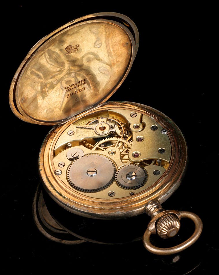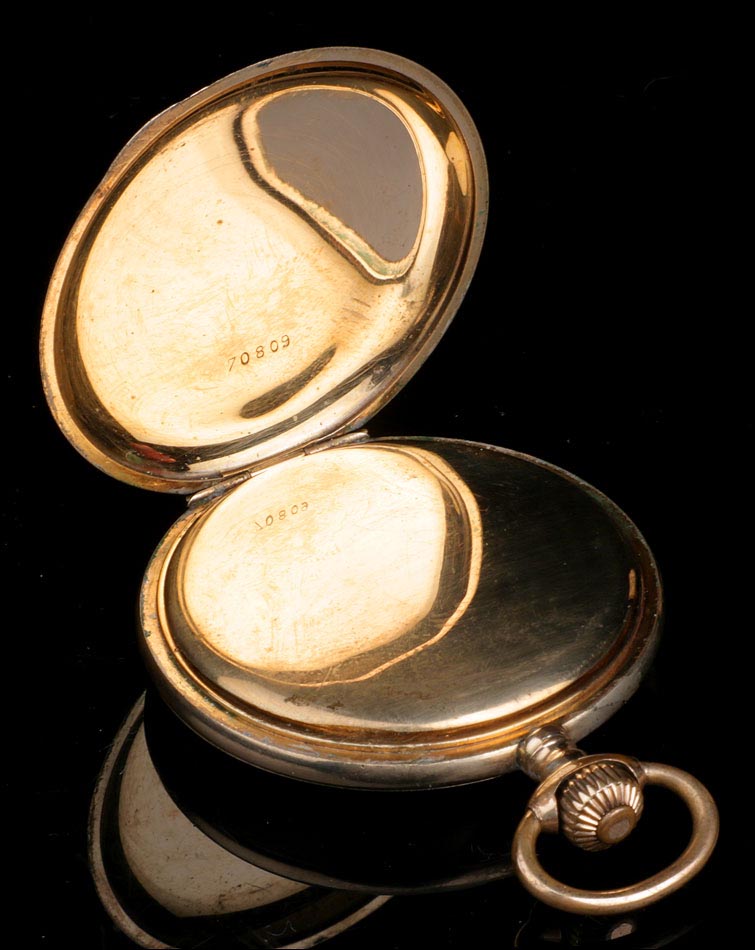 Bello reloj de bolsillo antiguo con caja chapada en oro, muy bien conservado y funcionando a la perfección. El reloj tiene maquinaria Suiza y está fechado circa 1910. El chapado en oro que recubre la caja se encuentra en excelentes condiciones; por su parte, la maquinaria se ha revisado y a día de hoy muestra un funcionamiento excelente. La caja del reloj tiene tapa delantera con grabado en guilloché grano de avena y escudo central sin grabar, apto para poner las iniciales del propietario y rodeado de hojas y detalles realizados a mano. La tapa trasera lleva la misma decoración, en su caso sin el escudo. En el interior de la tapa delantera aparece grabado el número de serie 70809, que se repite en la tapa guardapolvo. En esta también podemos ver un león grabado en el metal. La esfera blanca con números arábigos negros lleva delicadas manecillas de metal dorado estilo Luis XV.