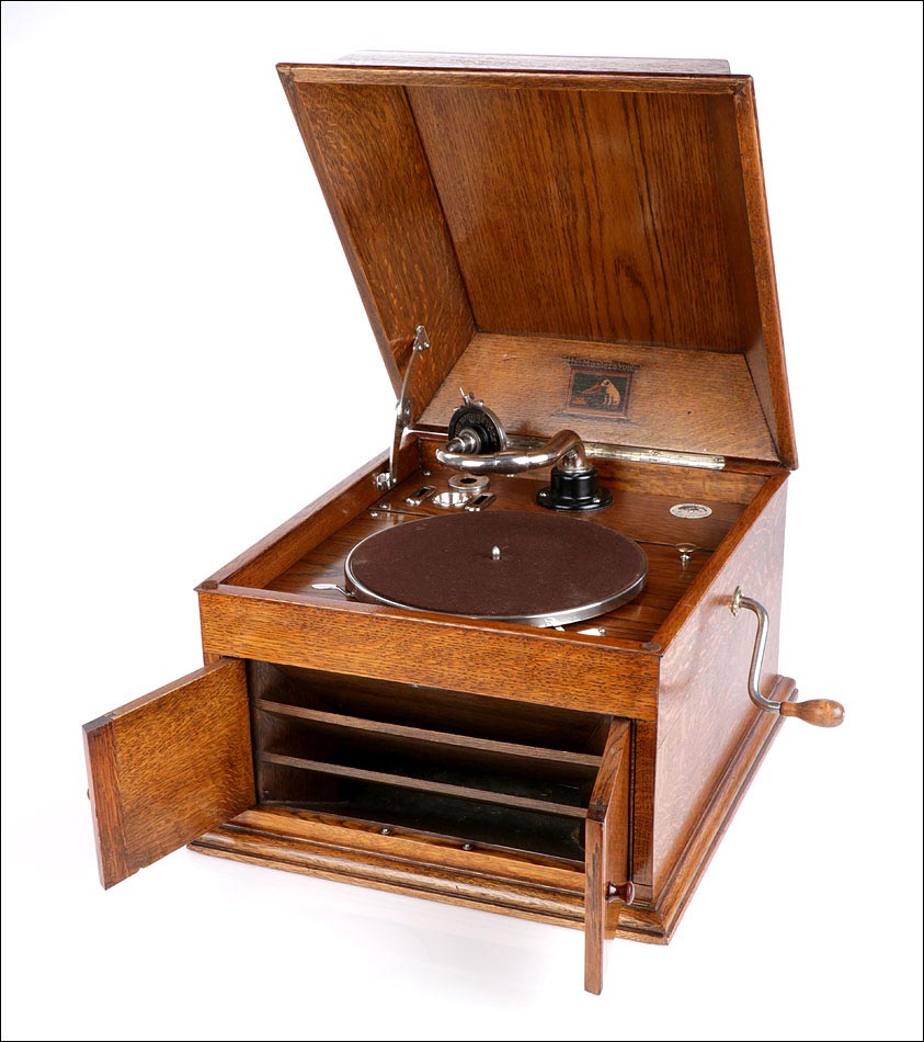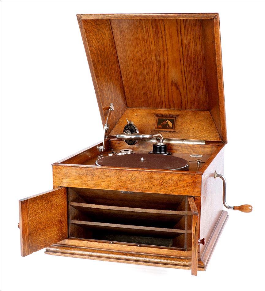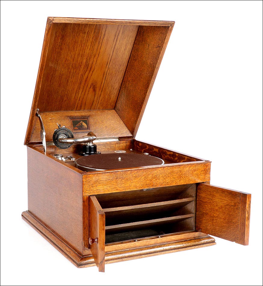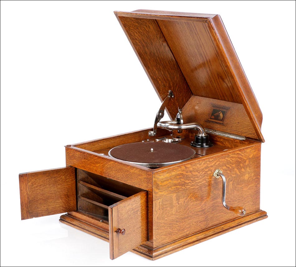 Bellísimo gramófono antiguo de sobremesa La Voz de Su Amo Modelo 103, fabricado en Inglaterra en los años 30 del siglo XX. El gramófono muestra un sobrio diseño muy del estilo de la época, con caja realizada en madera de roble. La madera muestra un aspecto espectacular, con el precioso color dorado y la marcada veta típica de la especie y el barnizado a muñequilla original de época. El barniz ha sido cuidadosamente restaurado para mostrar el impecable aspecto que vemos en las fotografías. El motor del gramófono también se ha limpiado y puesto a punto, de manera que a día de hoy funciona a la perfección y reproduce los discos con un sonido realmente maravilloso.