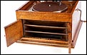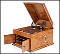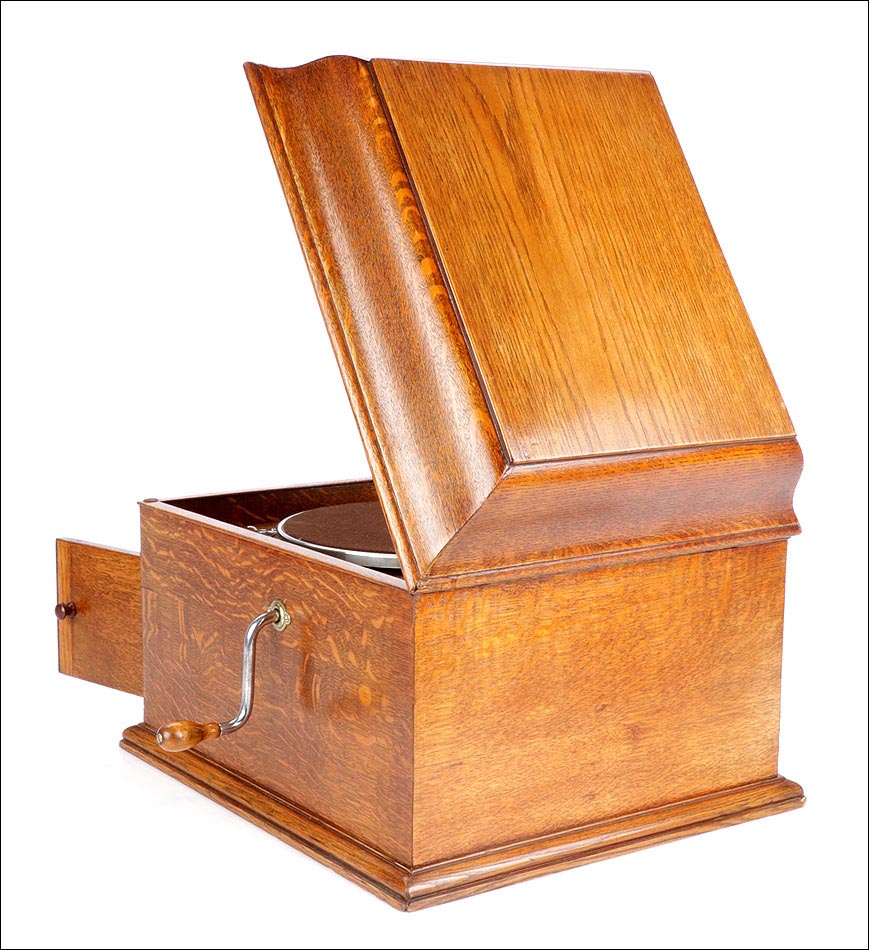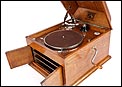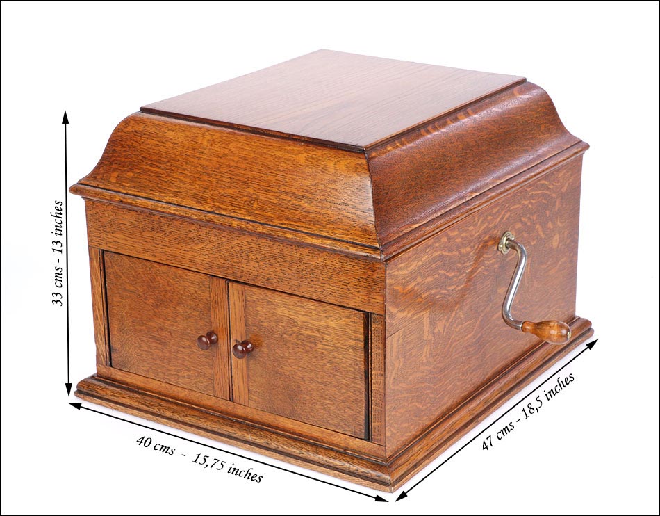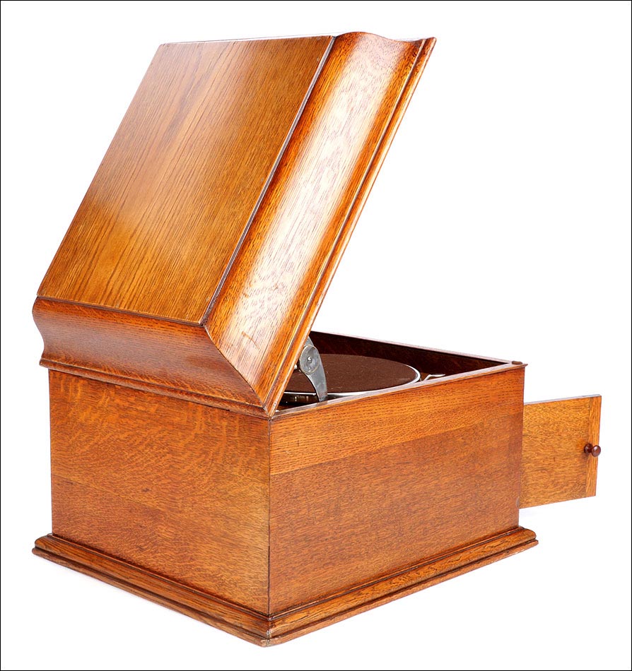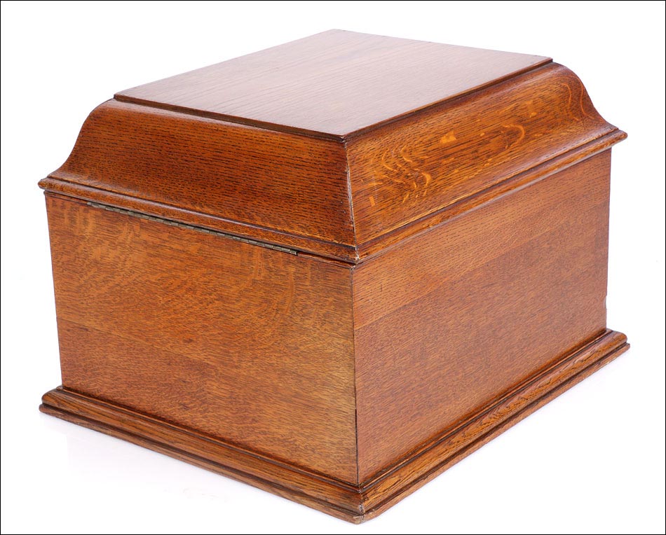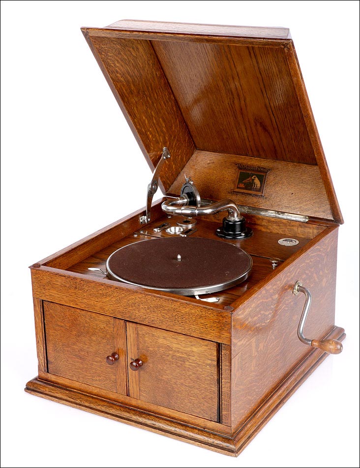 Bellísimo gramófono antiguo de sobremesa La Voz de Su Amo Modelo 103, fabricado en Inglaterra en los años 30 del siglo XX. El gramófono muestra un sobrio diseño muy del estilo de la época, con caja realizada en madera de roble. La madera muestra un aspecto espectacular, con el precioso color dorado y la marcada veta típica de la especie y el barnizado a muñequilla original de época. El barniz ha sido cuidadosamente restaurado para mostrar el impecable aspecto que vemos en las fotografías. El motor del gramófono también se ha limpiado y puesto a punto, de manera que a día de hoy funciona a la perfección y reproduce los discos con un sonido realmente maravilloso.
