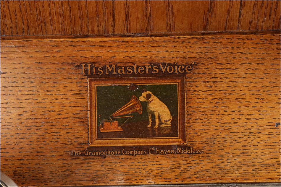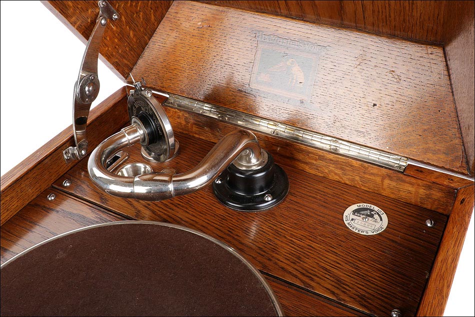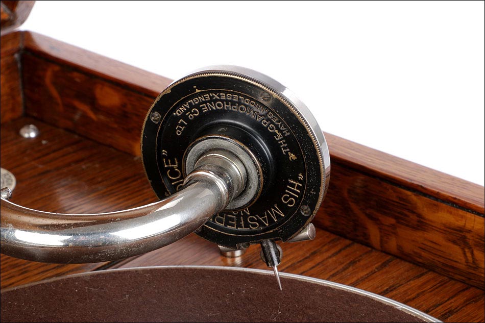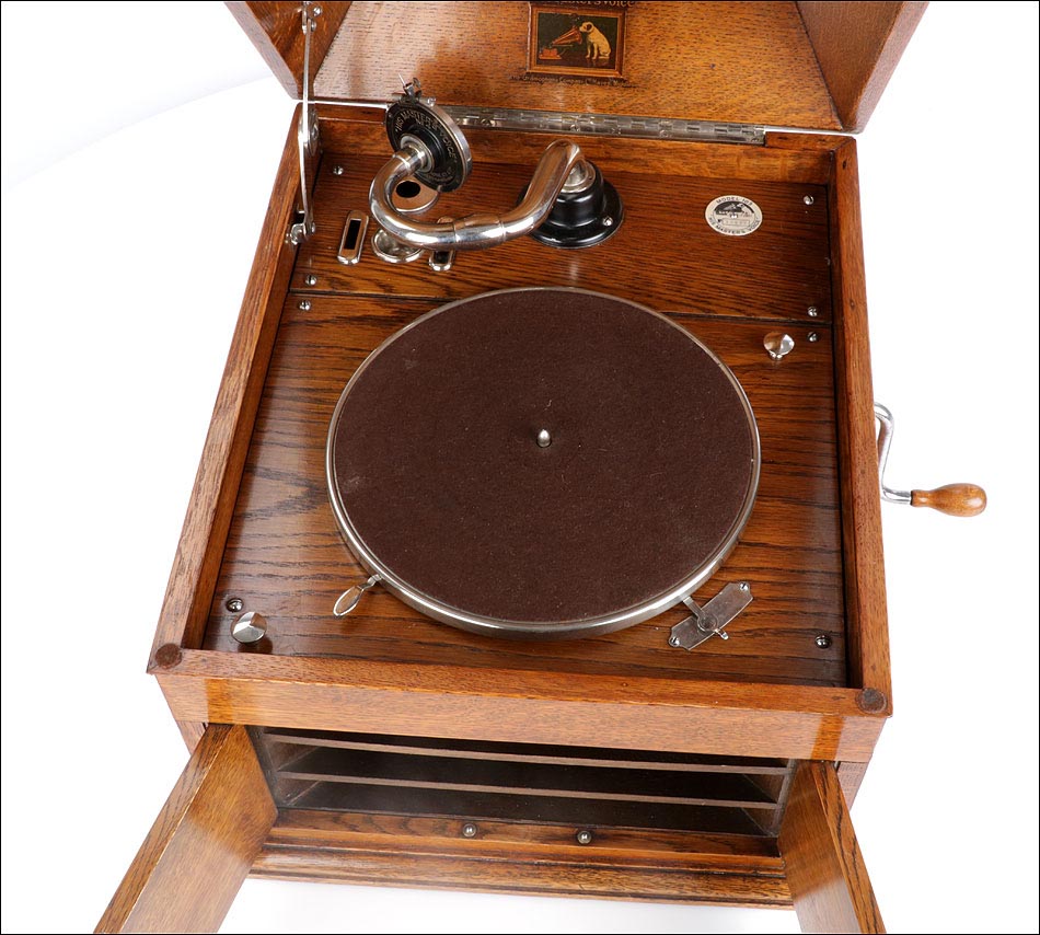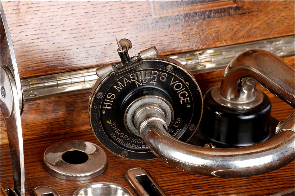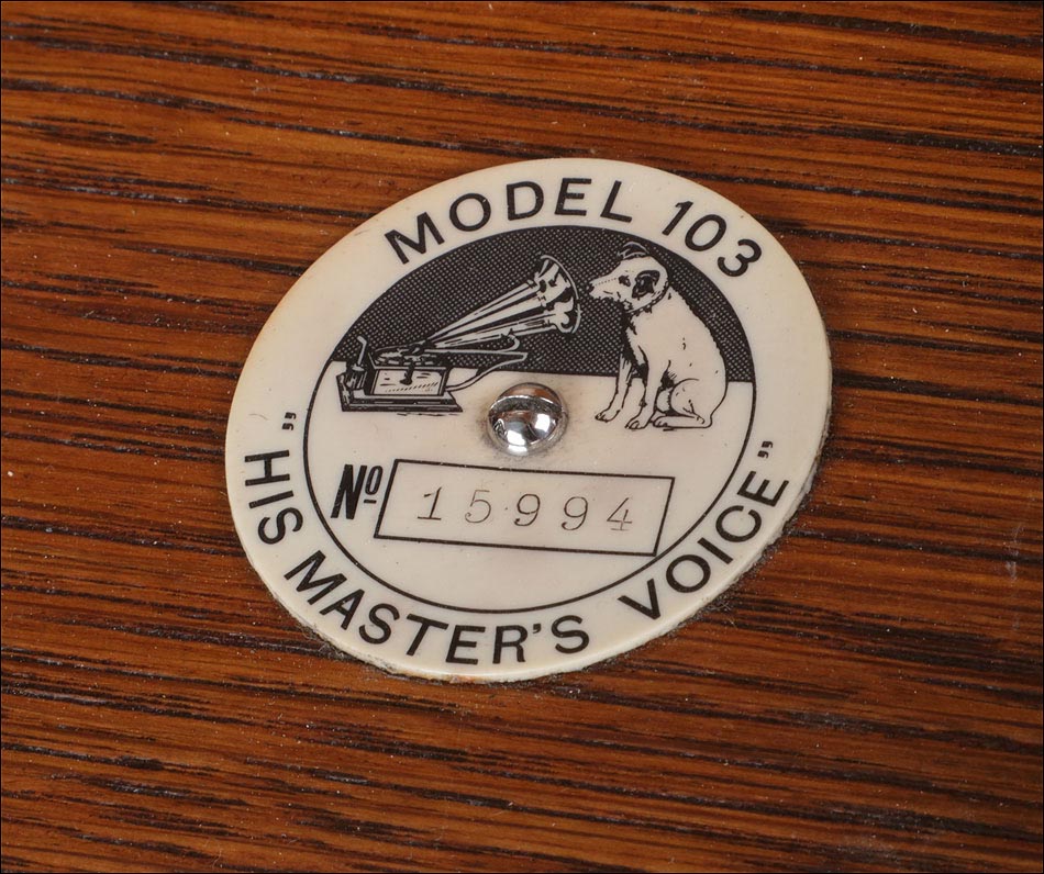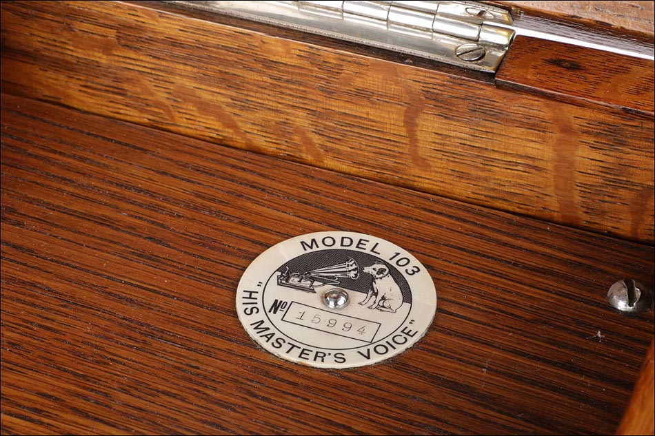 El mecanismo de reproducción está formado por distintas piezas de metal cromado, en excelentes condiciones y totalmente originales. El reproductor es un modelo HIS MASTER’S VOICE Nº 4, con el nombre de la marca grabado en su cara posterior. En el interior de la tapa podemos ver el logotipo original a todo color, perfectamente conservado y con la clásica imagen del perro escuchando un gramófono de trompeta. Junto al plato hay una placa circular de plástico blanco con el mismo logotipo grabado en negro, el modelo (103) y el número de serie del gramófono: Nº 15994.