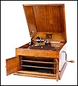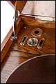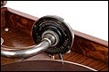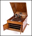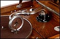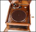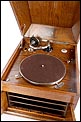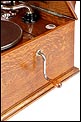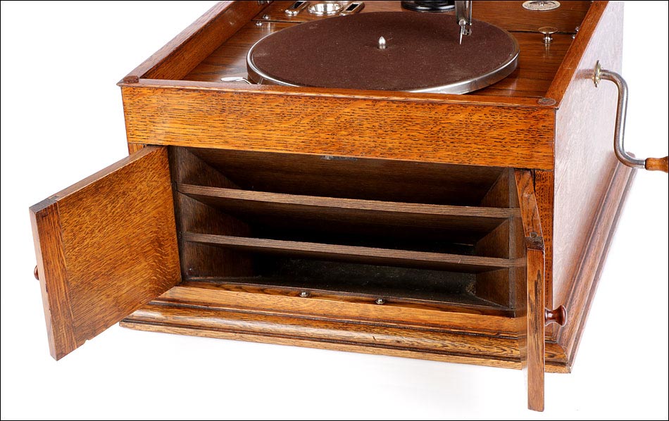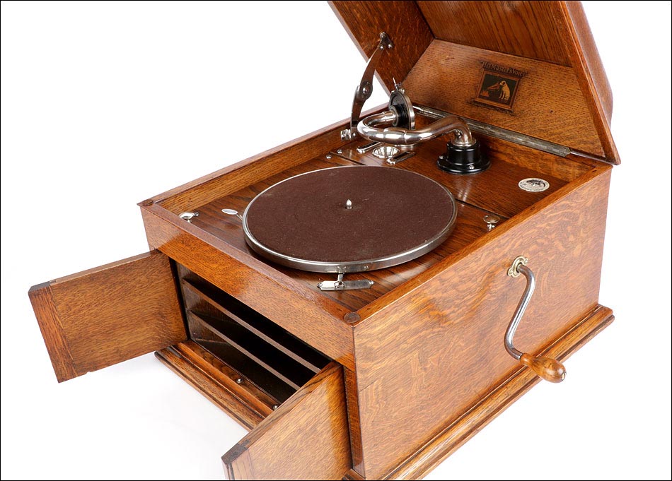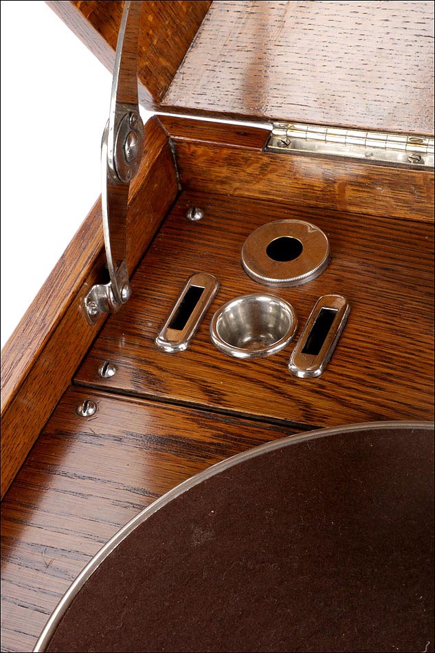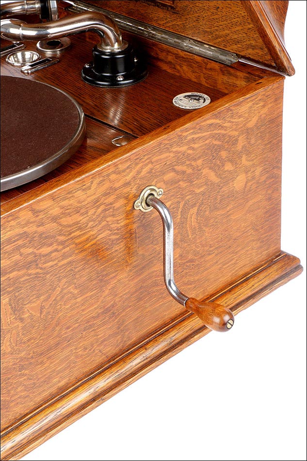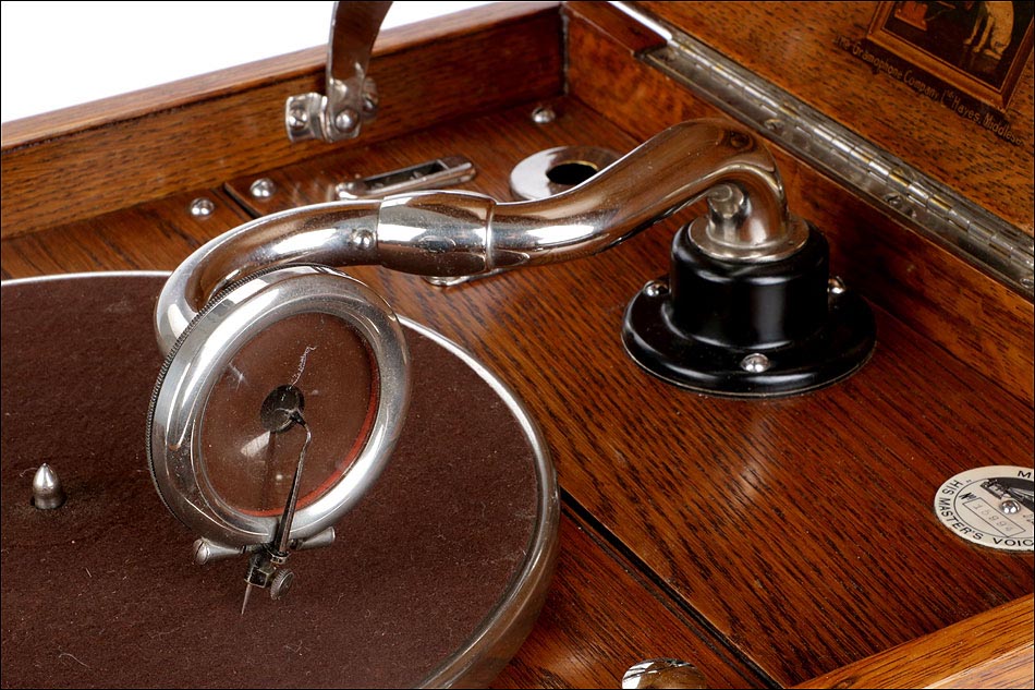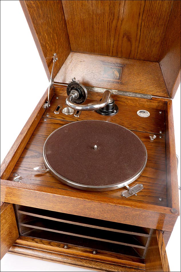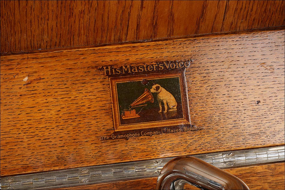 El mecanismo de reproducción está formado por distintas piezas de metal cromado, en excelentes condiciones y totalmente originales. El reproductor es un modelo HIS MASTER’S VOICE Nº 4, con el nombre de la marca grabado en su cara posterior. En el interior de la tapa podemos ver el logotipo original a todo color, perfectamente conservado y con la clásica imagen del perro escuchando un gramófono de trompeta. Junto al plato hay una placa circular de plástico blanco con el mismo logotipo grabado en negro, el modelo (103) y el número de serie del gramófono: Nº 15994.