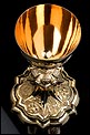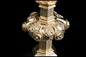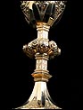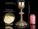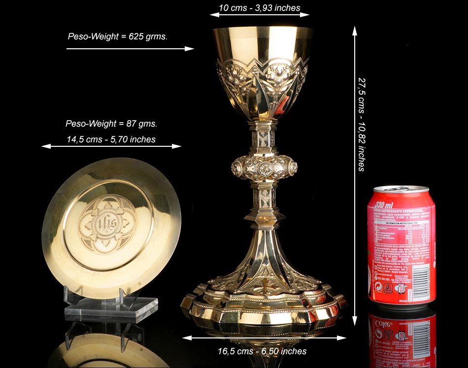 Medidas: Cáliz: Ancho de la Base: 16,5 cm. Ancho de la Copa: 10 cm. Alto: 27,5 cm. Peso: 625 g. Patena: Diámetro: 14,5 cm. Peso: 87 g.