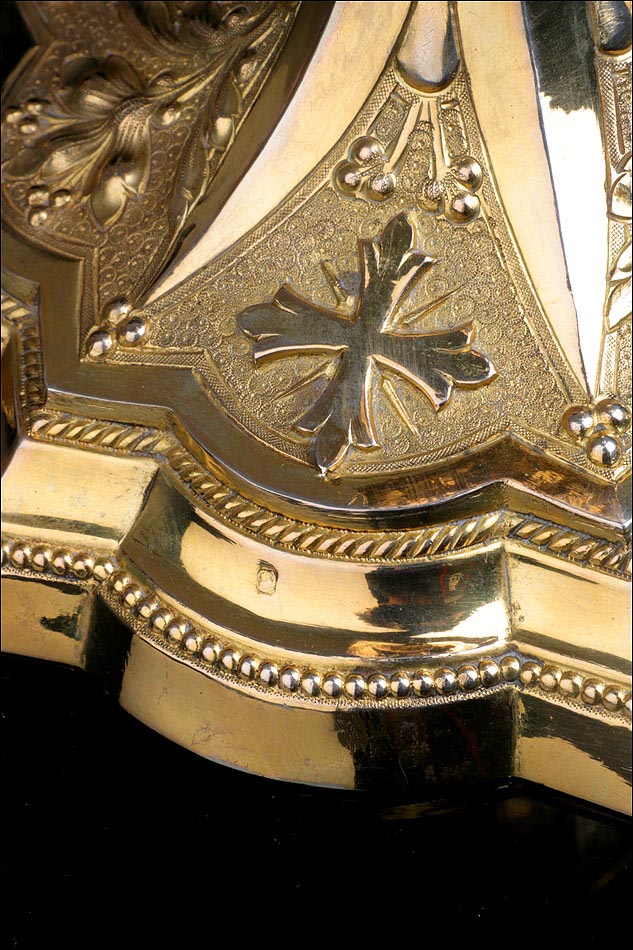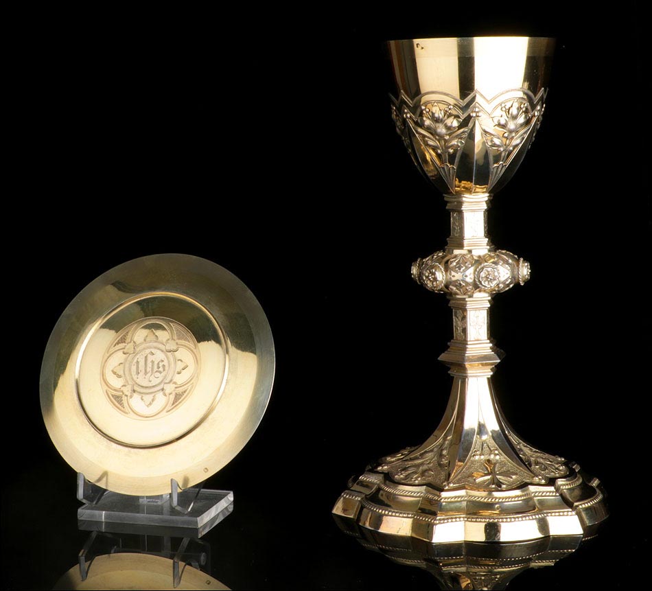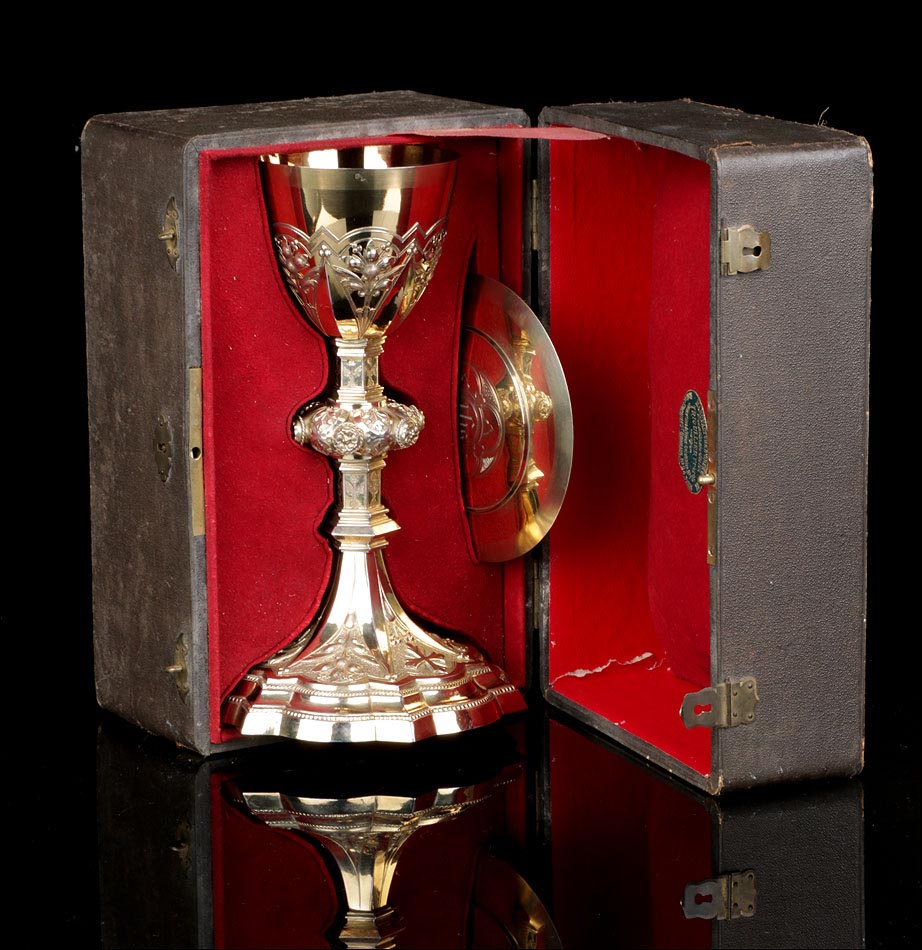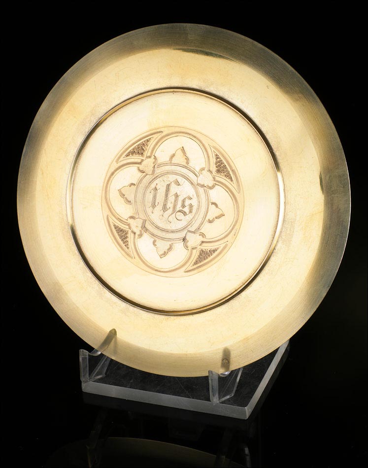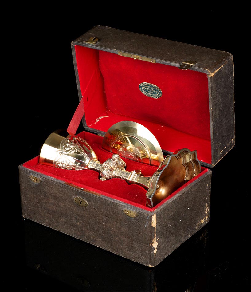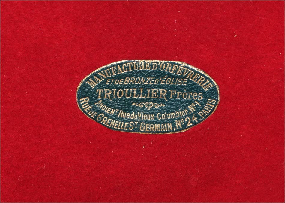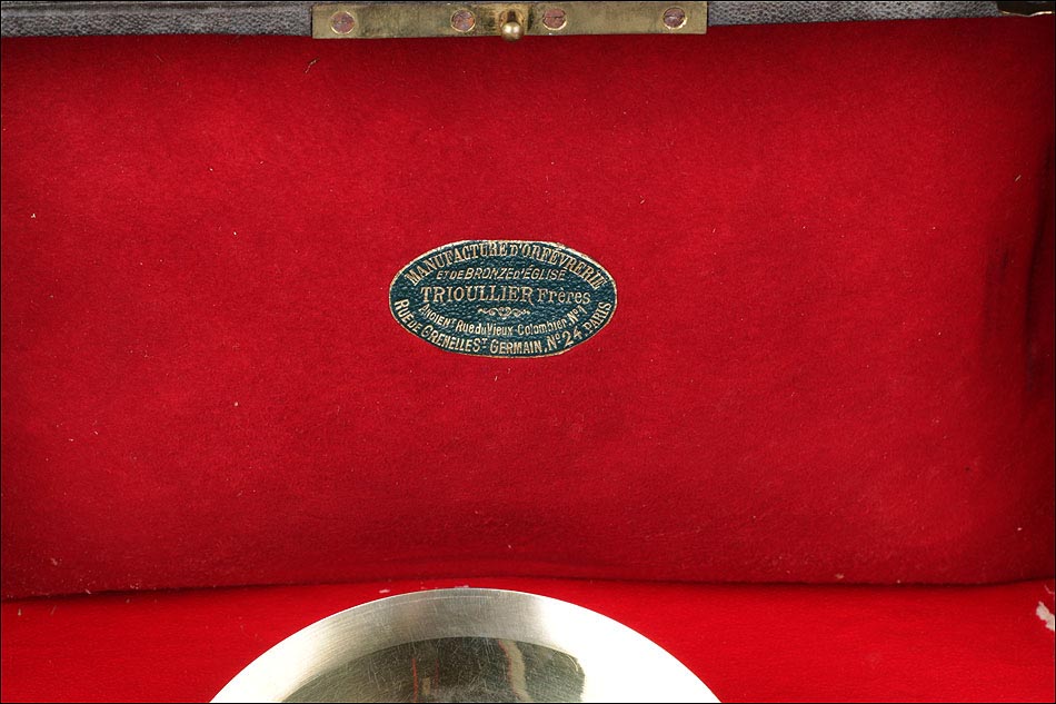 La patena que acompaña al cáliz, también de plata maciza, lleva grabado un motivo central con el cristograma IHS (abreviatura latina de Jesucristo, habitual en este tipo de piezas). Al igual que el cáliz, lleva el contraste de la plata francesa y un sello romboidal con la palabra CHEVRON. Ambas piezas se guardan en el estuche original, forrado de piel negra por el exterior y de terciopelo rojo por el interior. Dentro de la tapa hay una etiqueta ovalada de color azul con una inscripción dorada en la que aparece el nombre de los orfebres, TRIOULLIER Fréres, y la dirección de su negocio en París.