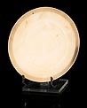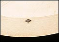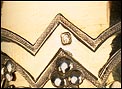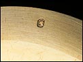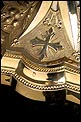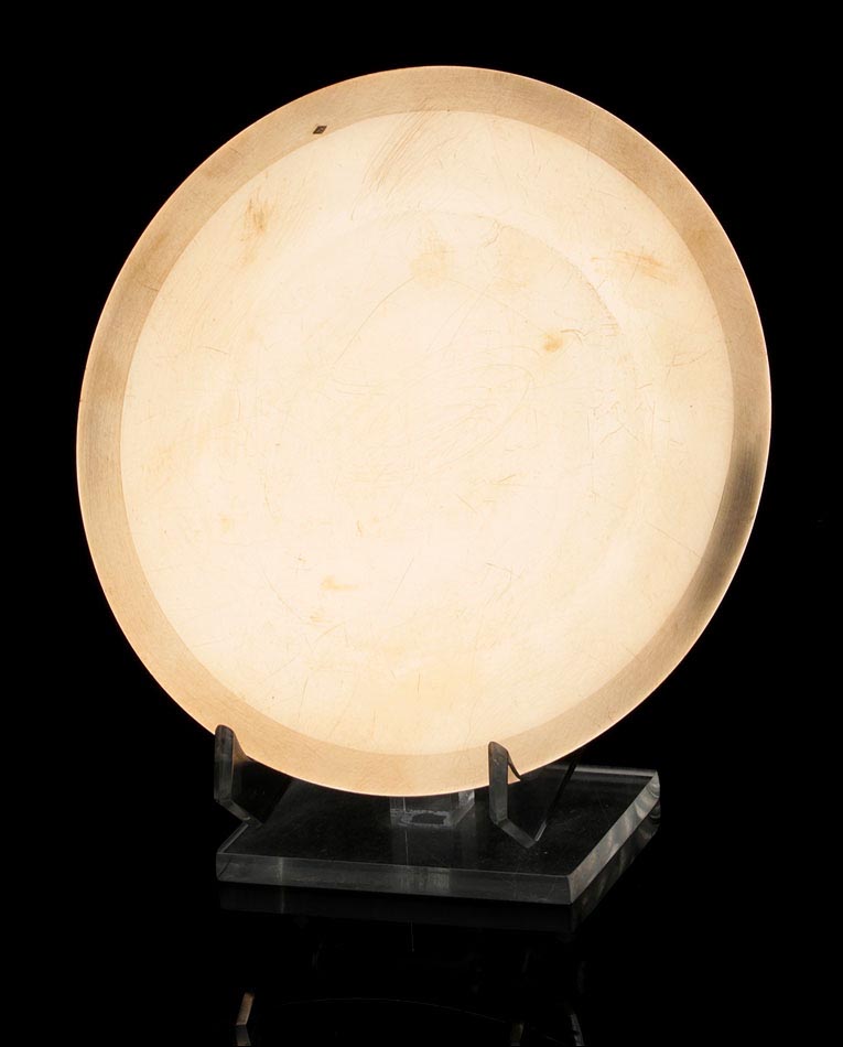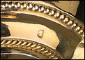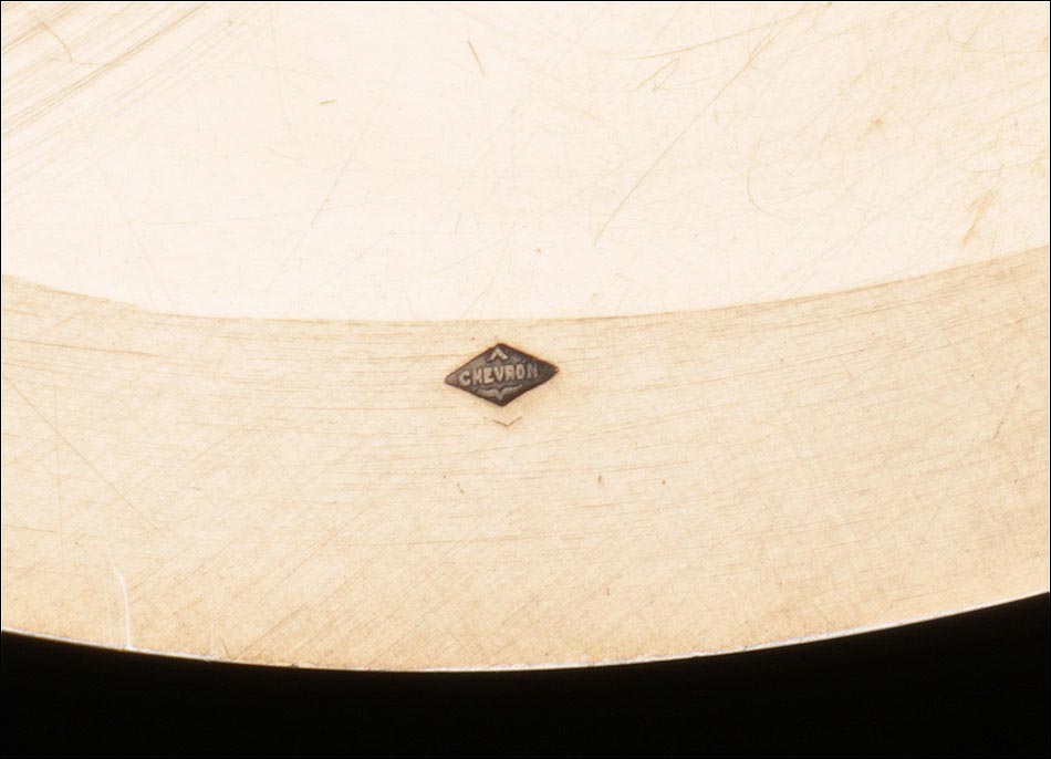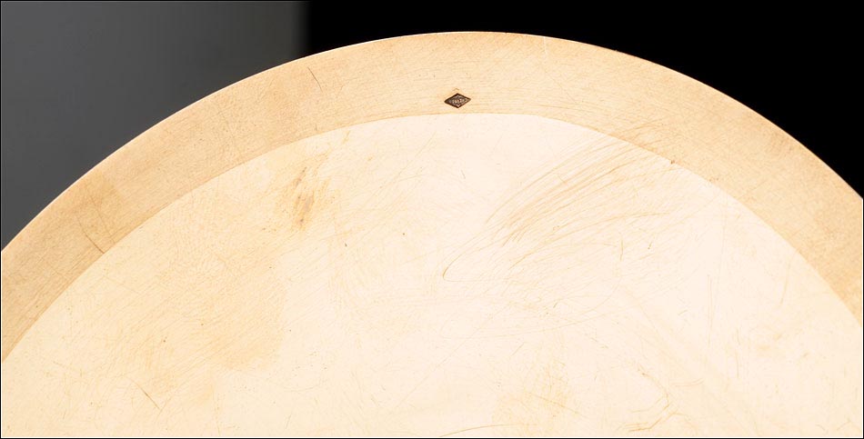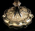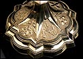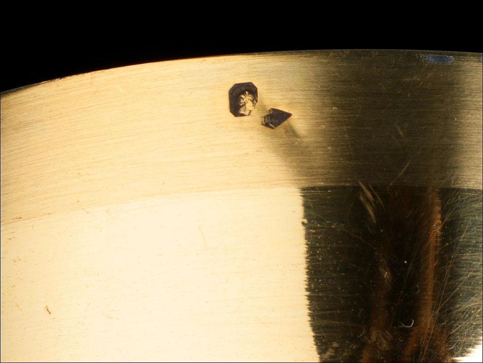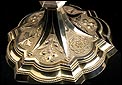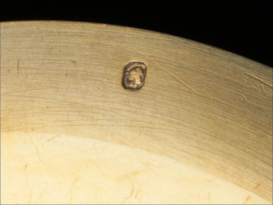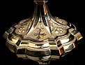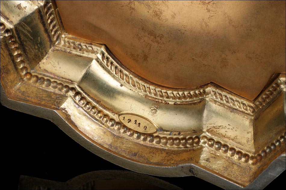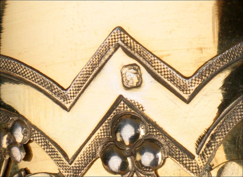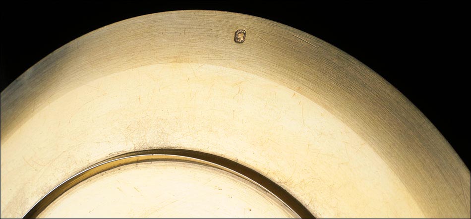 La patena que acompaña al cáliz, también de plata maciza, lleva grabado un motivo central con el cristograma IHS (abreviatura latina de Jesucristo, habitual en este tipo de piezas). Al igual que el cáliz, lleva el contraste de la plata francesa y un sello romboidal con la palabra CHEVRON. Ambas piezas se guardan en el estuche original, forrado de piel negra por el exterior y de terciopelo rojo por el interior. Dentro de la tapa hay una etiqueta ovalada de color azul con una inscripción dorada en la que aparece el nombre de los orfebres, TRIOULLIER Fréres, y la dirección de su negocio en París.