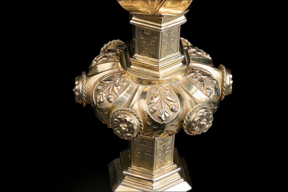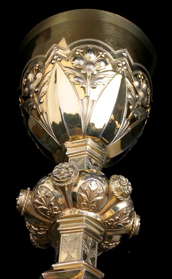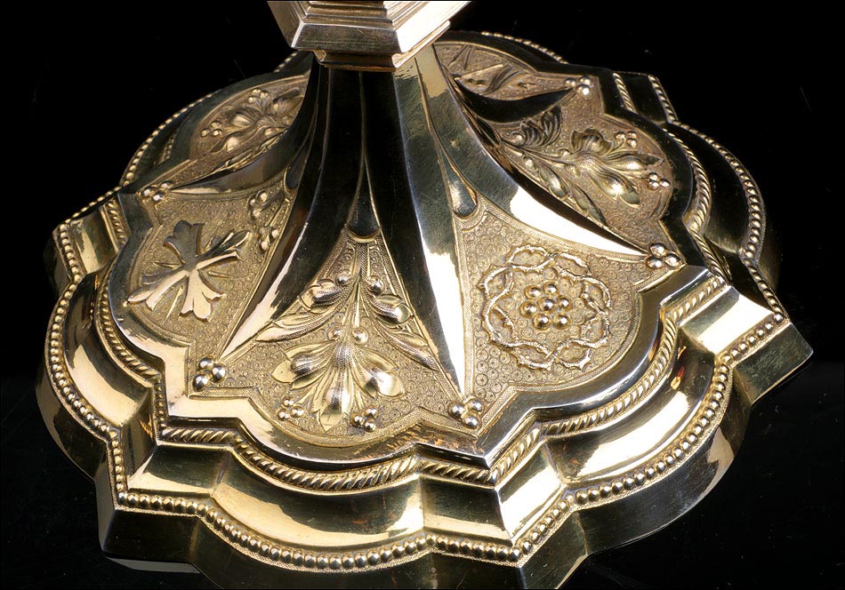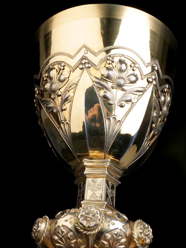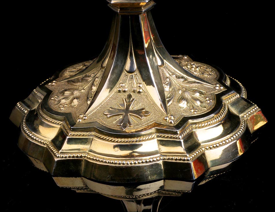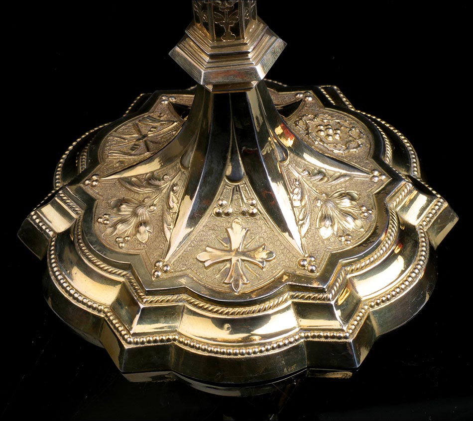 El cáliz es una pieza impresionante por su elaborado diseño neogótico. Lleva base lobulada, amplia y llamativa, con una forma que combina picos de estrella con zonas semicirculares. Está decorada con motivos en relieve que combinan cruces con formas vegetales muy estilizadas. Entre estos motivos podemos distinguir también una corona de espinas. En el borde aparece grabado el número 17118. El tallo de sección hexagonal está profusamente adornado con motivos vegetales sutilmente grabados en el metal. Lleva dos nudos, uno más pequeño y sencillo y otro totalmente cubierto por motivos grabados que representan plantas y flores. La copa, por su parte, lleva una base formada por estilizadas hojas acompañadas de motivos vegetales, exactamente iguales los del pie del cáliz.