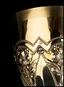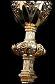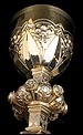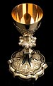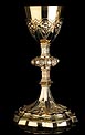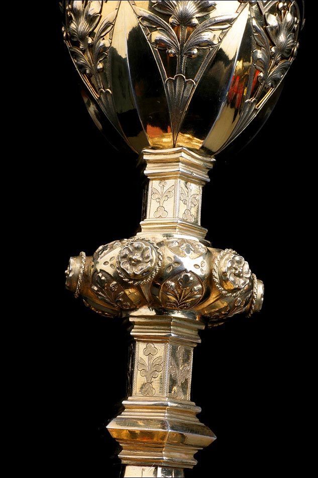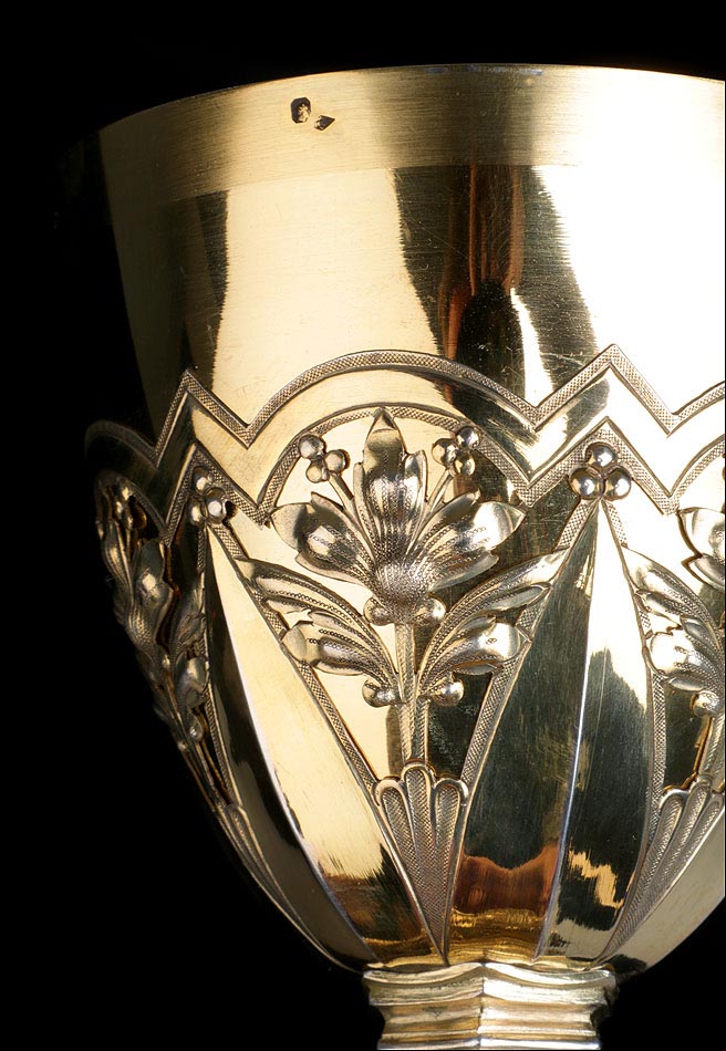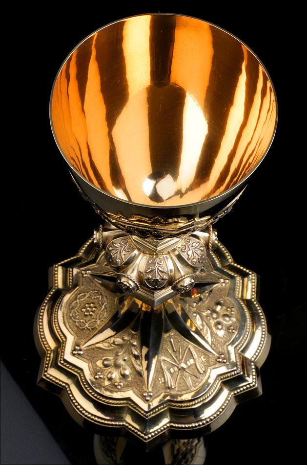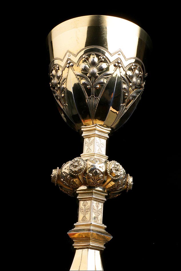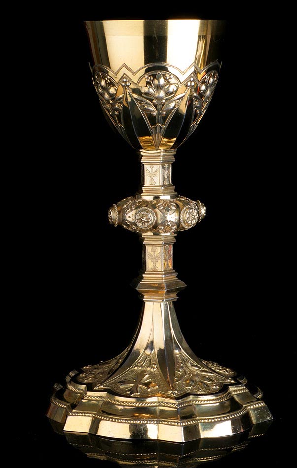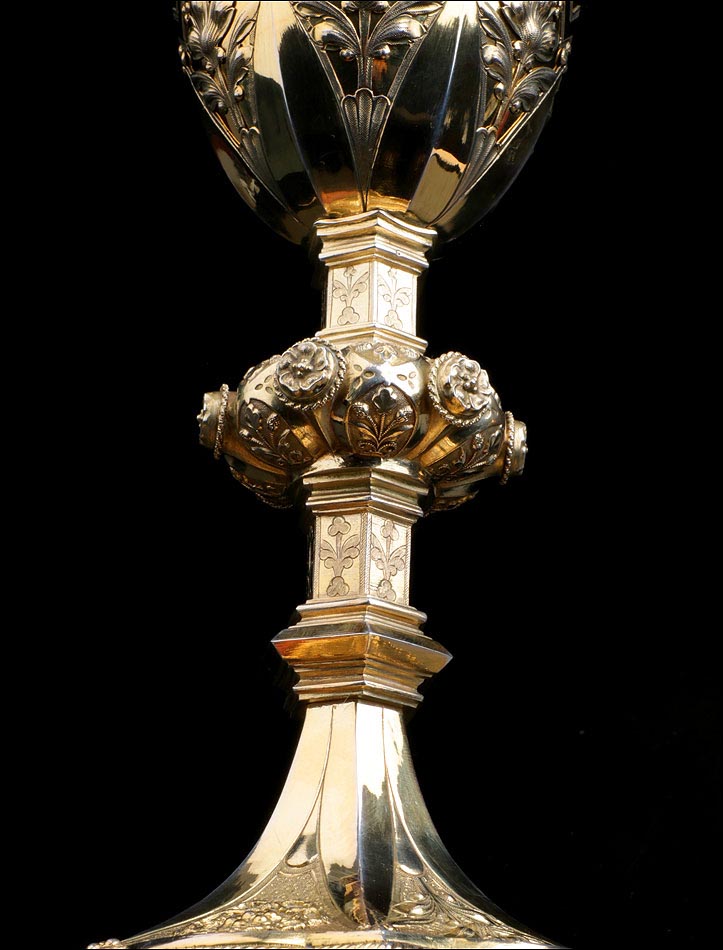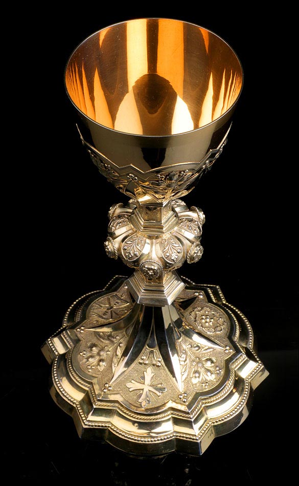 El cáliz es una pieza impresionante por su elaborado diseño neogótico. Lleva base lobulada, amplia y llamativa, con una forma que combina picos de estrella con zonas semicirculares. Está decorada con motivos en relieve que combinan cruces con formas vegetales muy estilizadas. Entre estos motivos podemos distinguir también una corona de espinas. En el borde aparece grabado el número 17118. El tallo de sección hexagonal está profusamente adornado con motivos vegetales sutilmente grabados en el metal. Lleva dos nudos, uno más pequeño y sencillo y otro totalmente cubierto por motivos grabados que representan plantas y flores. La copa, por su parte, lleva una base formada por estilizadas hojas acompañadas de motivos vegetales, exactamente iguales los del pie del cáliz.