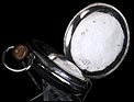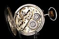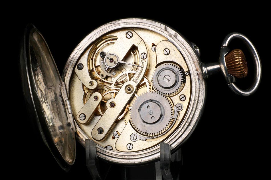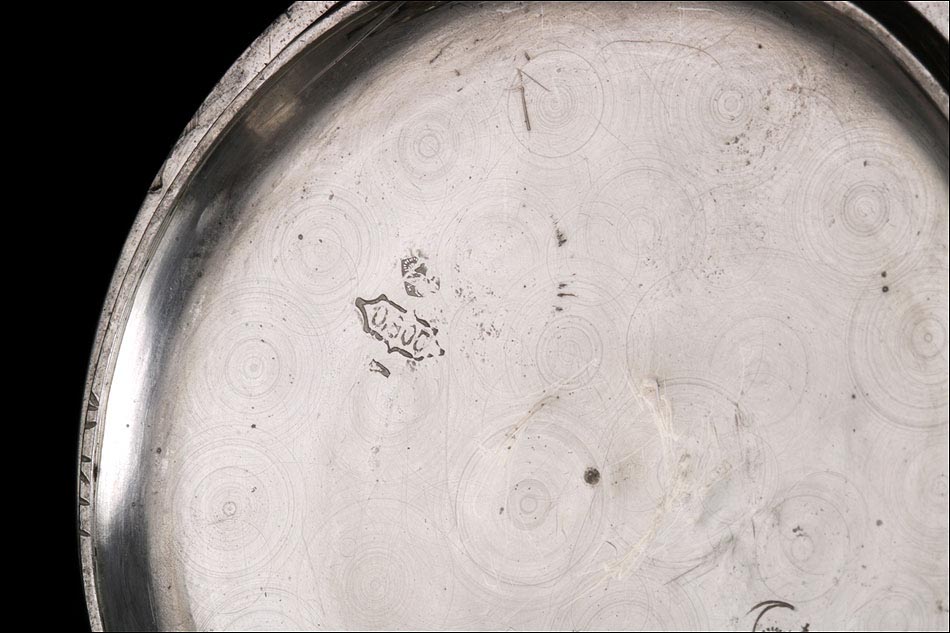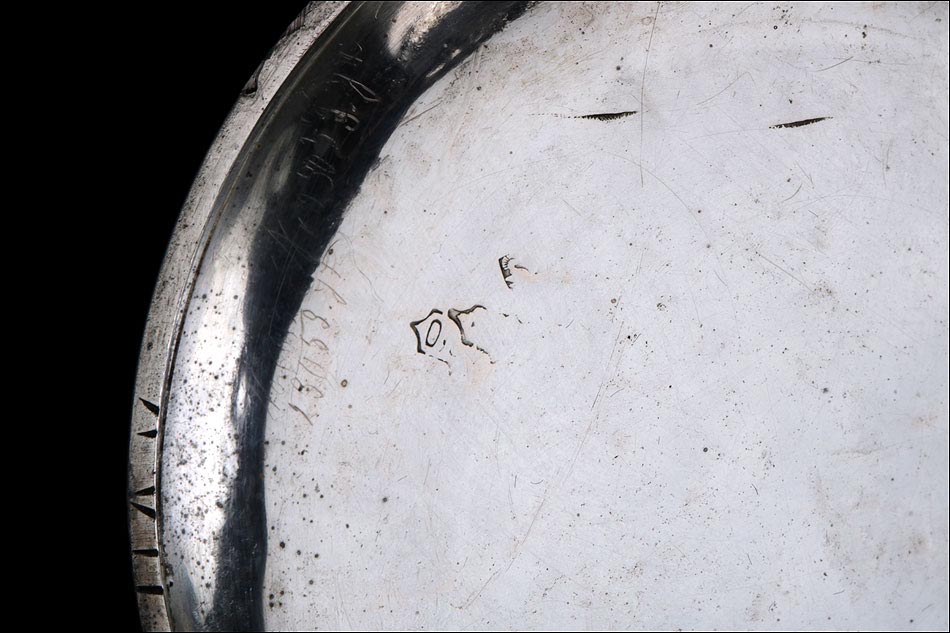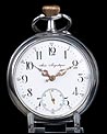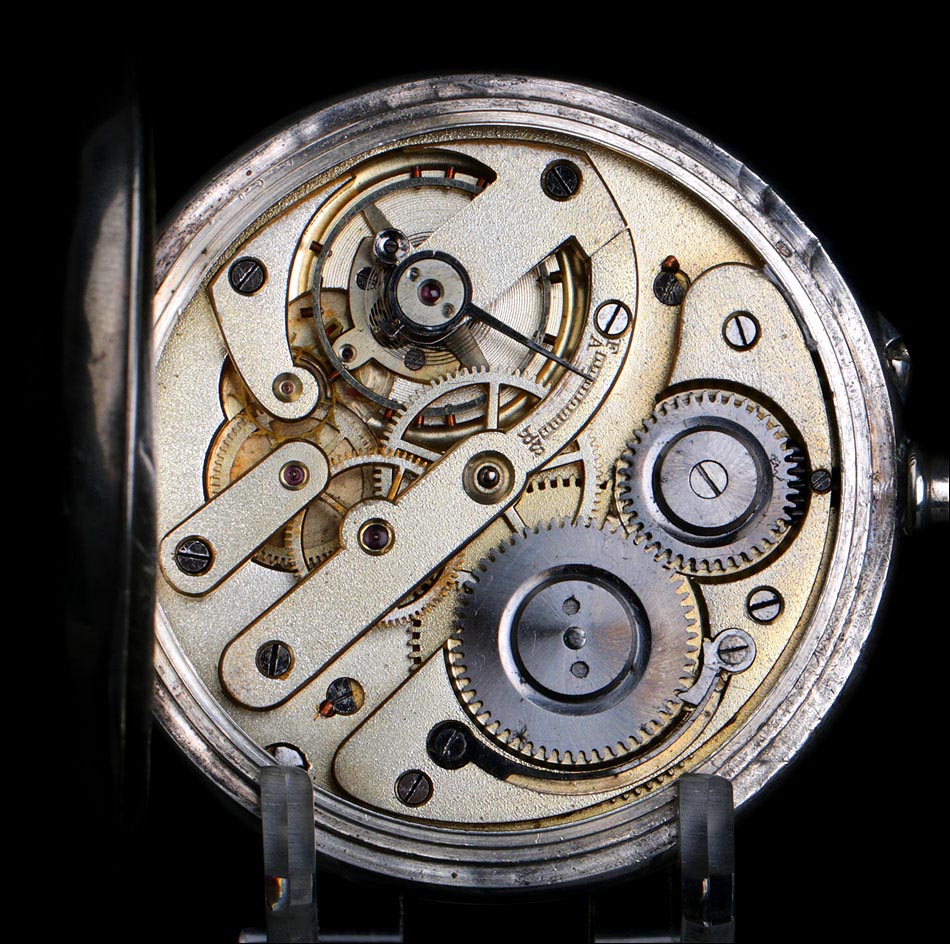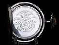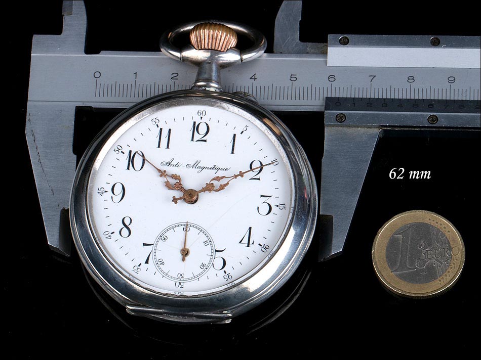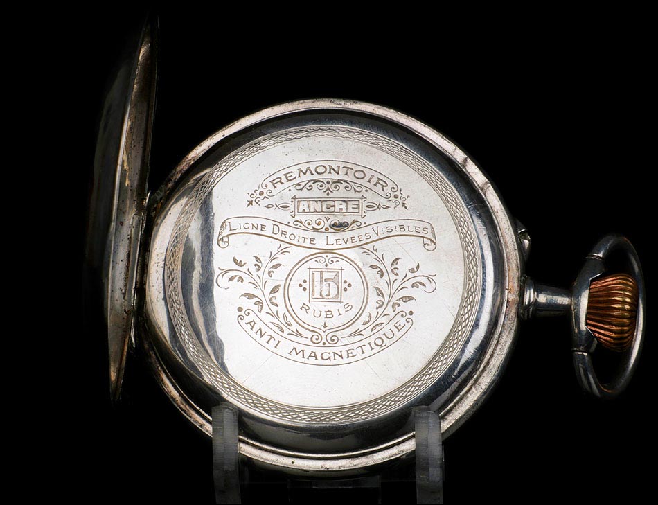 Destacable y sobredimensionado reloj de bolsillo antiguo de plata maciza, fabricado en Suiza para el mercado noruego. El reloj es realmente llamativo, tanto por su gran tamaño (62 mm de ancho) como por su preciosa esfera. Lleva tapa delantera de cristal con esfera blanca, sin pelos ni desperfecto. La esfera lleva números arábigos negros y manecillas muy historiadas, de metal dorado y estilo Luis XV. En ella podemos ver impresa la inscripción Anti – Magnetique. La tapa trasera de plata lleva un escudo nobiliario noruego con un león rampante, grabado a mano con pericia y delicadeza. La tapa guardapolvo es también de plata y lleva una inscripción grabada que indica que la maquinaria incorpora 15 rubíes. En el interior de ambas tapas aparecen los contrastes de la plata, el gramaje y el número de serie 177 – 94085.