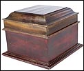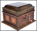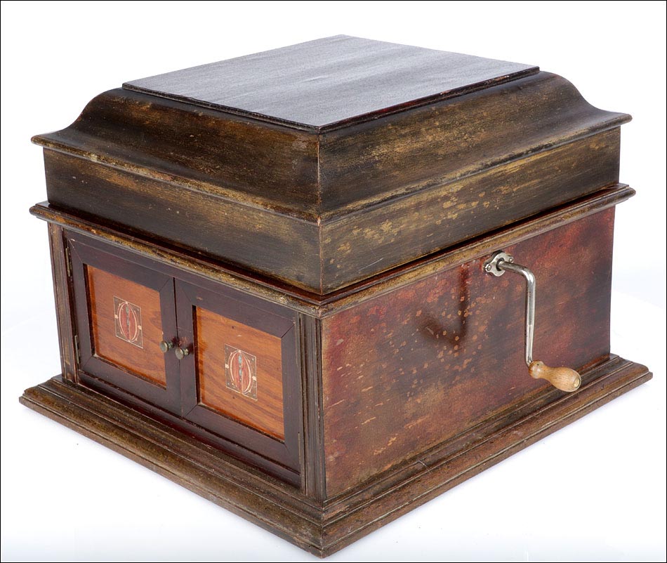 La caja es de líneas rectas y sobrias. Sigue un diseño estilo art déco muy del gusto de la época, que combina una elegancia formal muy atractiva con una marcada pureza de líneas. En la cara frontal lleva dos portezuelas simétricas, que se abren para despejar el altavoz y dejar salir el sonido mientras el gramófono se encuentra en funcionamiento. Las puertas llevan marcos de color caoba y paneles de madera de pino color miel. En el centro de cada panel podemos ver un delicado detalle de marquetería de forma rectangular, con motivos abstractos simétricos que combinan diferentes colores.