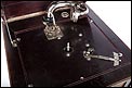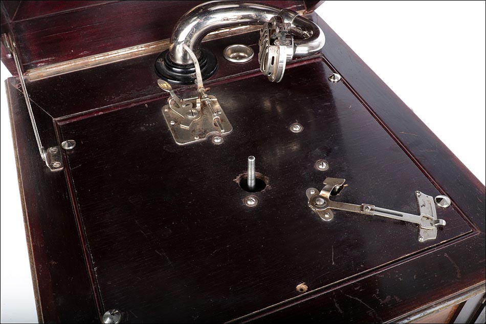 Detrás de las puertas encontramos una pieza de madera con aberturas en celosía, protegidas por un tejido de color amarillo que oculta el altavoz. Las piezas que conforman el mecanismo del gramófono (brazo, reproductor, plato, manivela…) son de metal cromado y se encuentran en excelentes condiciones. En el interior de la tapa podemos ver el logotipo dorado de la marca Supreme en magnífico estado de conservación.