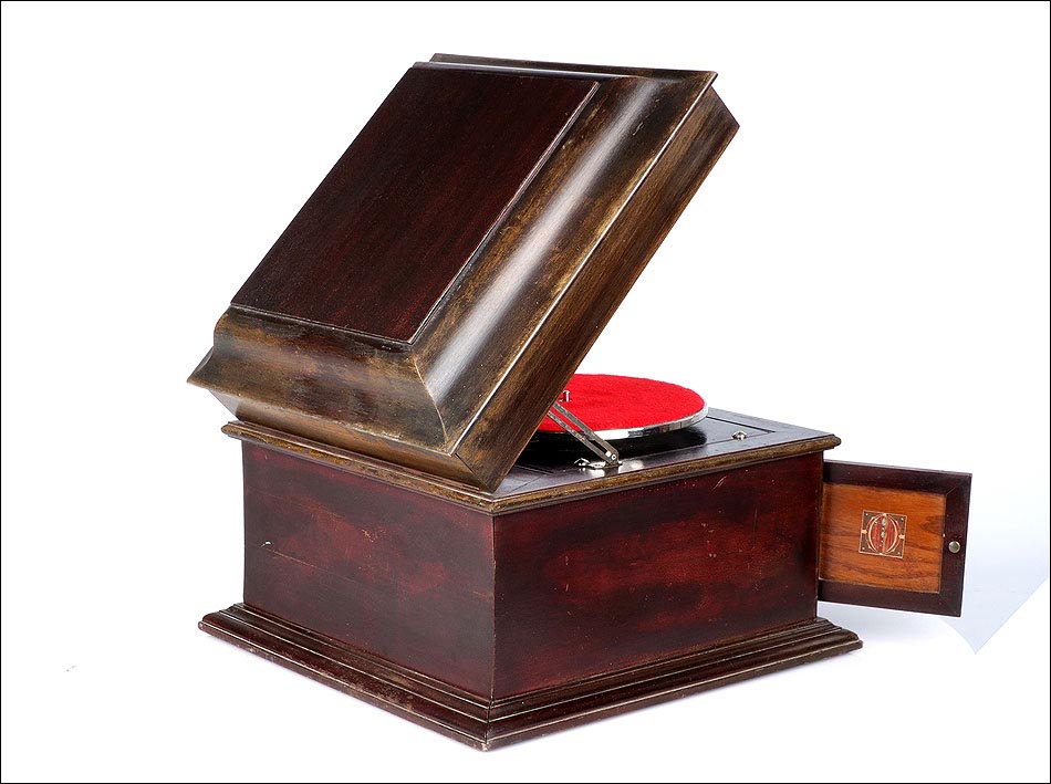 Original y antiguo gramófono de sobremesa Supremo, fabricado en Francia en 1930 para el mercado español. Esa es la razón por la que en la caja podemos ver el logotipo original con el nombre Supreme (francés), mientras que en el reproductor aparece grabada la palabra SUPREMO en español. El motor del gramófono se ha revisado a fondo para garantizar un buen funcionamiento, por lo que actualmente suena muy bien. Lleva reproductor original y freno automático. La caja de madera muestra un atractivo acabado oscuro, que combina color caoba (en la caja) y color nogal (en la tapa). El barniz no está en perfecto estado, pero puede restaurarse sin problemas mediante la intervención de un profesional, aunque así gana en sabor.