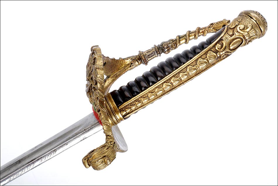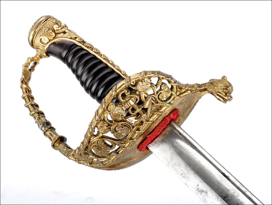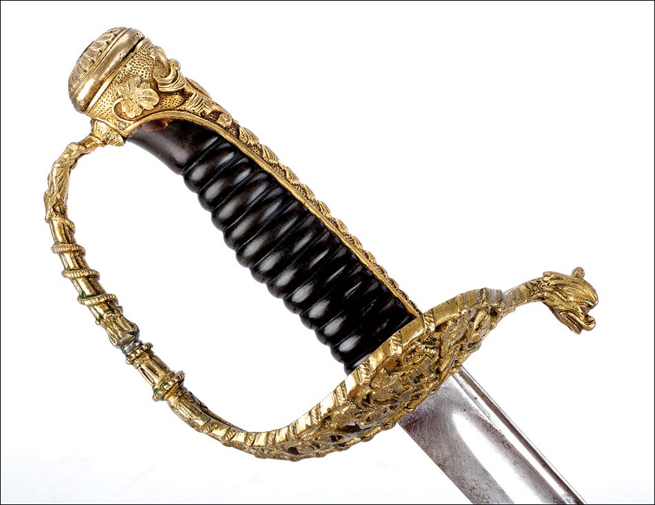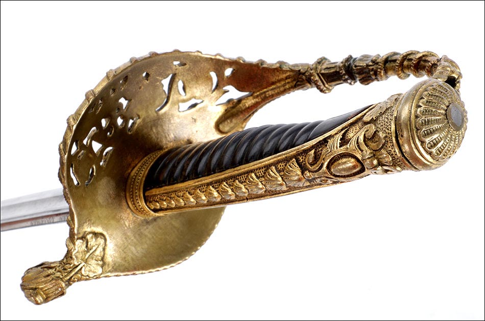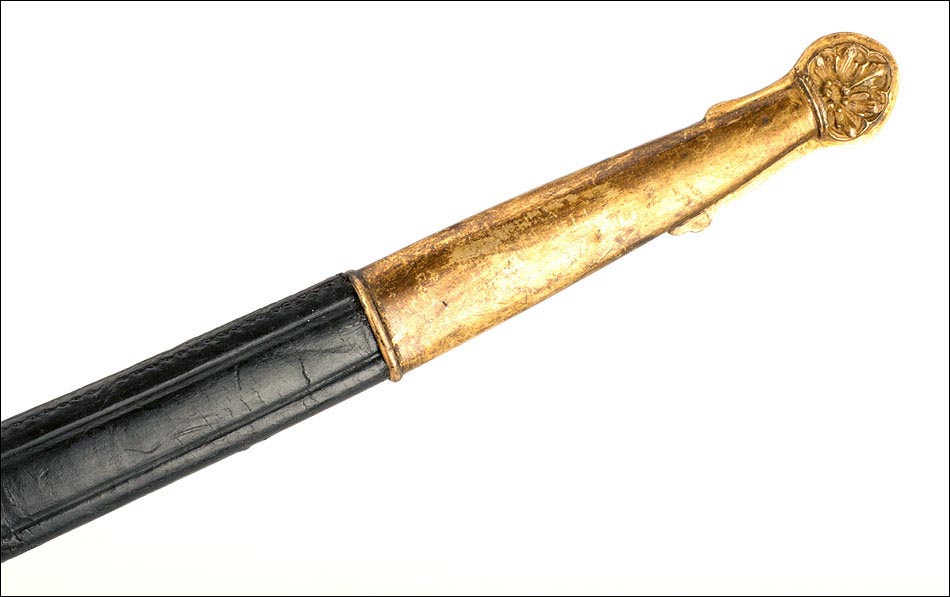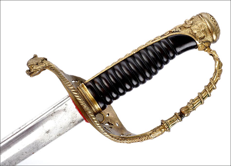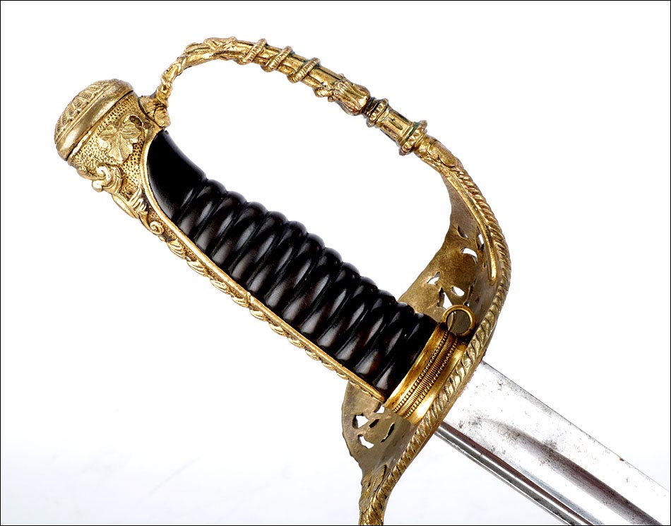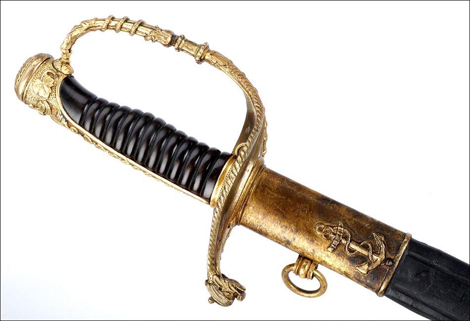 Preciosa espada sable francesa de oficial de la marina, con puño de latón historiado y vaina original de piel negra. La espada data del siglo XIX y se encuentra en muy buen estado. La hoja de acero aparece lisa y sin óxido ni signos importantes de deterioro, mientras que la vaina negra se muestra lisa y suave. La vaina lleva boquilla de latón con un relieve que representa un ancla, y con la anilla original. Lleva un refuerzo de latón en el centro y batiente en la punta, del mismo metal. Pero si hay un elemento atractivo en esta fantástica espada antigua es sin duda su empuñadura. Esta pieza lleva guardamano labrado con la cruz rematada por una cabeza de animal. Entre los motivos labrados distinguimos un ancla, representativa de la marina, junto con motivos vegetales entrelazados. La pieza de metal que cubre y refuerza el puño está decorada con vieiras labradas. El puño es de madera ebonizada, cuyo acabado en color negro brillante hace un fantástico contraste con el oro del metal y el acero de la hoja.