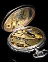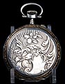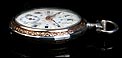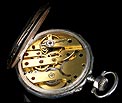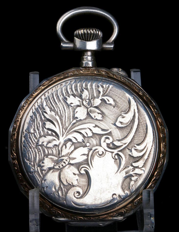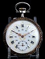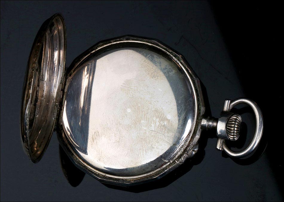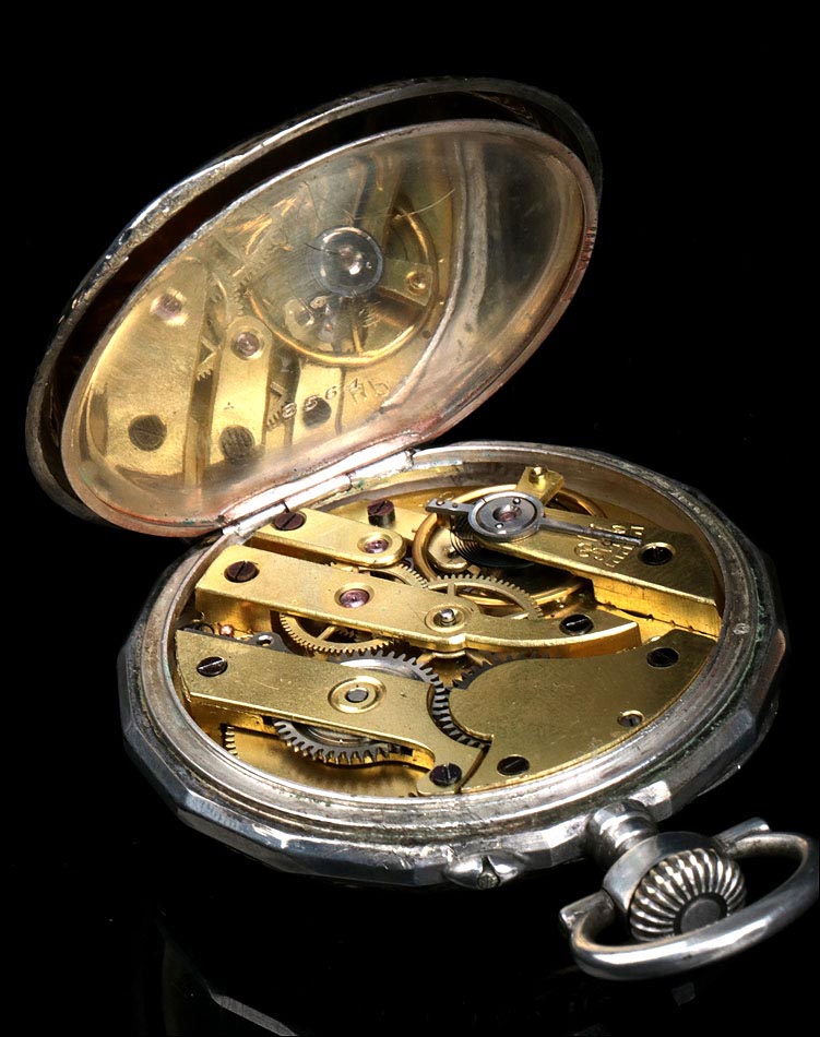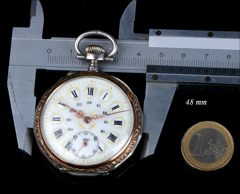 Precioso reloj de bolsillo antiguo fabricado en Francia a principios del siglo XX (año 1900), muy bien conservado y funcionando a la perfección. Lleva maquinaria de cilindro, que se ha revisado para garantizar un buen rendimiento: a día de hoy el reloj es totalmente funcional. La caja del reloj es de plata maciza y la esfera es de porcelana decorada. Llama la atención su gran belleza: con fondo blanco, está decorada con profusión de apliques y detalles dorados. Los números romanos en esmalte negro llevan marcos dorados historiados de forma ovalada. La esfera lleva segundero y agujas Luis XV en metal cobrizo. Está rodeada por un aro de plata dorada que hace un bonito contraste con la plata lisa del resto de la caja. La tapa trasera lleva una decoración labrada a mano muy hermosa, con grandes flores y un espacio liso en la parte inferior para grabar las iniciales del propietario. En su interior encontramos los contrastes correspondientes (uno de ellos con una nécora) y el número de serie 8564. En el interior de la tapa guardapolvo podemos ver de nuevo el contraste de la nécora.