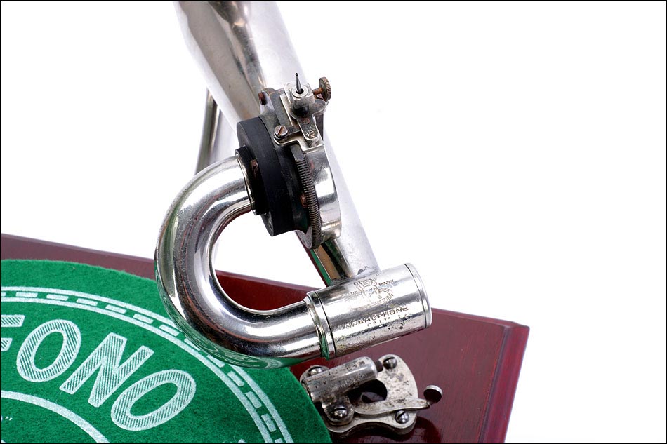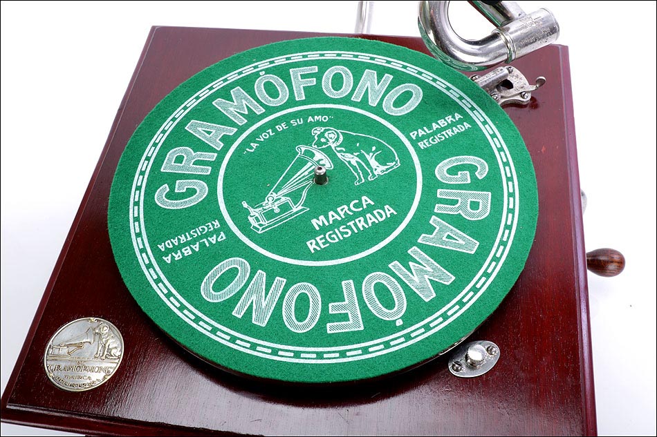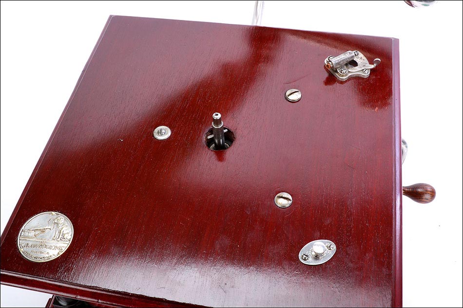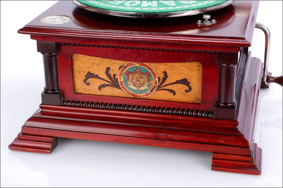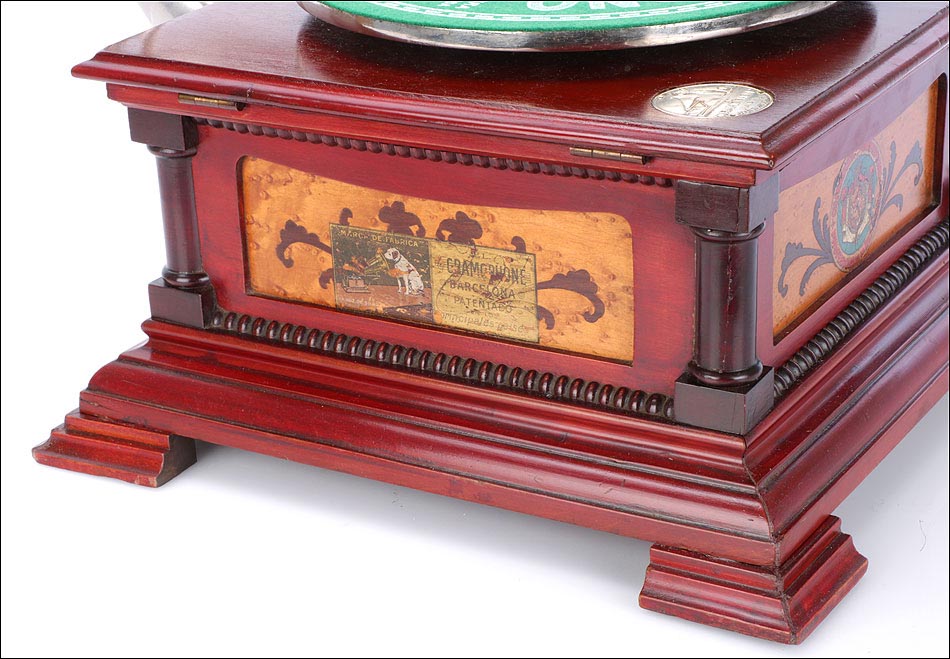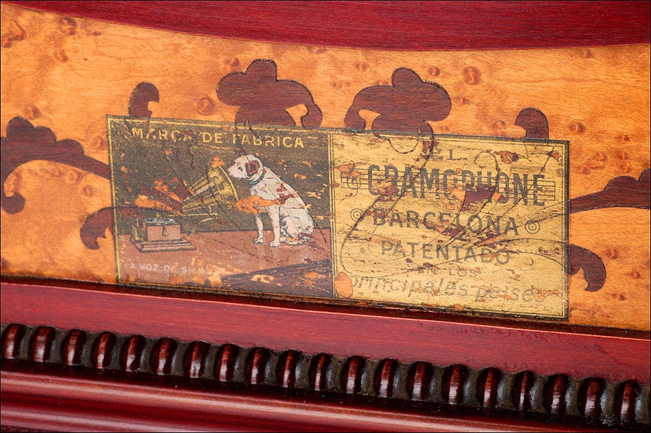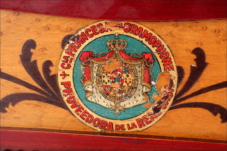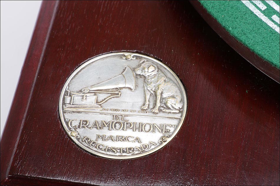 Los logotipos originales de la marca se conservan en muy buen estado. Entre ellos destaca el rarísimo logo frontal, donde se indica que la fábrica (Cia. Francesa del Grampohone) es proveedora de la Casa Real. En otro lateral aparece el clásico logo del perro escuchando un gramófono, con la inscripción GRAMPHONE BARCELONA PATENTADO. En la trompeta encontramos un tercer logo, de nuevo con la imagen del perro. Todas las piezas y componentes del gramófono son originales de época, salvo el fieltro que recubre el plato, que es una reproducción exacta del que el gramófono llevaba en origen. El brazo que soporta el reproductor y el codo que lo une con la caja y la trompa conservan el magnífico cromado original en impresionante estado de conservación. En el borde de la caja podemos ver el número de serie 30629 grabado en la madera.