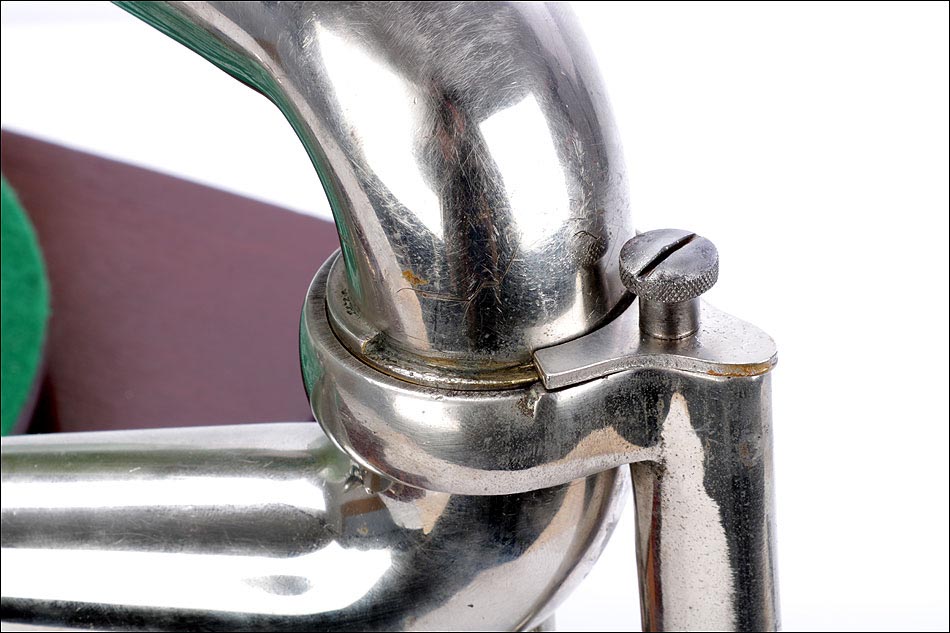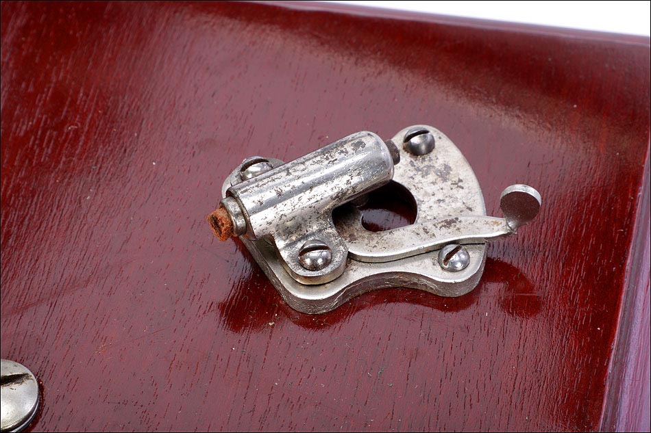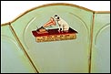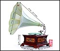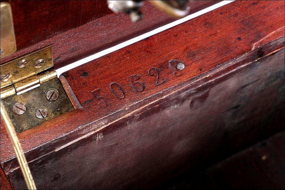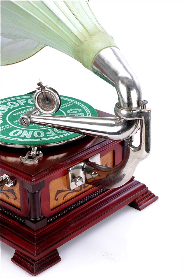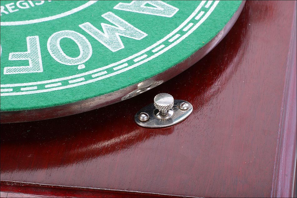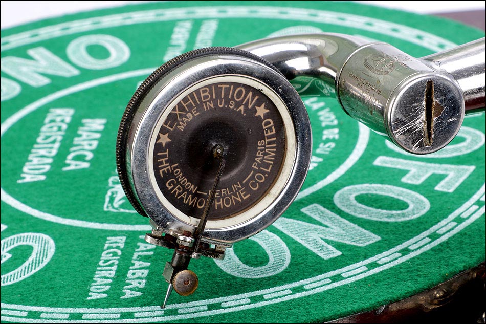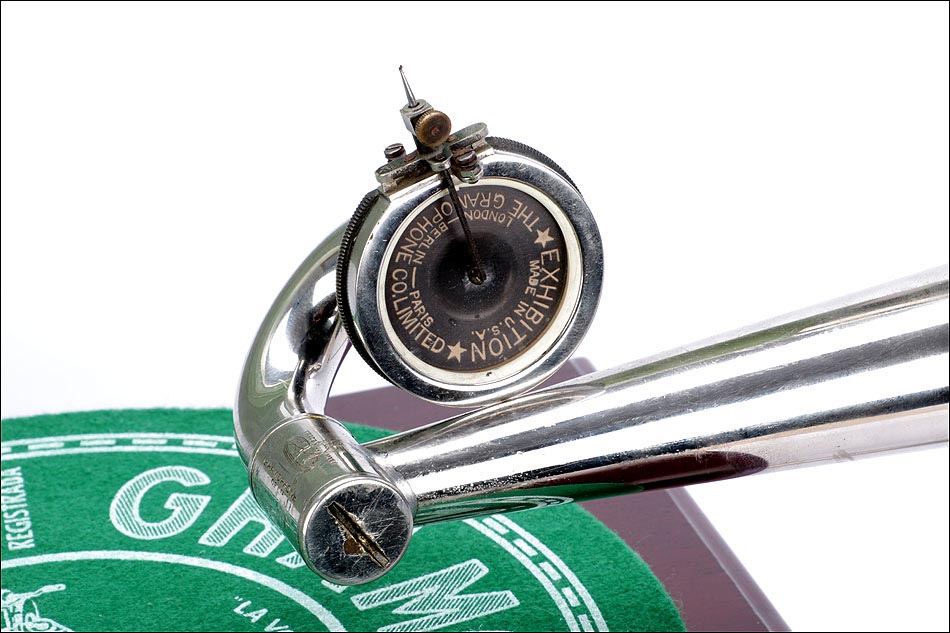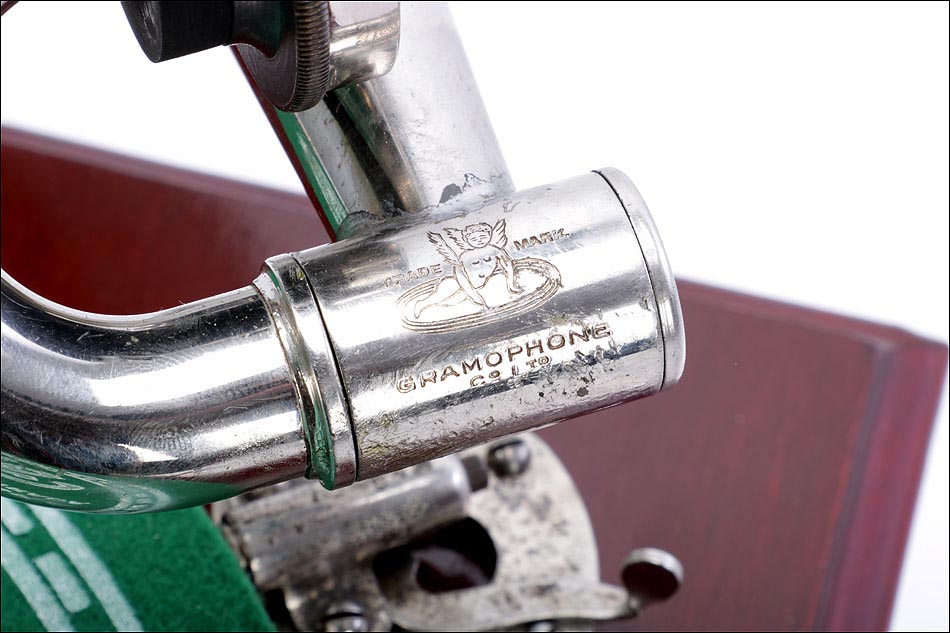 Los logotipos originales de la marca se conservan en muy buen estado. Entre ellos destaca el rarísimo logo frontal, donde se indica que la fábrica (Cia. Francesa del Grampohone) es proveedora de la Casa Real. En otro lateral aparece el clásico logo del perro escuchando un gramófono, con la inscripción GRAMPHONE BARCELONA PATENTADO. En la trompeta encontramos un tercer logo, de nuevo con la imagen del perro. Todas las piezas y componentes del gramófono son originales de época, salvo el fieltro que recubre el plato, que es una reproducción exacta del que el gramófono llevaba en origen. El brazo que soporta el reproductor y el codo que lo une con la caja y la trompa conservan el magnífico cromado original en impresionante estado de conservación. En el borde de la caja podemos ver el número de serie 30629 grabado en la madera.