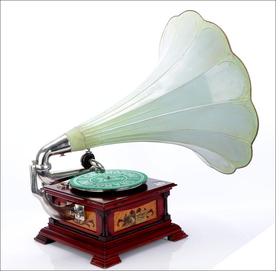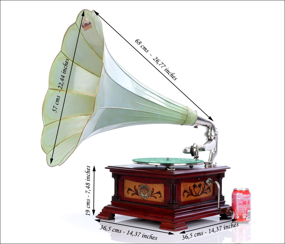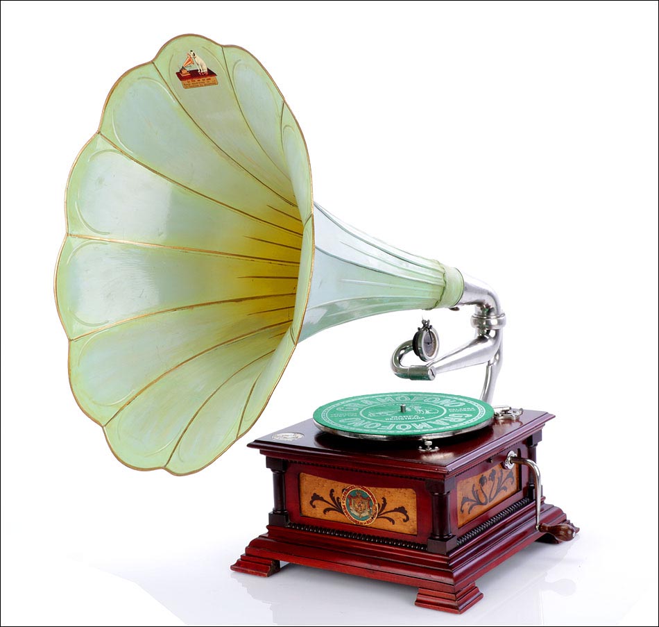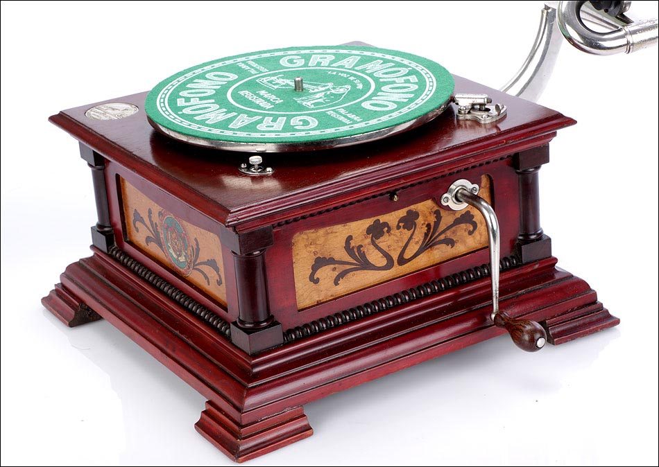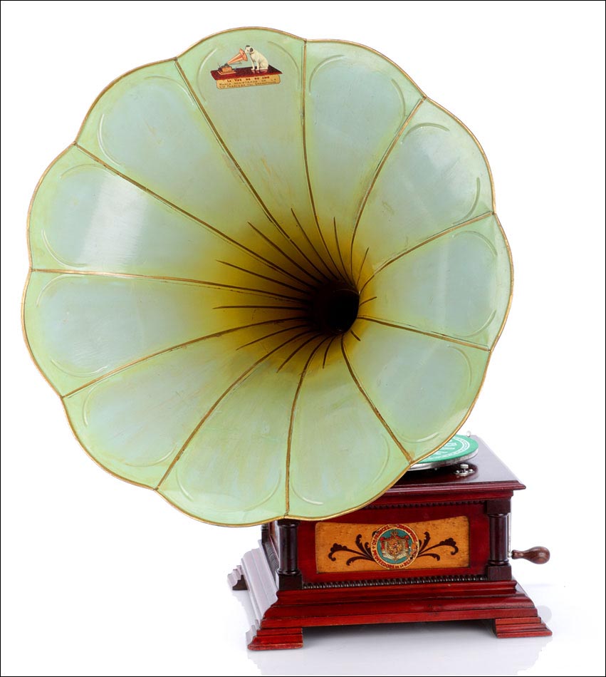 Impresionante gramófono antiguo La Voz de Su Amo modelo 5, fabricado en España circa 1920 y en estupendas condiciones. La caja y la trompeta han sido restauradas al detalle; el esmalte que recubre esta pieza es totalmente original, con solo discretas reintegraciones muy bien realizadas. El motor del gramófono se ha limpiado y ajustado, de manera que a día de hoy el aparato funciona a la perfección. La caja es de madera de caoba maciza y lleva laterales con marquetería de madera de raíz y caoba. La madera está protegida por un hermoso barnizado a muñequilla artesano, que le aporta un brillo cálido y profundo.