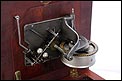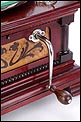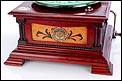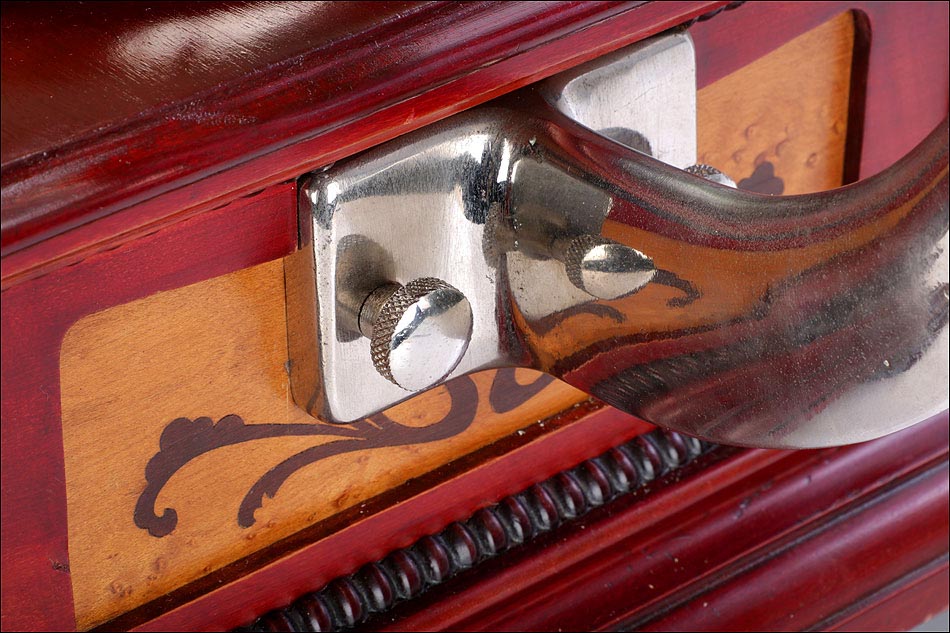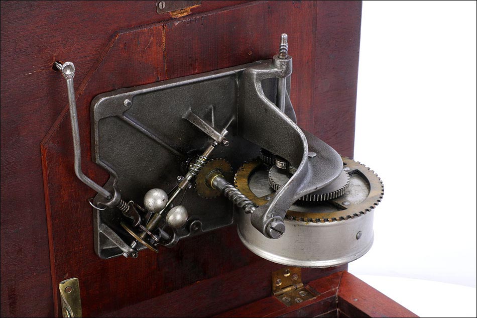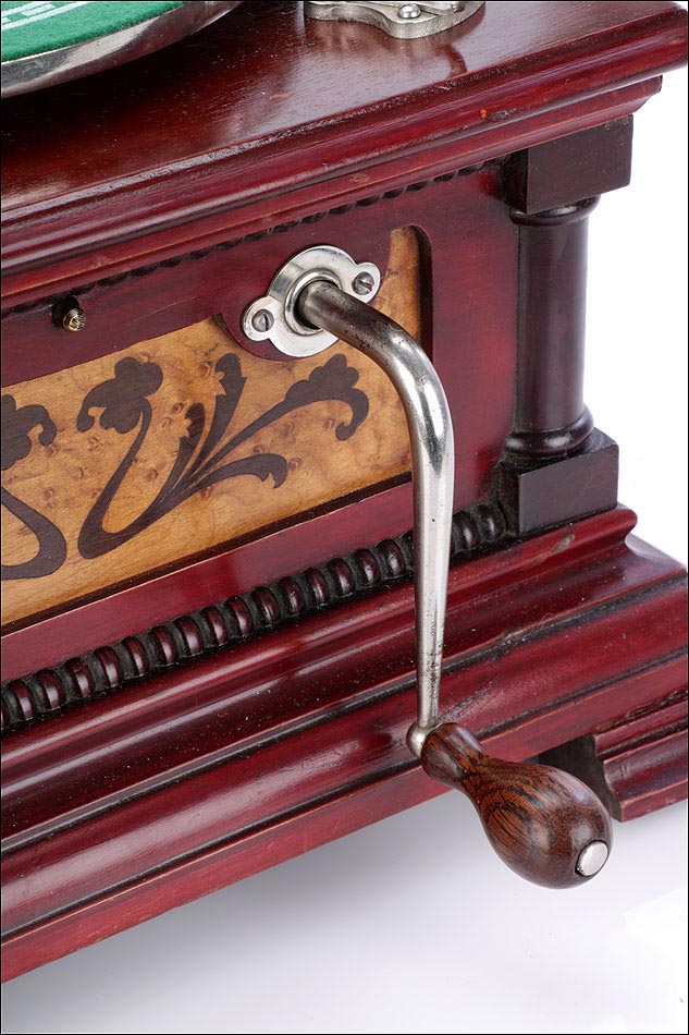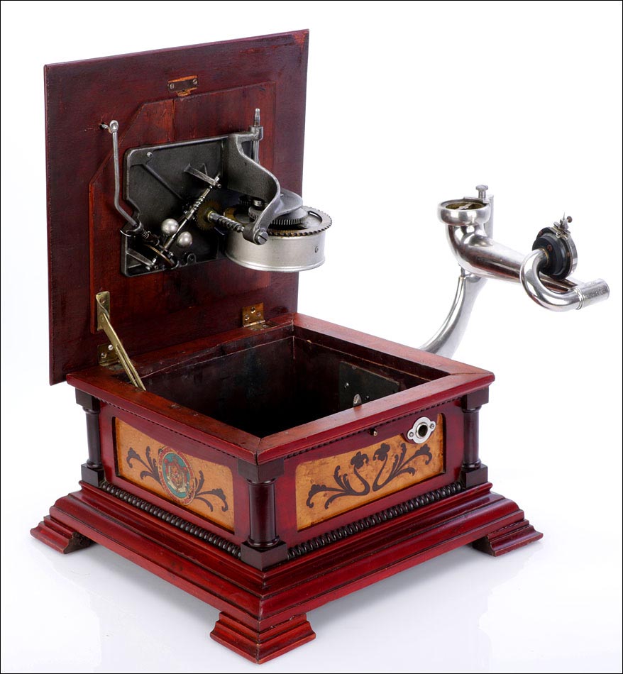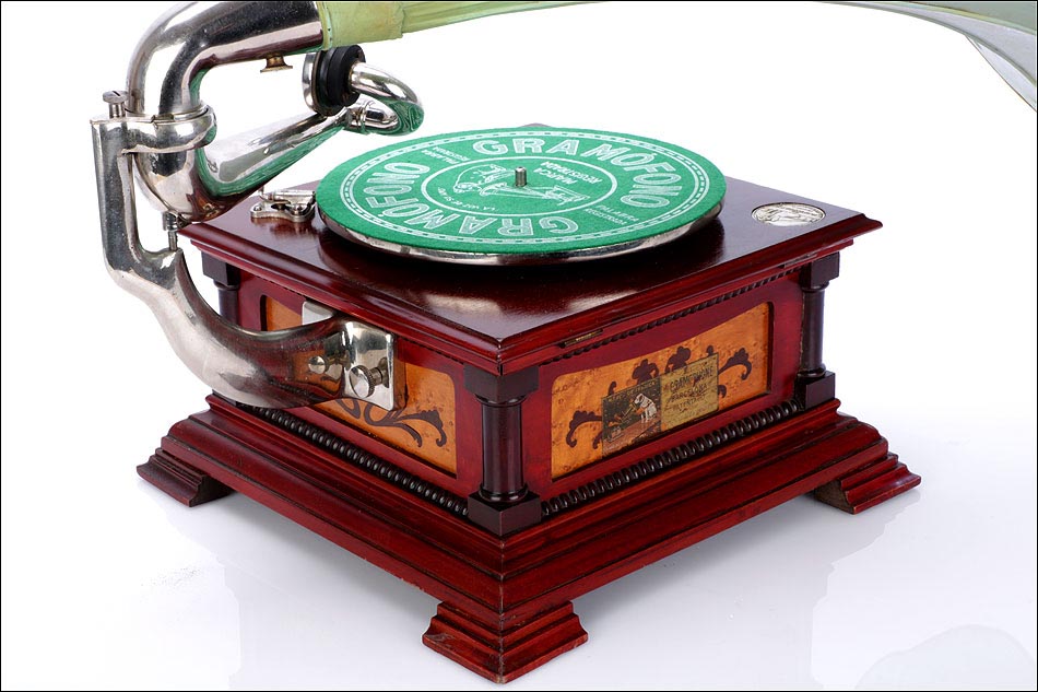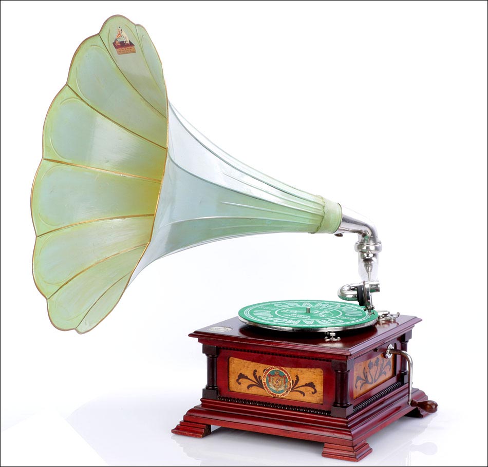 Impresionante gramófono antiguo La Voz de Su Amo modelo 5, fabricado en España circa 1920 y en estupendas condiciones. La caja y la trompeta han sido restauradas al detalle; el esmalte que recubre esta pieza es totalmente original, con solo discretas reintegraciones muy bien realizadas. El motor del gramófono se ha limpiado y ajustado, de manera que a día de hoy el aparato funciona a la perfección. La caja es de madera de caoba maciza y lleva laterales con marquetería de madera de raíz y caoba. La madera está protegida por un hermoso barnizado a muñequilla artesano, que le aporta un brillo cálido y profundo.