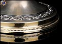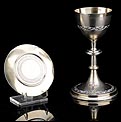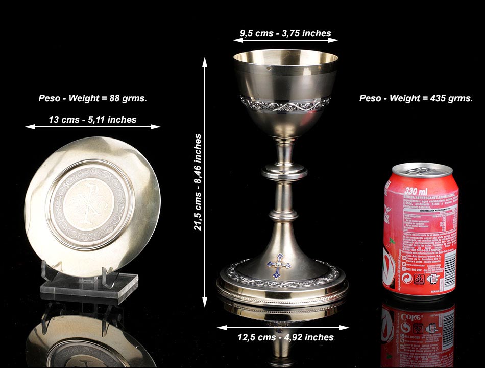 Medidas: Cáliz: Ancho de la Base: 12,5 cm. Alto: 21,5 cm. Ancho de la Copa: 9,5 cm. Peso: 435 g. Patena: Diámetro: 13 cm. Peso: 88 g.