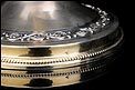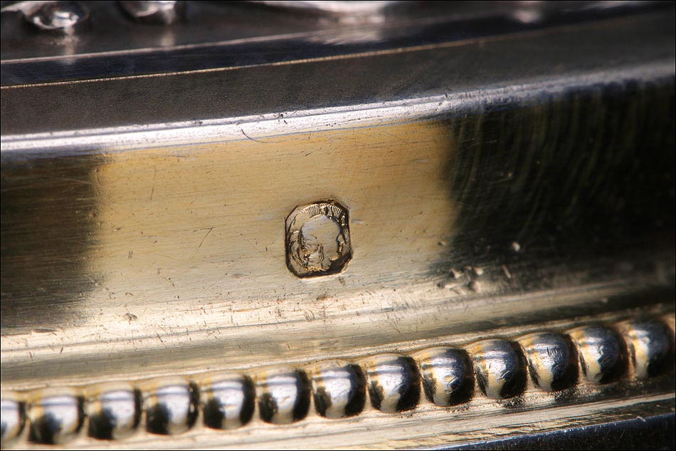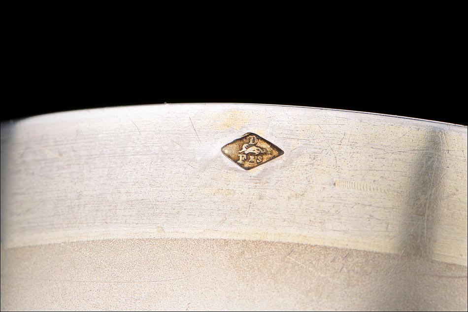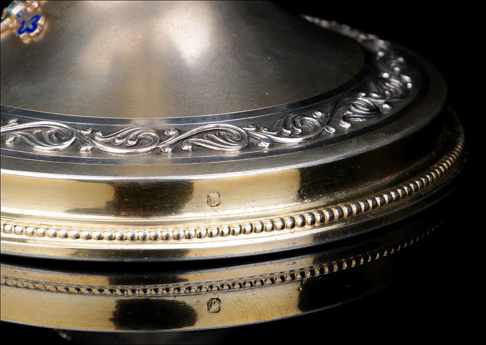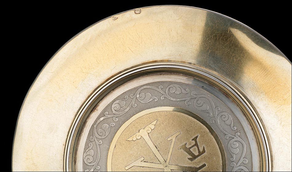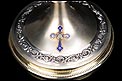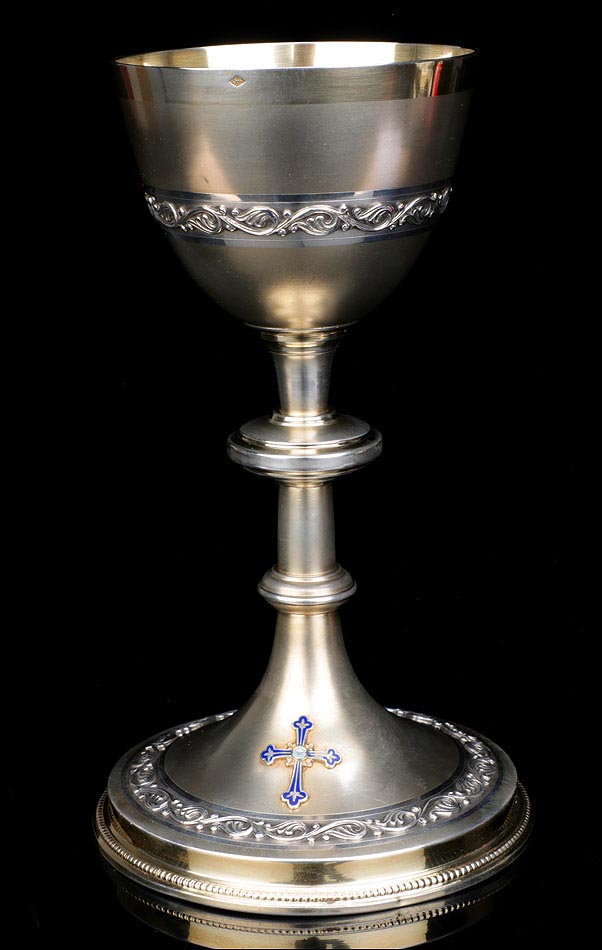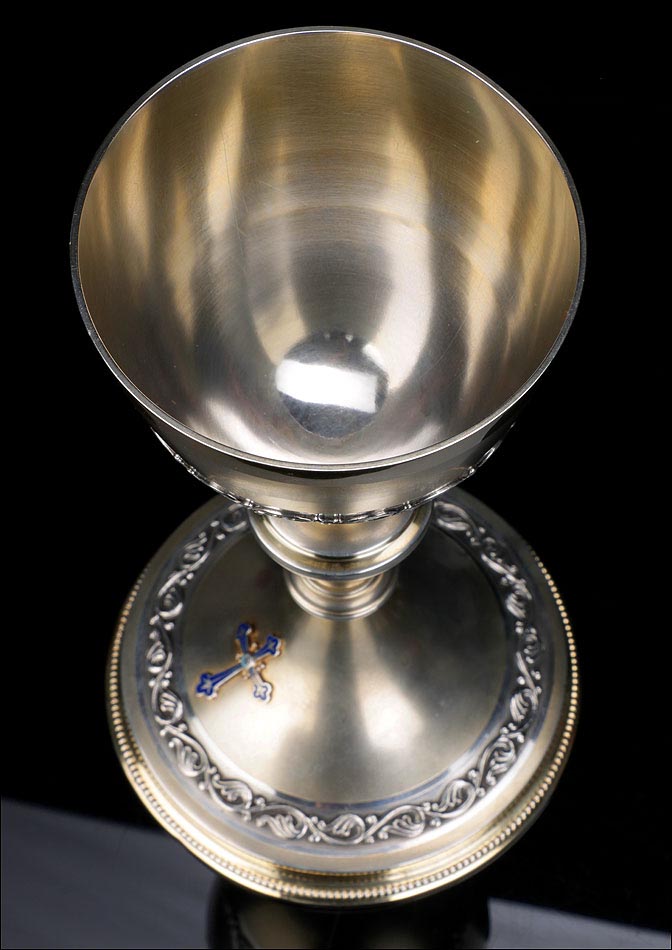 Delicado cáliz antiguo de plata maciza, decorado con sencillas cenefas grabadas a mano y una cruz esmaltada en azul en la base. El cáliz está hecho de plata al completo, algo que queda demostrado por los contrastes grabados en todas sus partes. Va acompañado de su patena, también de plata maciza contrastada; ambos artículos se presentan guardados en el estuche original de época. En el cáliz y la patena podemos distinguir el sello que marca la plata maciza francesa, con el perfil de la diosa romana Minerva, y el propio del platero que realizó el conjunto. En la patena, los contrastes aparecen grabados en el borde; en el cáliz, los podemos ver en el borde de la copa y en la base.