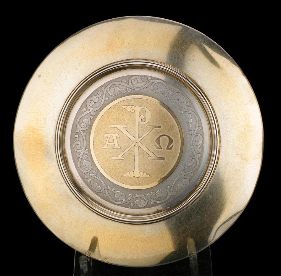La patena sigue un diseño clásico en este tipo de artículos. Combina zonas en plata lisa con otras en plata dorada. Lleva grabada una cenefa de volutas similar a las del cáliz, y en su centro aparece grabado el crismón (monograma que incluye las iniciales del nombre griego de Cristo y las letras alfa y omega, símbolos del principio y el final). Ambos artículos, cáliz y patena, se guardan en el estuche original que sirve también para su transporte. Con asa de latón y forro exterior de piel negra de imitación, el estuche está algo deteriorado por su exterior pero aún cumple perfectamente su función. En su parte superior podemos ver las letras E.P. impresas en dorado sobre el fondo negro.