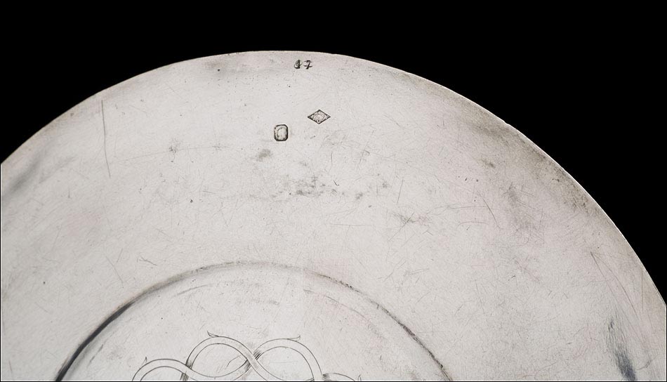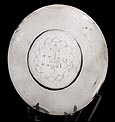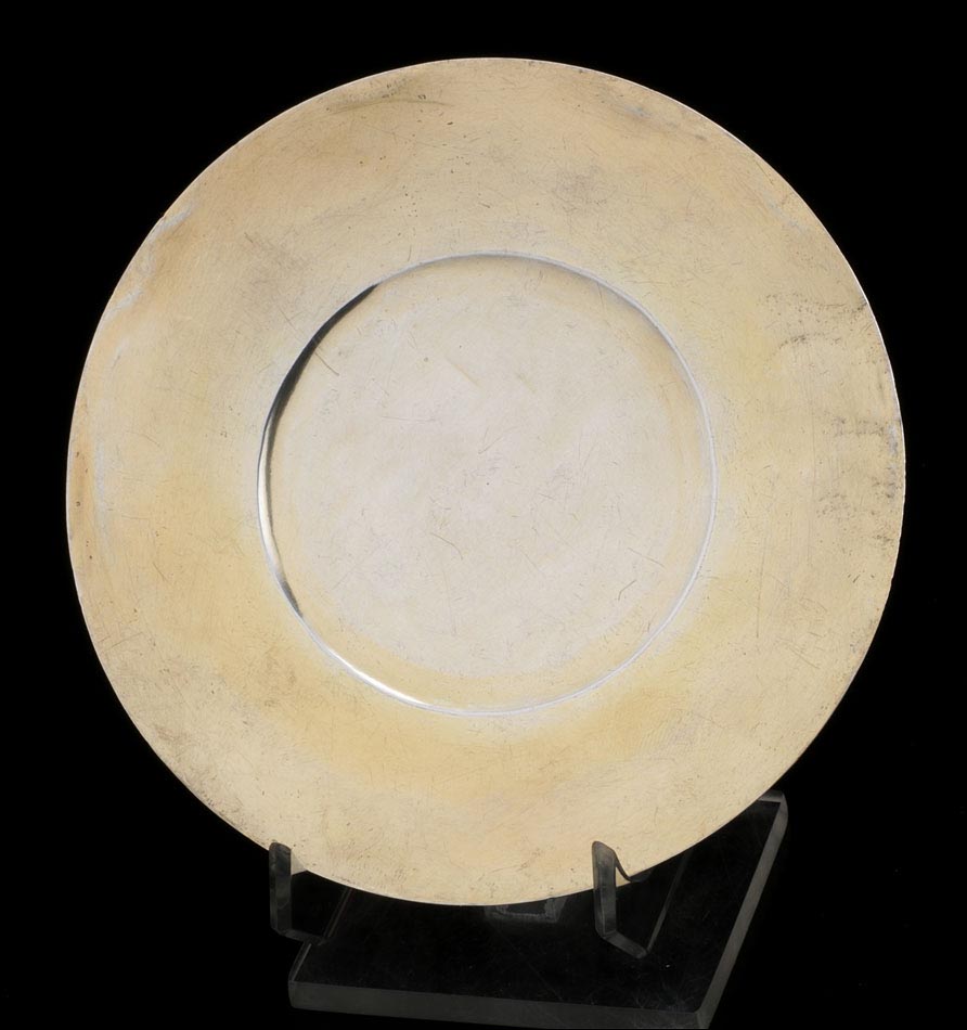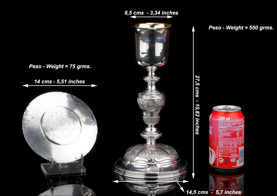 Medidas: Cáliz: Ancho de la Base: 14,5 cm. Alto: 27,5 cm. Ancho de la Copa: 8.5 cm. Peso: 550 g. Patena: Diámetro: 14 cm. Peso: 88 g.