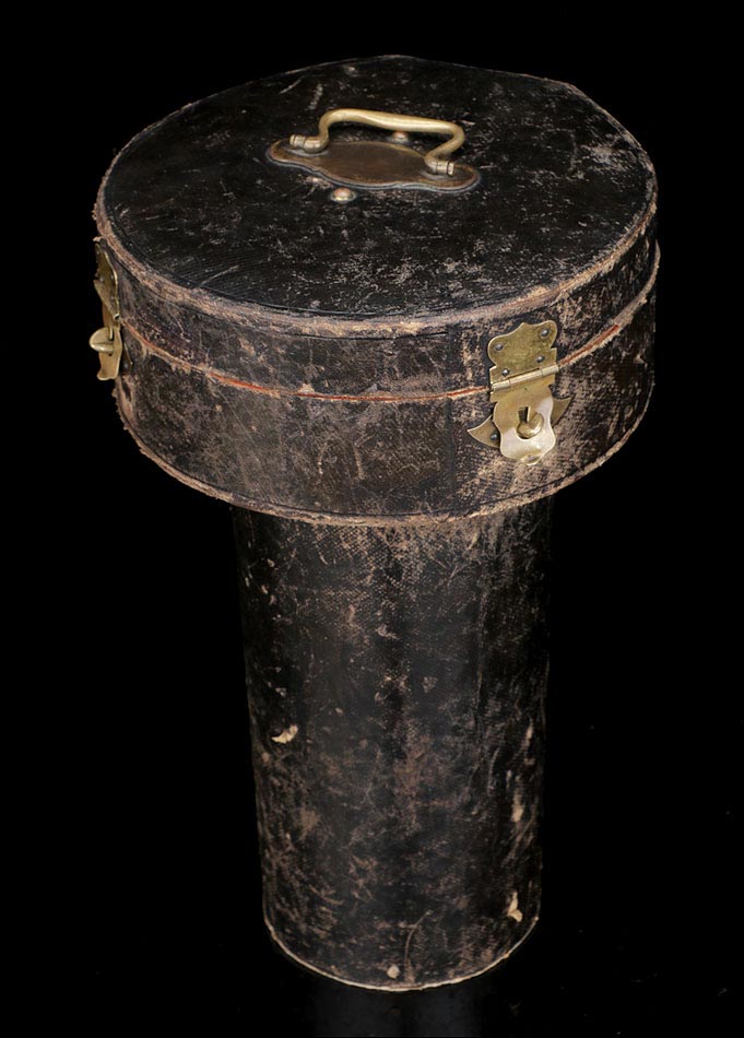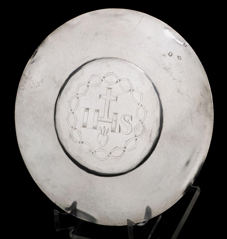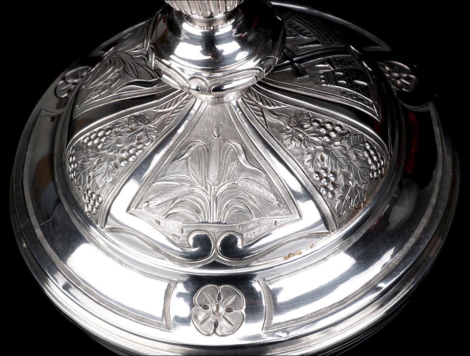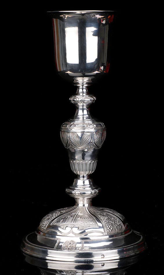 Llamativo cáliz antiguo de plata maciza acompañado de patena, ambos en su estuche original de época. El conjunto procede de Francia y está en muy buenas condiciones. De acuerdo con los contrastes que marcan el cáliz, este fue fabricado en Lyon entre los años 1819 y 1838. La patena es algo posterior, estando fechada a finales del siglo XIX. Ambas piezas destacan por la calidad de su plata y su bella decoración grabada, sobre todo el cáliz, una pieza de orfebrería religiosa realmente magnífica.