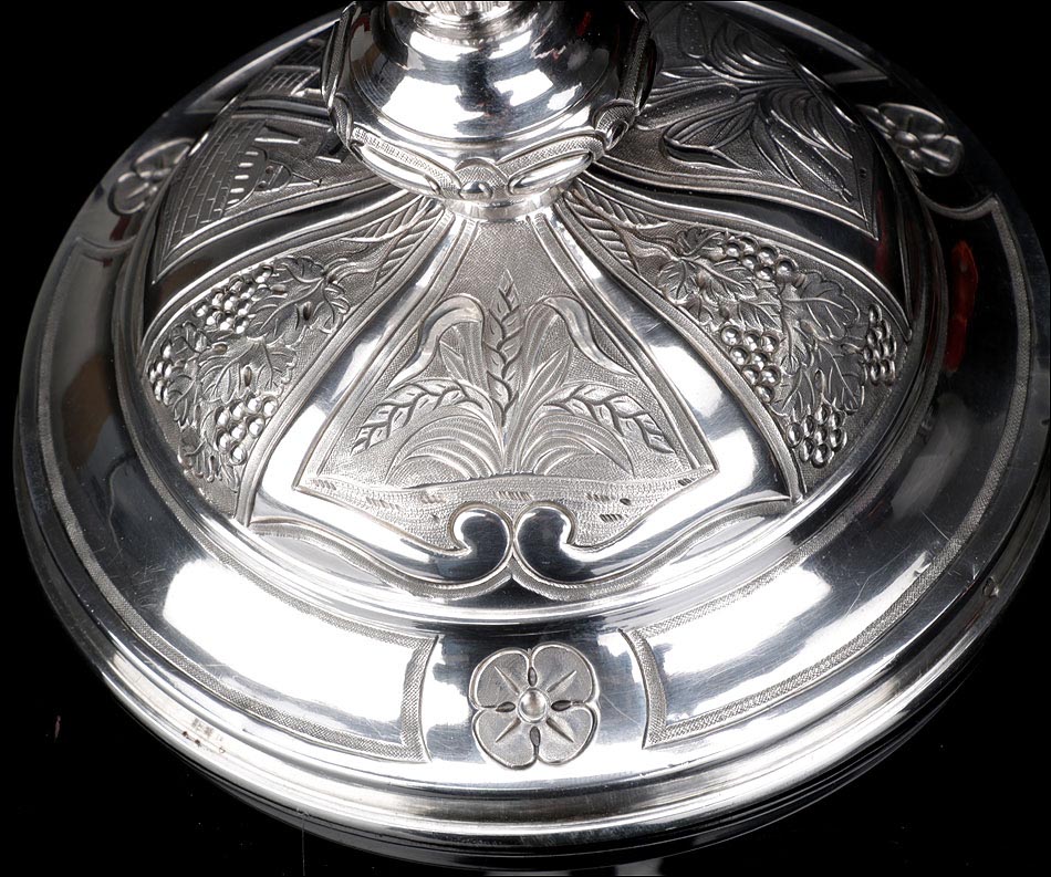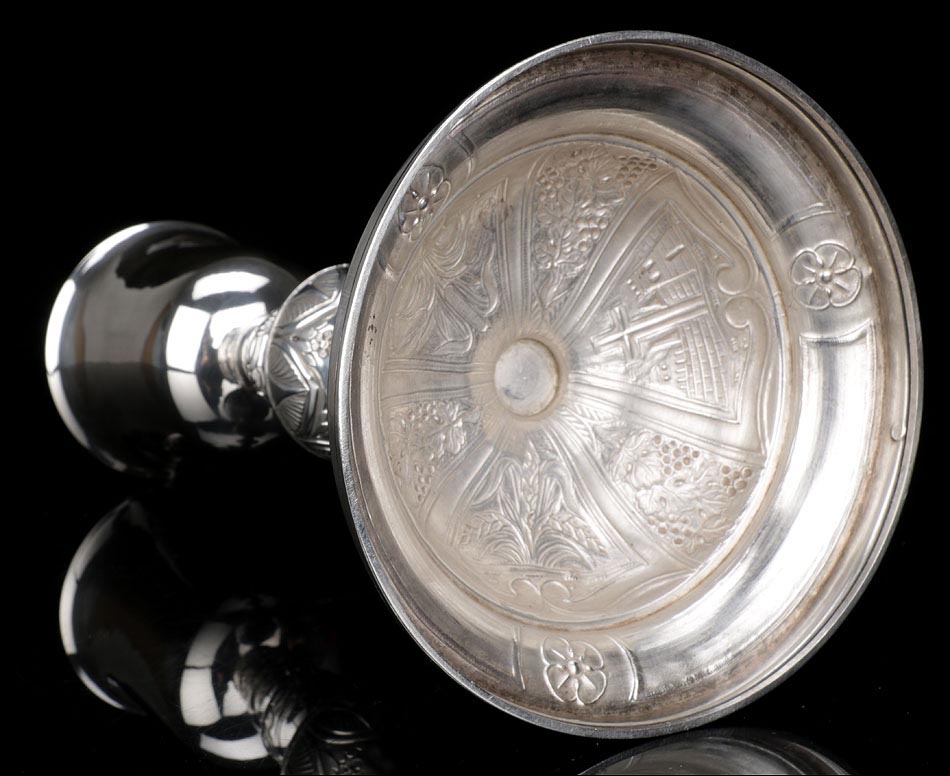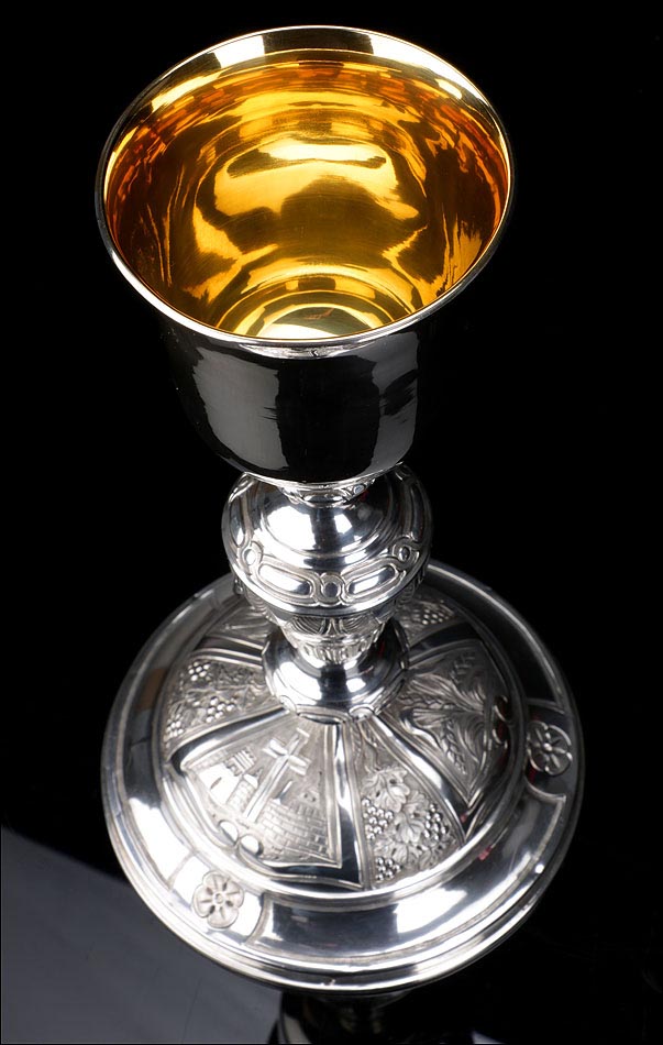 El cáliz lleva una amplia base circular que le aporta gran estabilidad. Aparte, el tamaño de la base le permite albergar una serie de motivos grabados llenos de encanto y delicadeza. El motivo central muestra el Monte de los Olivos con la cruz, delante de un paisaje esquemático con murallas y edificios. Los otros dos representan unas espigas de trigo y unos juncos, plantas relacionadas con la eucaristía y el cristianismo. Las imágenes se alternan con grabados de racimos de uva en la vid, símbolo del vino que contiene el cáliz durante la eucaristía.