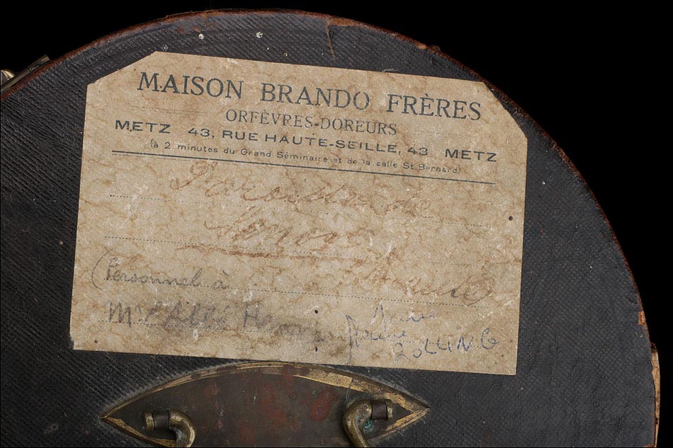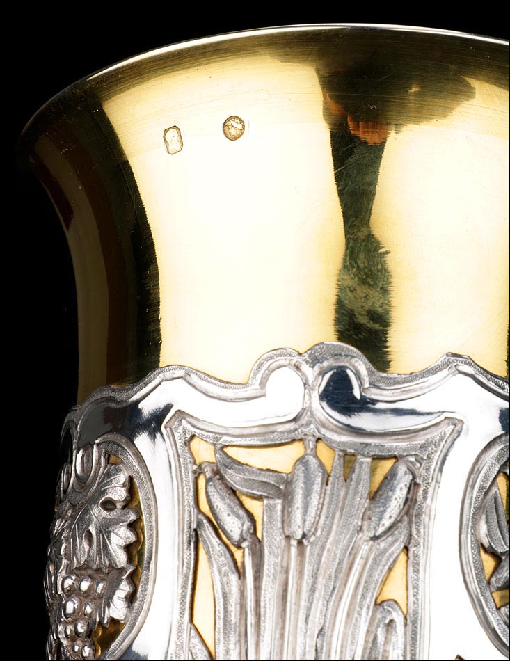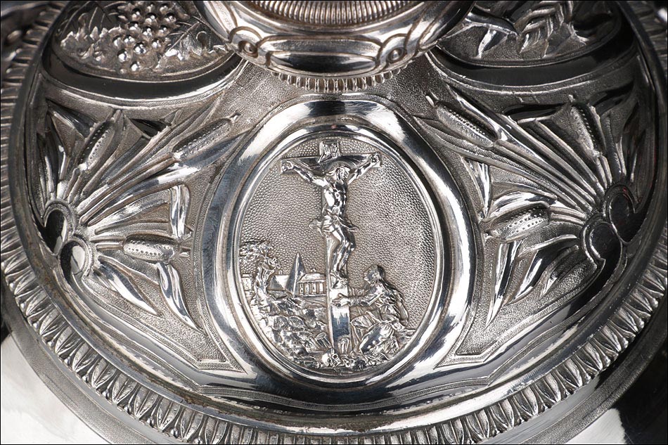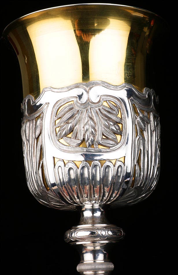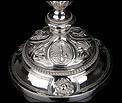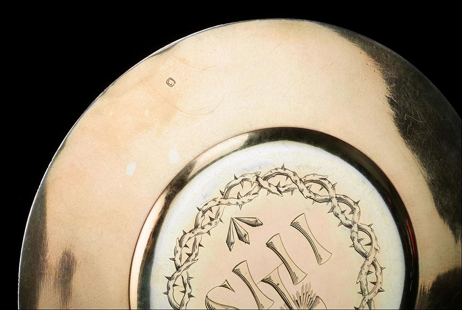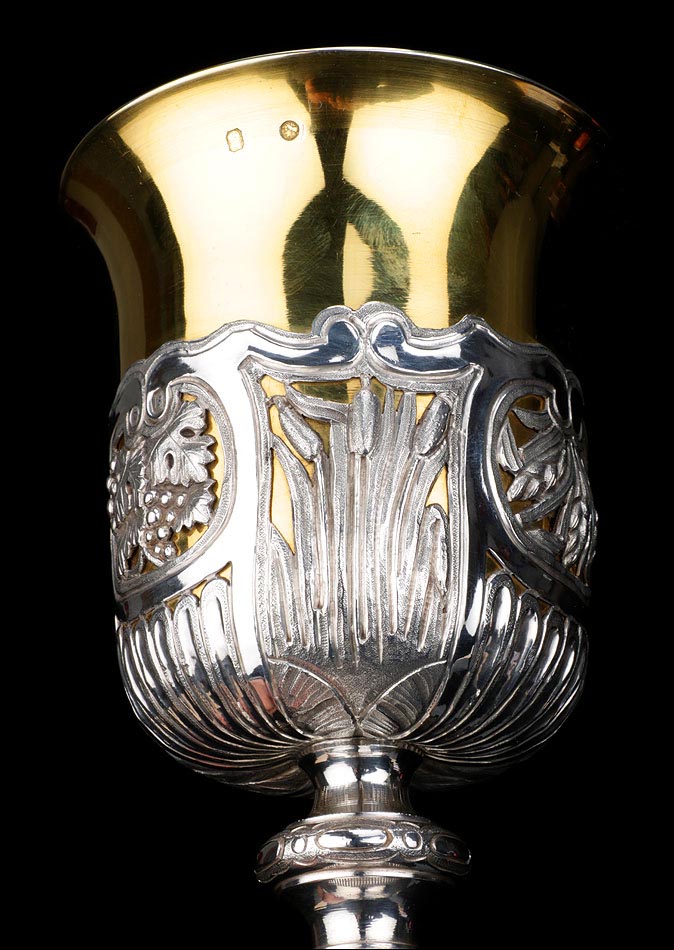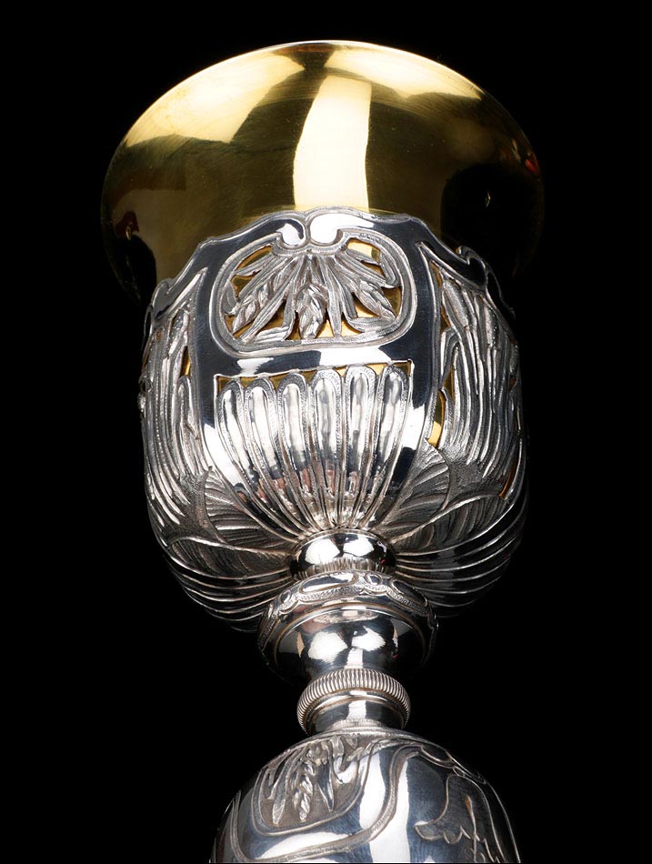 Coronando la pieza se alza la copa de plata dorada, soportada por la base calada que se une al tallo del cáliz. La base de la copa repite los motivos decorativos alegóricos de la base y el nudo del tallo. La patena de plata dorada está grabada con el clásico acrónimo IHS, la corona de espinas y el Sagrado Corazón. El estuche de guardado, por su parte, es antiguo y conserva una etiqueta de papel con la dirección del establecimiento donde se compró el cáliz e inscripciones manuscritas.