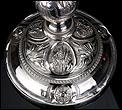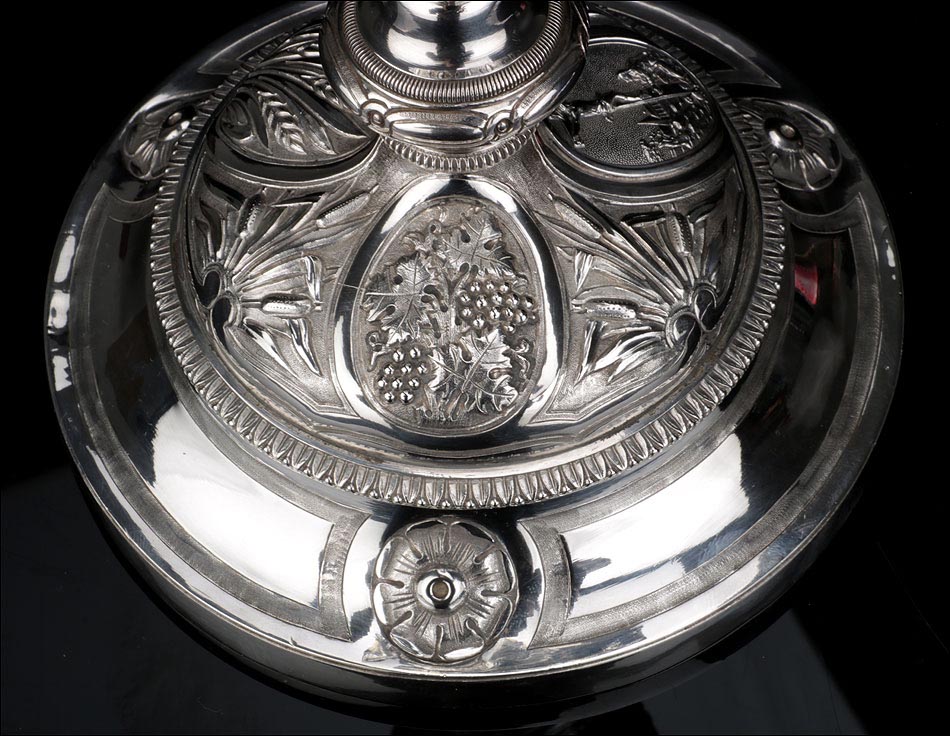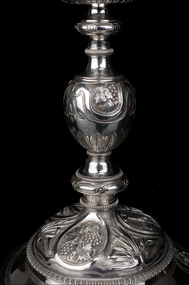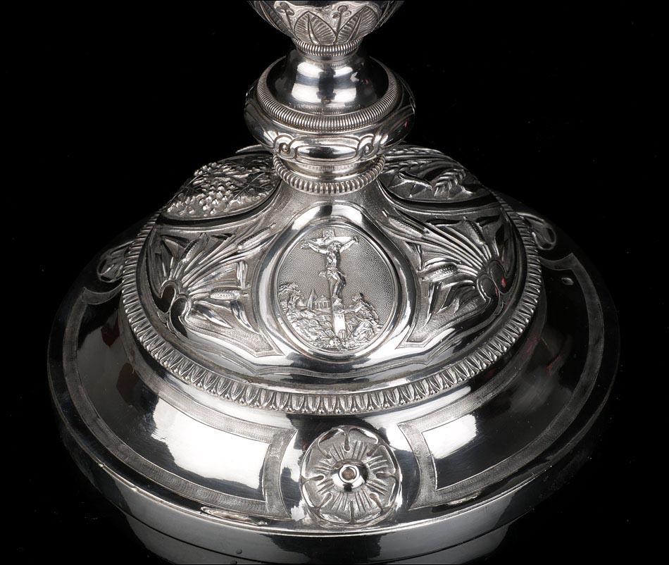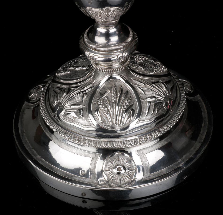 La base del cáliz es circular. Su borde está decorado por cuatro flores grabadas, separadas del resto de la pieza por una cenefa sencilla. Entre la cenefa y el tallo podemos ver una escena de la Crucifixión, con la Virgen María arrodillada a los pies de Jesucristo. Las otras dos imágenes muestran un ramo de espigas de trigo y unos racimos de uva, símbolos del pan y el vino de la eucaristía. La escena de la Crucifixión es muy bella y delicada, habiendo sido cuidadosamente grabada con todo detalle. Entre las tres escenas podemos ver grupos de juncos, planta que simboliza a los fieles cristianos “que beben de las aguas de la Iglesia”. El nudo que adorna el tallo del cáliz muestra de nuevo imágenes de los juncos, las espigas y los racimos de uvas. En su parte inferior está decorado con una cenefa de hojas y flores esquemáticas, de inspiración medieval. Sobre él hay otro nudo más pequeño, decorado con una sencilla cenefa.