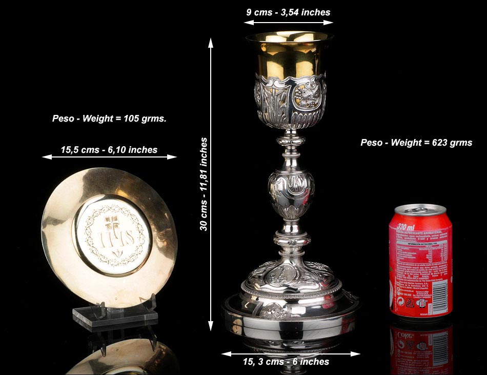 Medidas: Cáliz: Ancho de la Base: 15,3 cm. Alto: 30 cm. Ancho de la Copa: 9 cm. Peso: 623 g. Patena: Diámetro: 15,5 cm. Peso: 105 g.