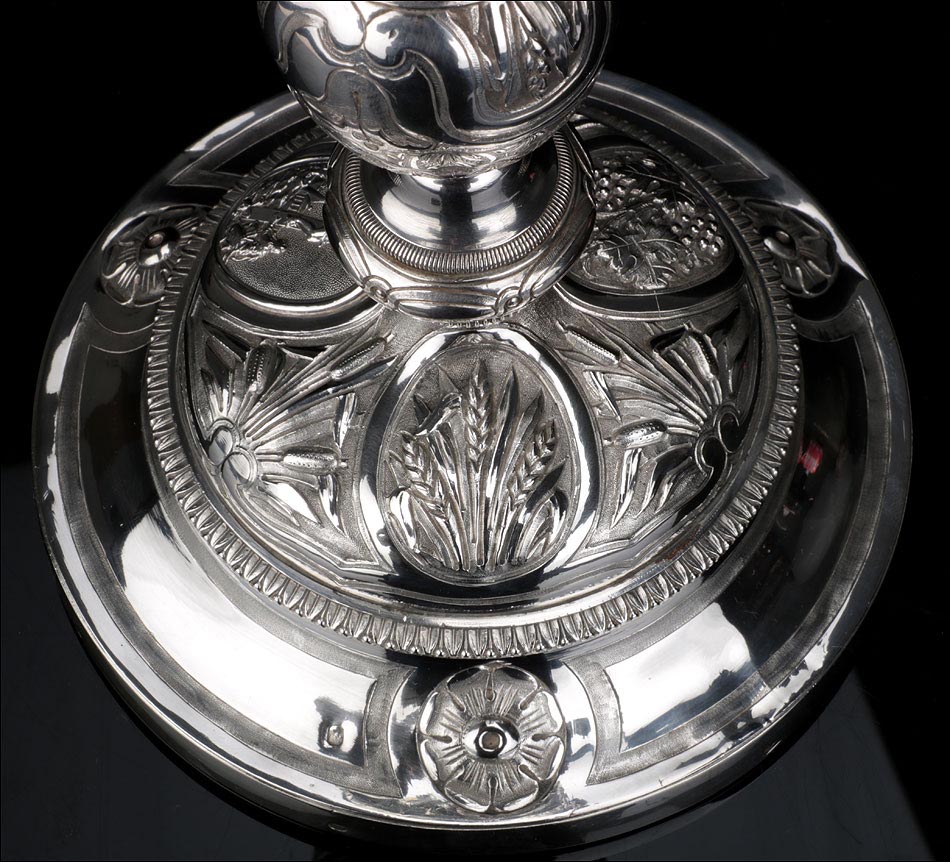 Bello y antiguo cáliz de plata maciza con contrastes, fabricado en París, Francia a principios de siglo XIX (según los contrastes, entre 1819 y 1838). El cáliz está en muy buenas condiciones y destaca por su bella decoración y su calidad. Muestra un diseño clásico y estilizado, con una elaborada decoración que combina simbología religiosa y una escena del Nuevo Testamento. El cáliz se presenta con una patena de plata maciza dorada de factura posterior (hacia finales del siglo XIX). Ambas piezas se guardan en un estuche antiguo, diseñado especialmente para este tipo de conjuntos litúrgicos.