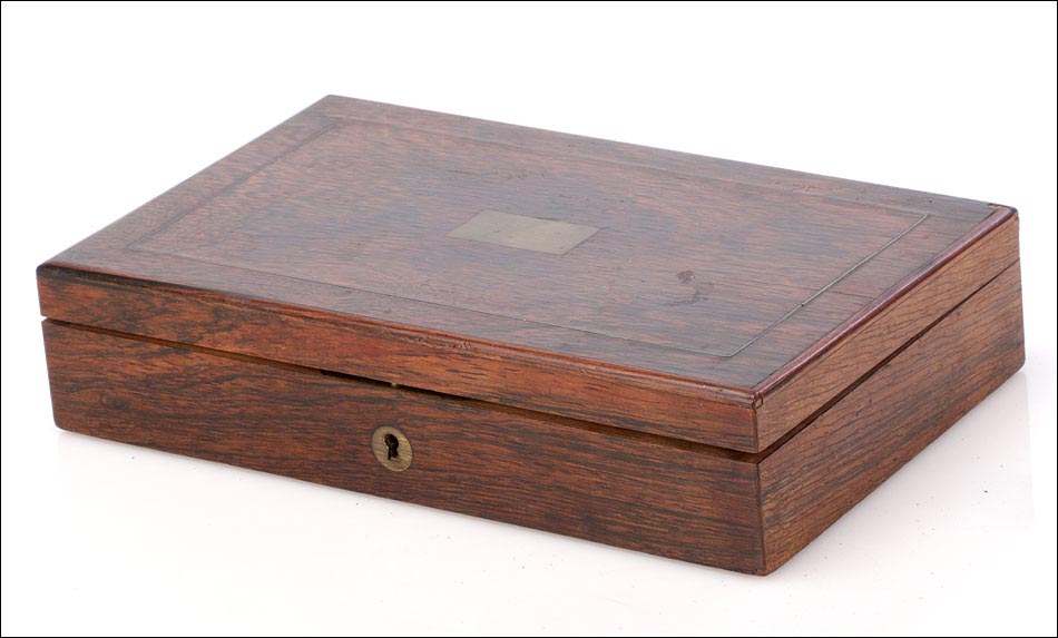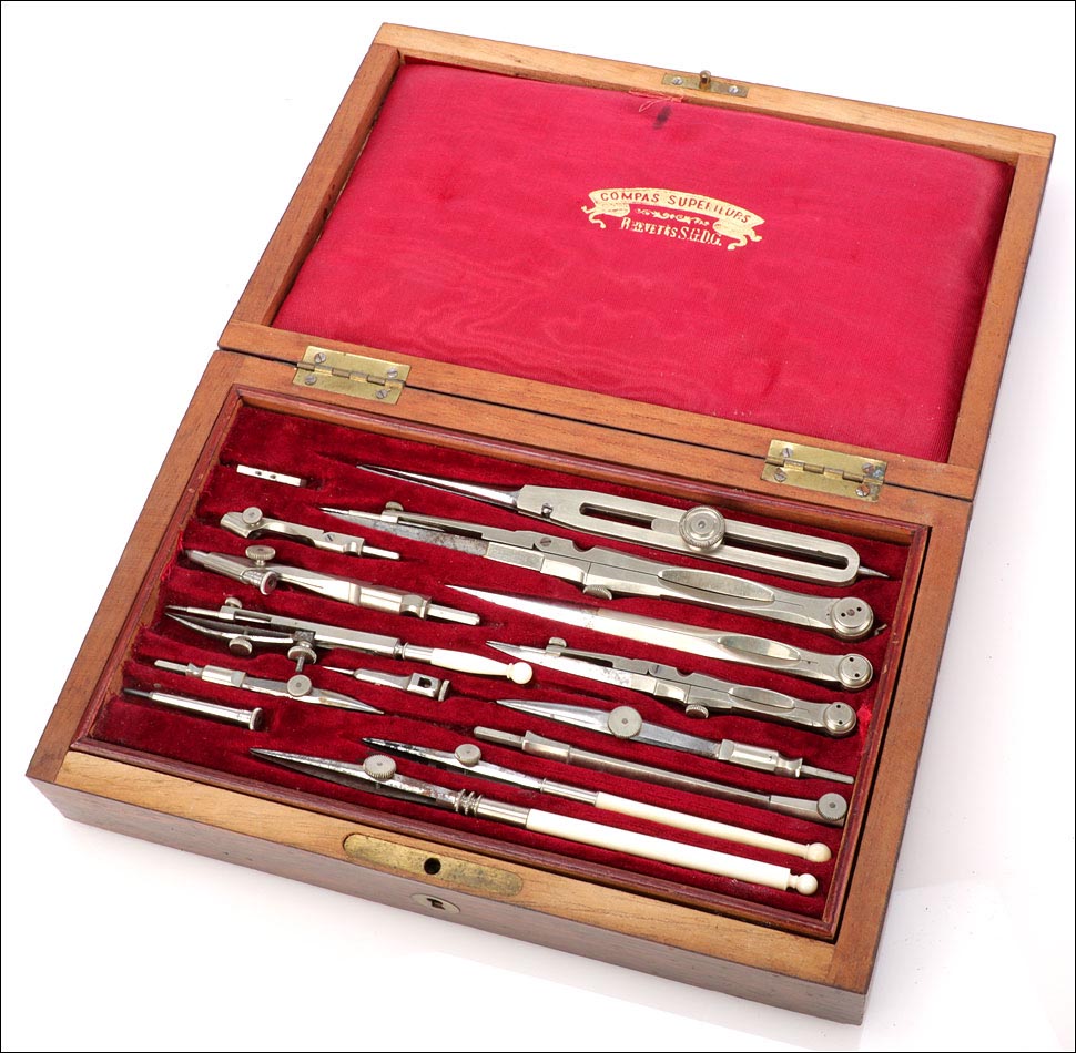 Bello estuche de compases antiguo para arquitecto o ingeniero, procedente de Francia y fechado circa 1900. En el estuche encontramos un completísimo set de utensilios de dibujo y delineación, en el cual no falta ni una sola pieza. El juego contiene tres compases, varios tiralíneas, una plantilla de curvas y varias puntas y accesorios. Los útiles son de acero y algunos de ellos llevan mangos de hueso, muy bien conservados. En el interior del estuche, una base forrada de terciopelo moldeada con las formas de los utensilios sirve para mantenerlos en su lugar. El terciopelo, de color rojo, también está muy bien conservado. El estuche en sí es de madera de palisandro maciza, una especie que destaca por su tono castaño oscuro y bellísima veta negra. En la tapa hay una placa de latón rectangular encastrada en el centro, destinada a grabar el nombre del propietario del juego de útiles. La caja está muy bien conservada; en el interior de la tapa, el forro acolchado de moaré rojo lleva impresa la inscripción COMPAS SUPERIEURS en letras doradas.