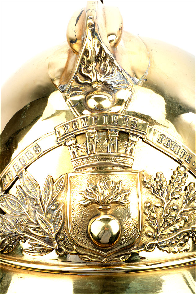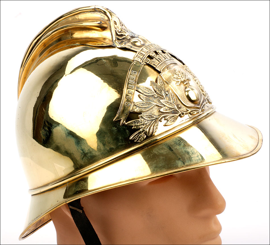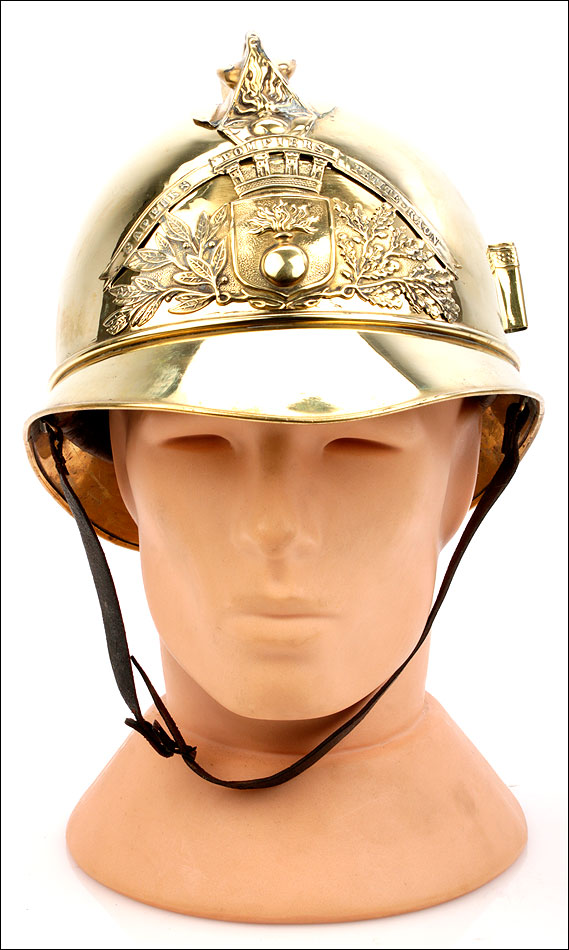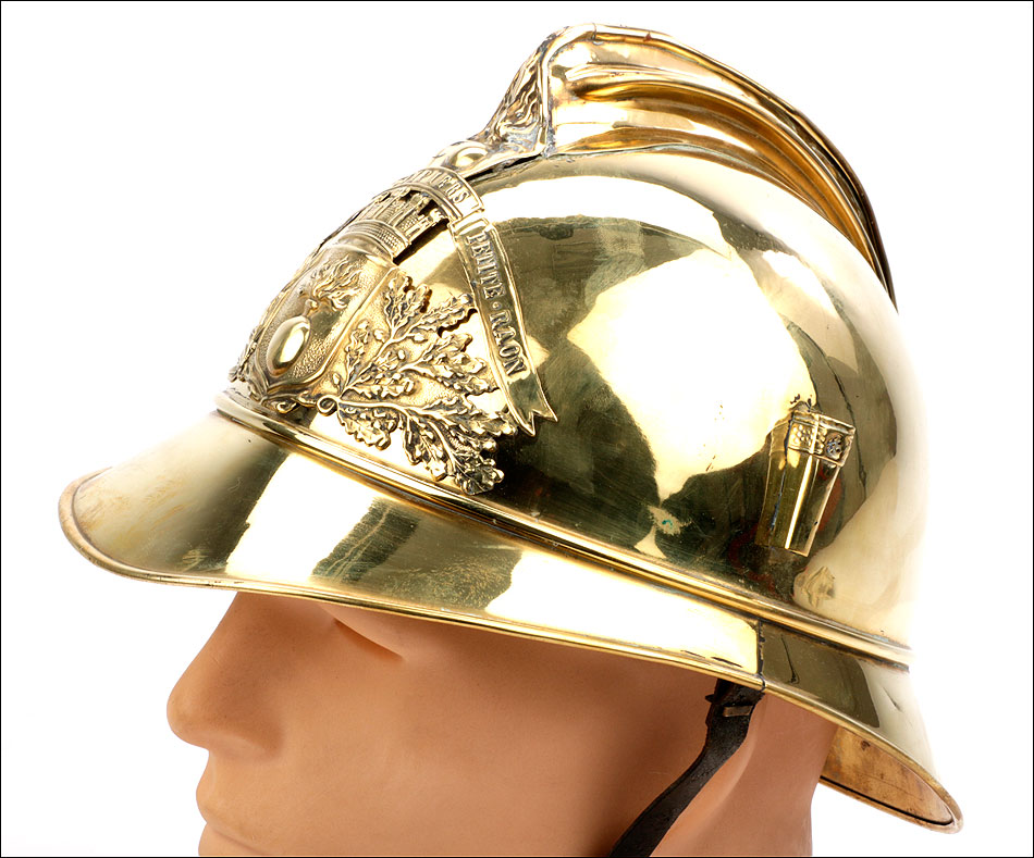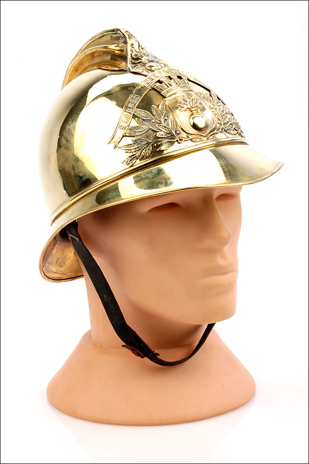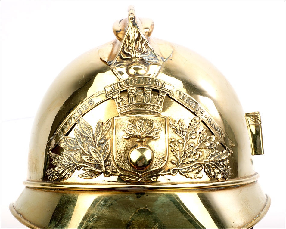 Precioso casco de bomberos francés de gran antigüedad, maravillosamente conservado y de gran potencial decorativo. El casco pertenece al cuerpo de bomberos de la ciudad francesa de Petite Raon y está fechado circa 1890. Su estado de conservación es prácticamente impecable: fabricado en latón pulido, no presenta desperfectos, abolladuras ni signos de óxido que pudieran desmerecer su aspecto. En la parte delantera, sobre la visera el casco está adornado con un aplique de latón que representa un escudo sobre unas ramas con hojas. En el escudo podemos ver una botella esférica de cuya boca salen llamas (una bomba); encima aparece una muralla con cuatro torres. Sobre este conjunto hay una banda con la inscripción SAPEURS POMPIERS PETITE RAON (Cuerpo de Bomberos de Petite Raon). Encima de la banda podemos ver de nuevo la imagen de la bomba con llamas, esta vez grabada en relieve en el propio casco. El artículo conserva la correa de ajuste, de cuero y con la hebilla de metal, y el revestimiento interno diseñado para poder encajar el casco a la cabeza con comodidad.