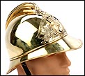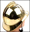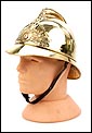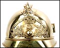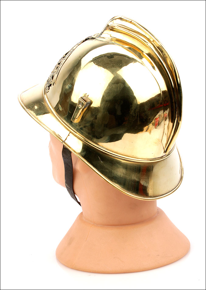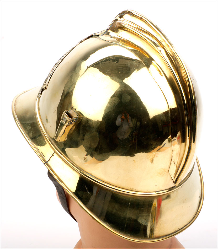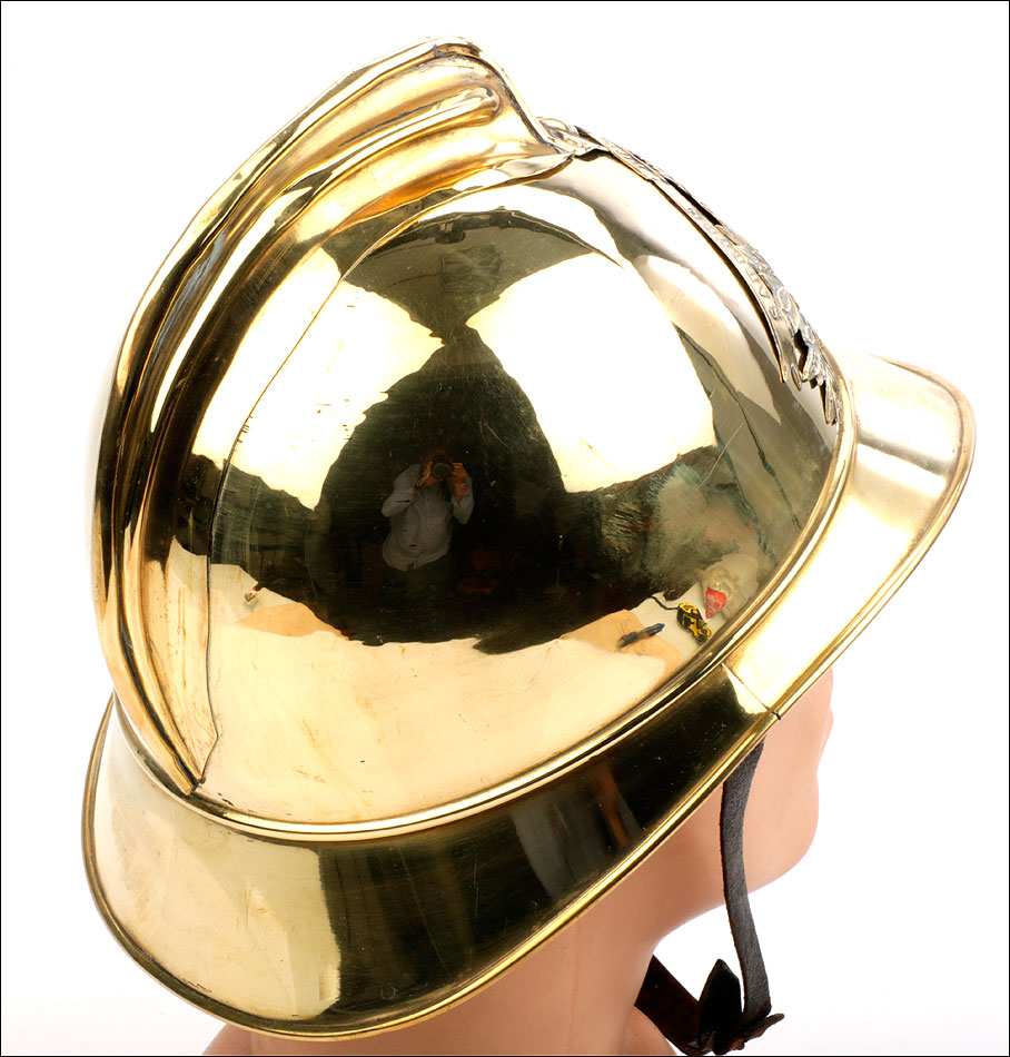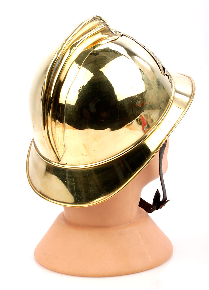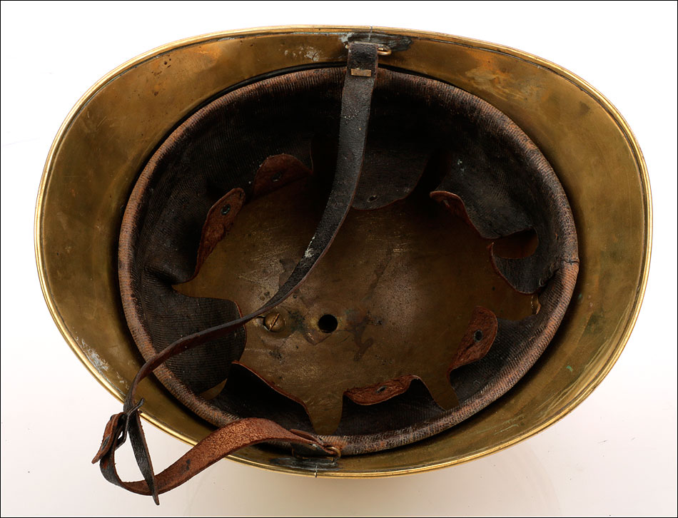 Precioso casco de bomberos francés de gran antigüedad, maravillosamente conservado y de gran potencial decorativo. El casco pertenece al cuerpo de bomberos de la ciudad francesa de Petite Raon y está fechado circa 1890. Su estado de conservación es prácticamente impecable: fabricado en latón pulido, no presenta desperfectos, abolladuras ni signos de óxido que pudieran desmerecer su aspecto. En la parte delantera, sobre la visera el casco está adornado con un aplique de latón que representa un escudo sobre unas ramas con hojas. En el escudo podemos ver una botella esférica de cuya boca salen llamas (una bomba); encima aparece una muralla con cuatro torres. Sobre este conjunto hay una banda con la inscripción SAPEURS POMPIERS PETITE RAON (Cuerpo de Bomberos de Petite Raon). Encima de la banda podemos ver de nuevo la imagen de la bomba con llamas, esta vez grabada en relieve en el propio casco. El artículo conserva la correa de ajuste, de cuero y con la hebilla de metal, y el revestimiento interno diseñado para poder encajar el casco a la cabeza con comodidad.