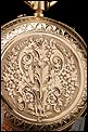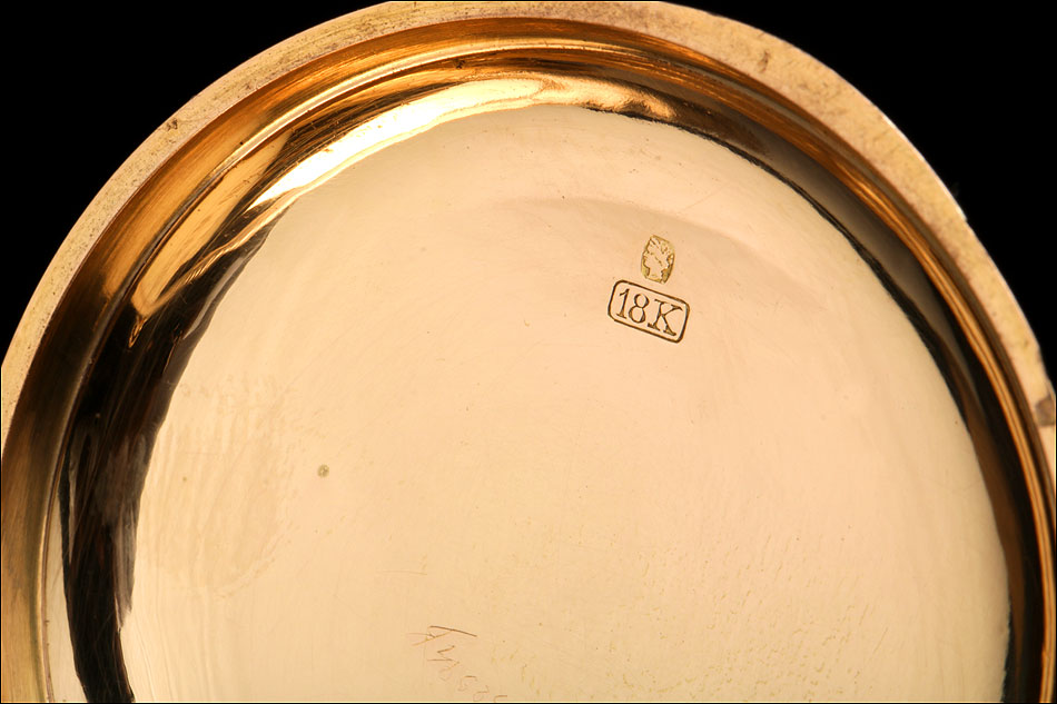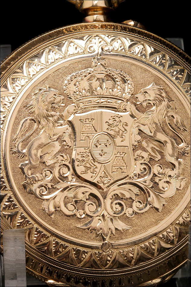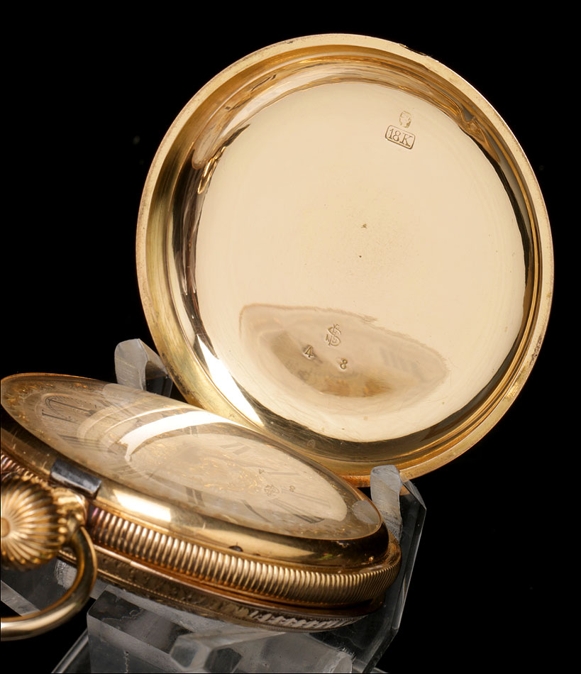 La caja de oro del reloj lleva tres tapas. Las tapas delantera y trasera llevan una hermosa decoración grabada a mano; en la delantera podemos ver el escudo del rey Alfonso XIII rodeado de una cenefa de formas triangulares. En su interior encontramos un contraste con una cabeza de mujer, el sello 18K (correspondiente al oro de 18 quilates), una marca con unas iniciales y los números 4 y 8. La tapa trasera está decorada con un precioso motivo de flores de disposición simétrica. En su interior encontramos los mismos contrastes que en la delantera, pero en este caso aparece el número de serie completo: 48048. Bajo la tapa delantera, la esfera de oro y plata aparece protegida por el panel de cristal original. Los números son romanos.
