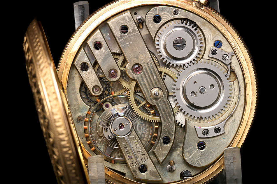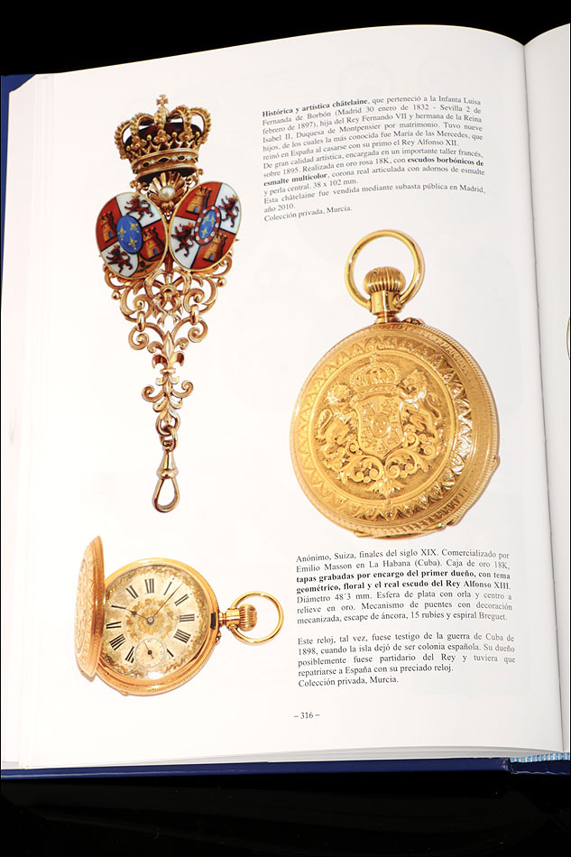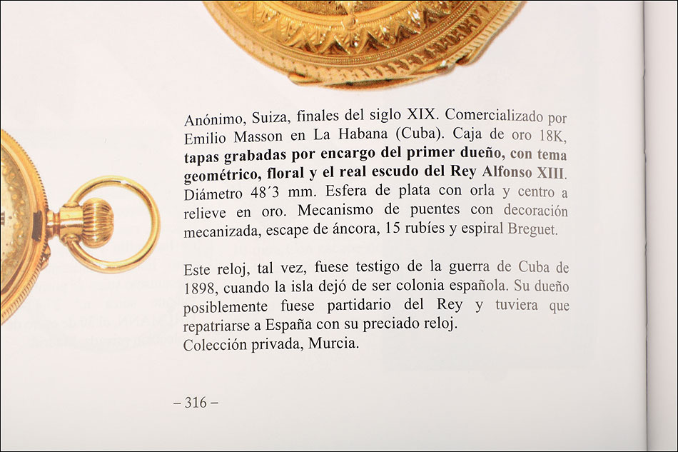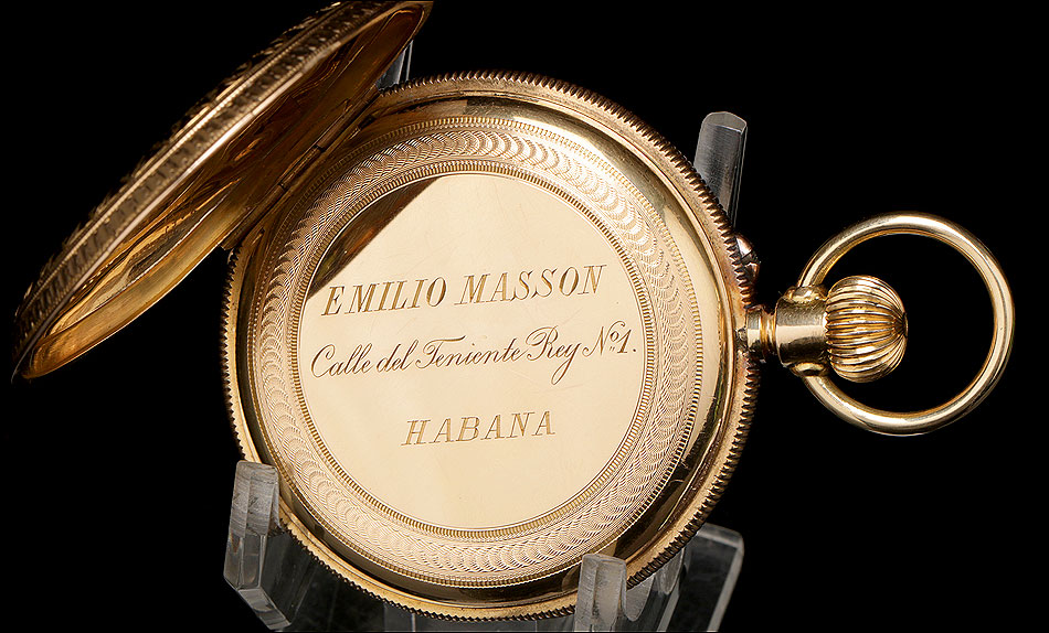 Bajo la tapa trasera encontramos la tapa guardapolvo de oro de 18K, con una inscripción grabada a mano: EMILIO MASSON – Calle del Teniente Rey Nº 1 – HABANA. Se trata con toda probabilidad del nombre y la dirección en La Habana del comercio que vendió el reloj. El detalle del escudo en la tapa delantera sugiere que el propietario era partidario del rey durante la Guerra de Cuba, y tuvo que regresar a España al terminar la contienda. El reloj aparece catalogado en el libro “Relojes de Bolsillo y Sus Mecanismos”, de Vicente Martín Sánchez. En el libro no se describe un reloj de bolsillo como éste, sino éste mismo. El libro no está incluido pero puede comprarse por Internet.