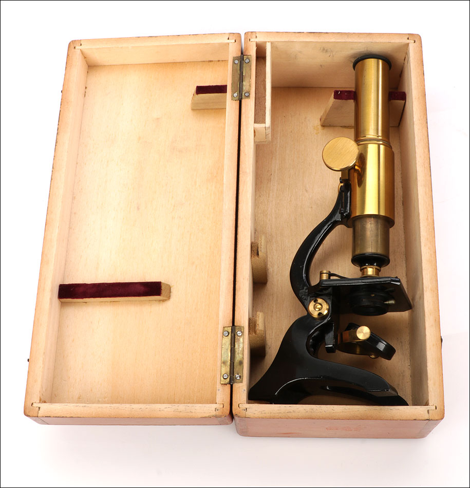Bonito microscopio antiguo de estudiante, fabricado a finales del siglo XIX o principios del XX (circa 1900). Este artículo se encuentra en excelente estado de conservación, con todas sus piezas y componentes originales de época. Además, presenta un funcionamiento correcto: la lente permite una visualización nítida de muestras y preparados, pudiéndose emplear como cuando fue fabricado, hace más de cien años. El microscopio se presenta en su estuche original de época, una sobria caja de madera maciza en buenas condiciones.