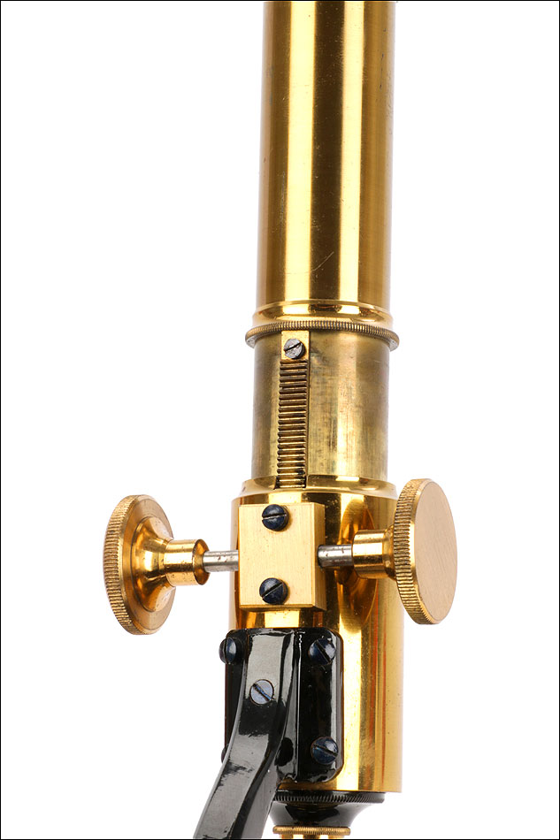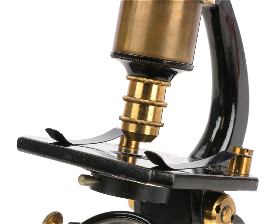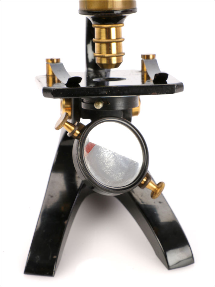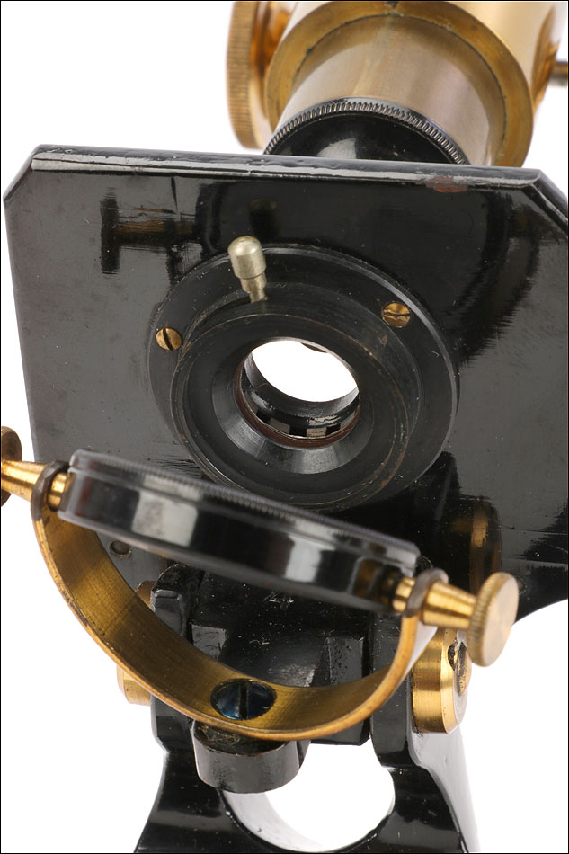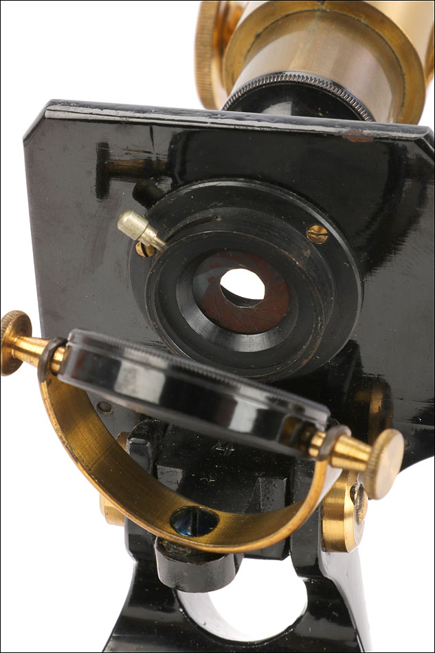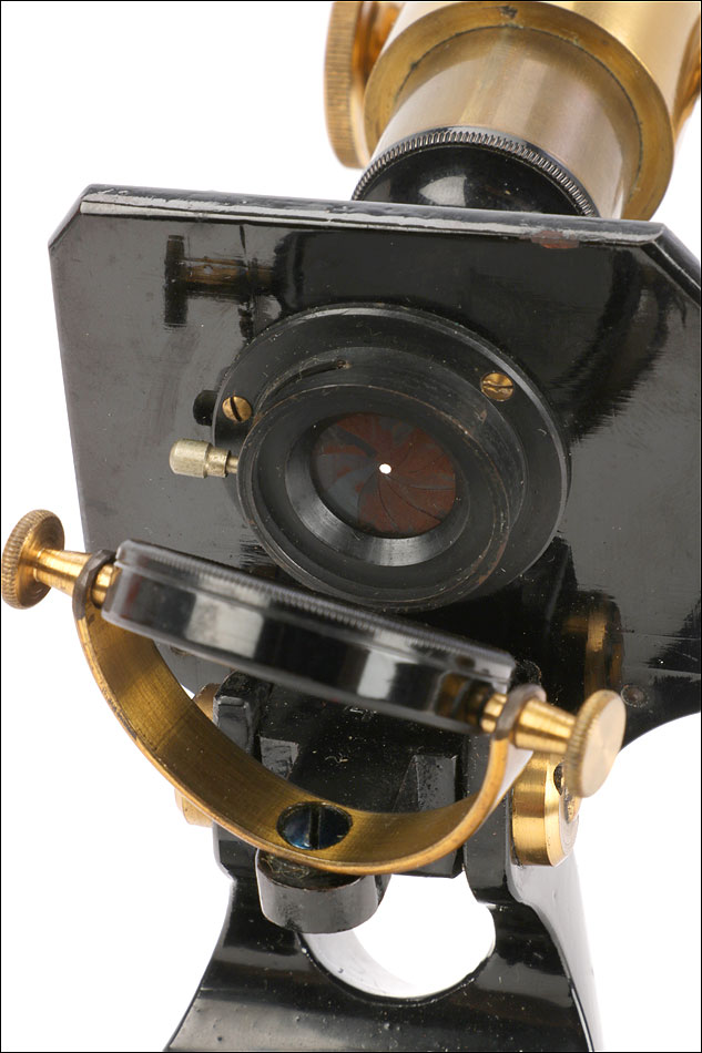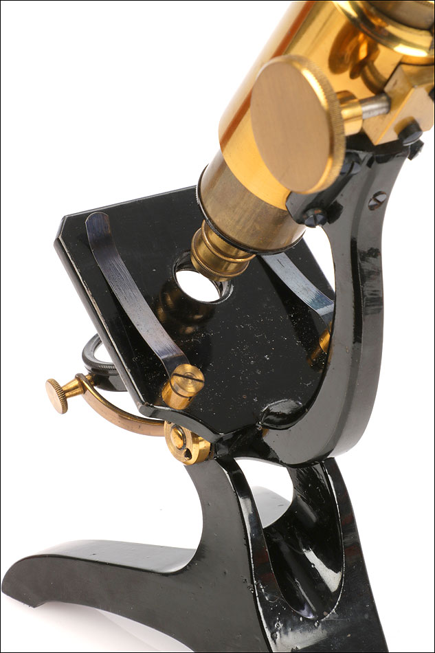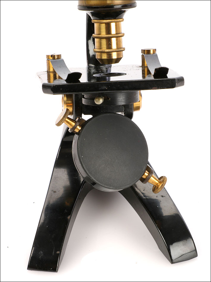 El pie del aparato es de hierro lacado en color negro. Consta de una parte trasera inclinada con dos patas delanteras que aportan estabilidad al microscopio. El acabado lacado negro está en magnífico estado, liso, regular y brillante. Sobre las patas vemos la pletina para muestras, y bajo ella, el espejo monofacial para conducir la luz hacia estas. En la parte trasera, una pieza curva también lacada se conecta a la torre de latón. El metal dorado aparece también muy bien conservado, sin rastros de óxido y preservando aún el barniz transparente original que protege su superficie y le aporta una preciosa pátina.